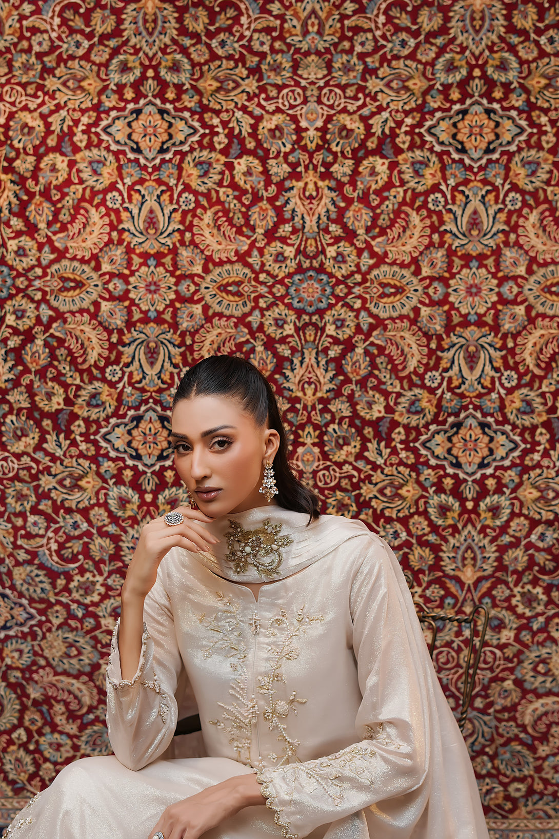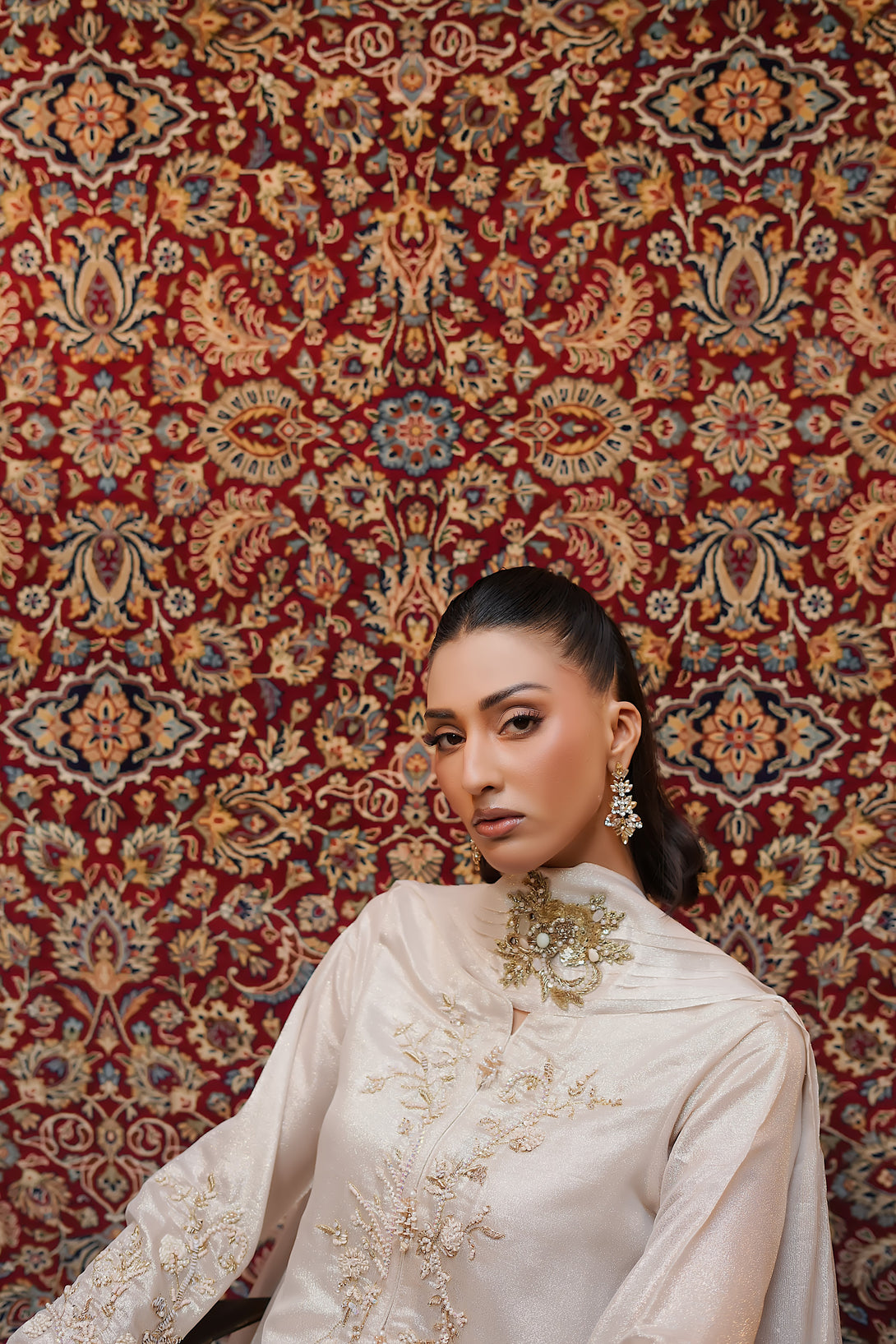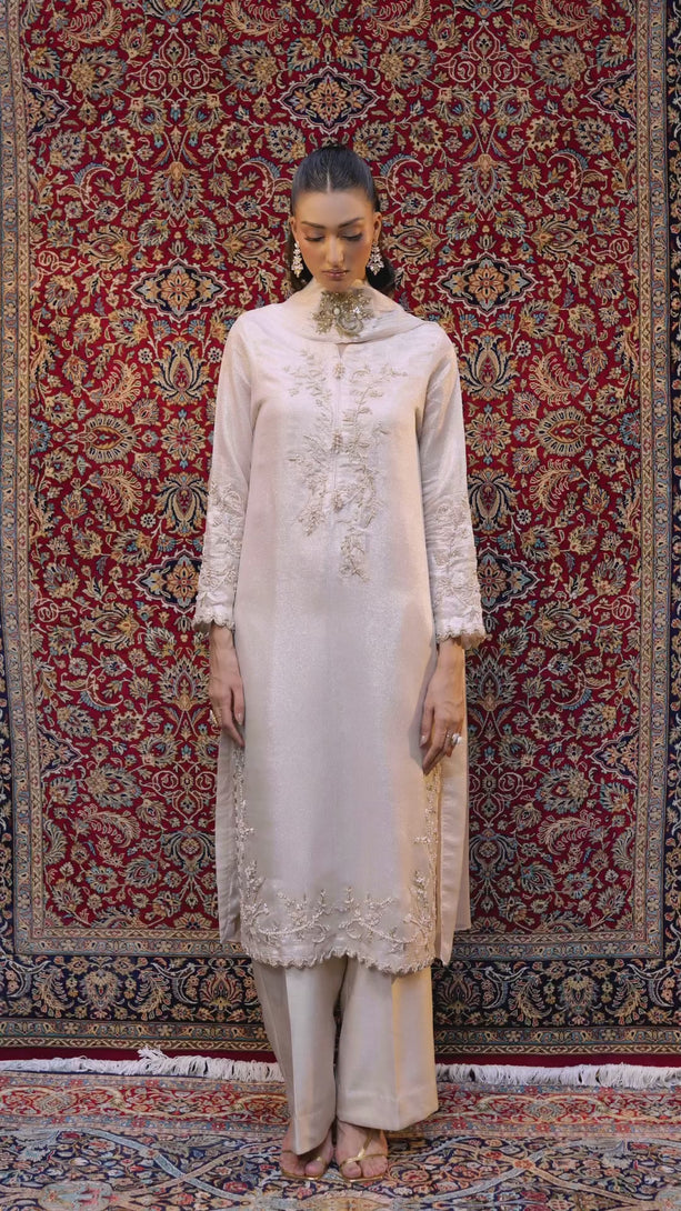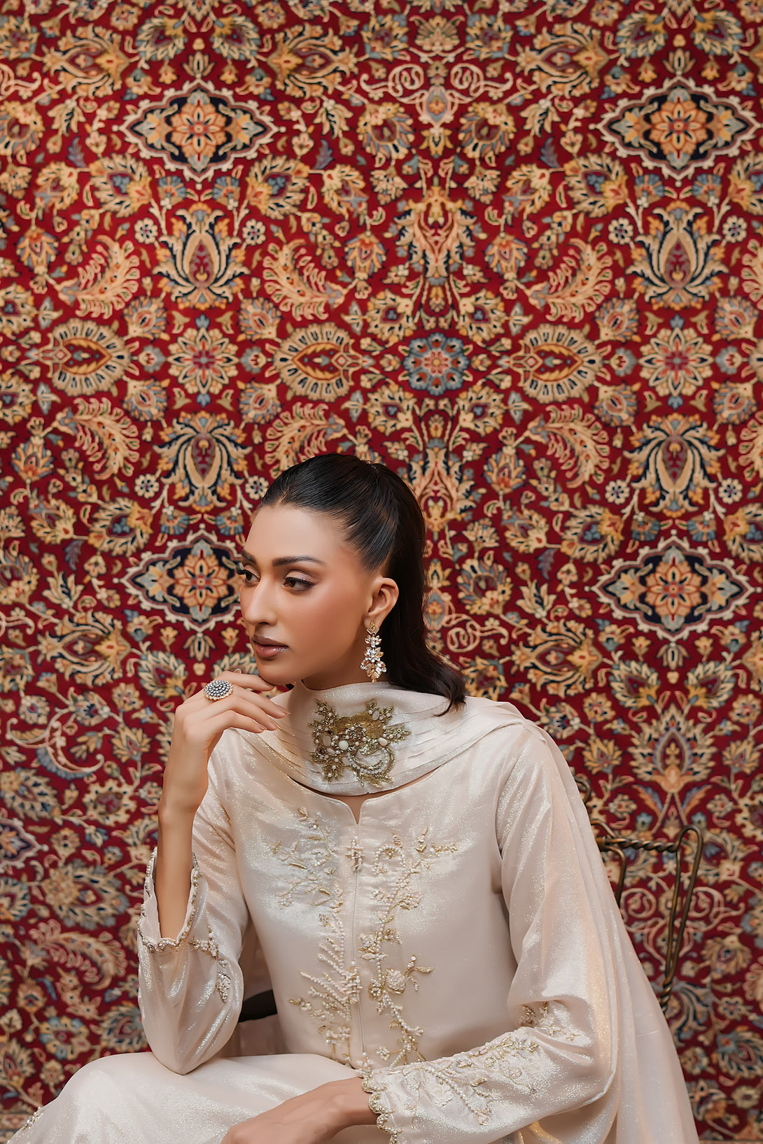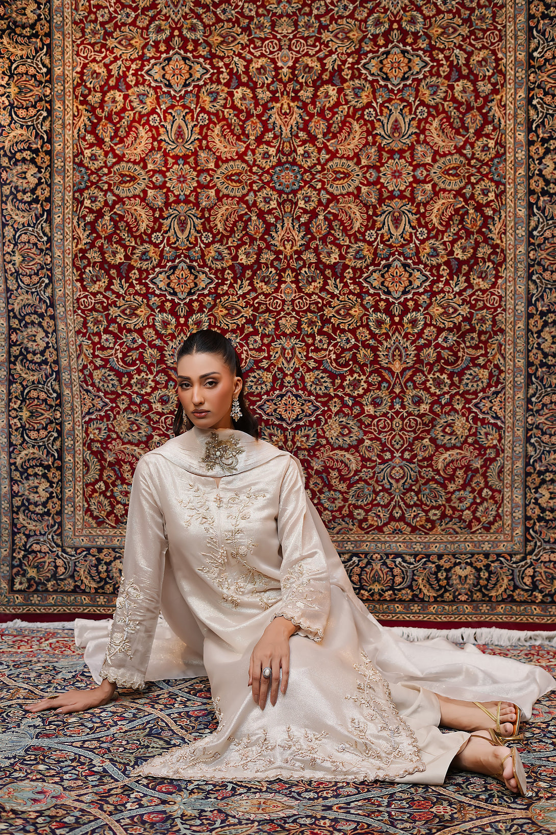 An ethereal ensemble crafted in pure chiffon lamé, delicately hand-embroidered with sequins, beads, and zardozi. The look is elevated with a pleated dupatta and a signature jewel motif that adds timeless elegance. Paired with Korean raw silk pants and lined with medium silk, Mah-e-Noor captures classic refinement and lunar radiance in every detail.