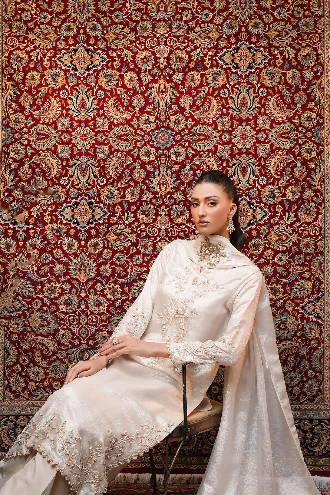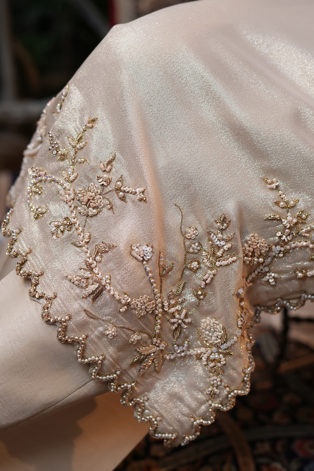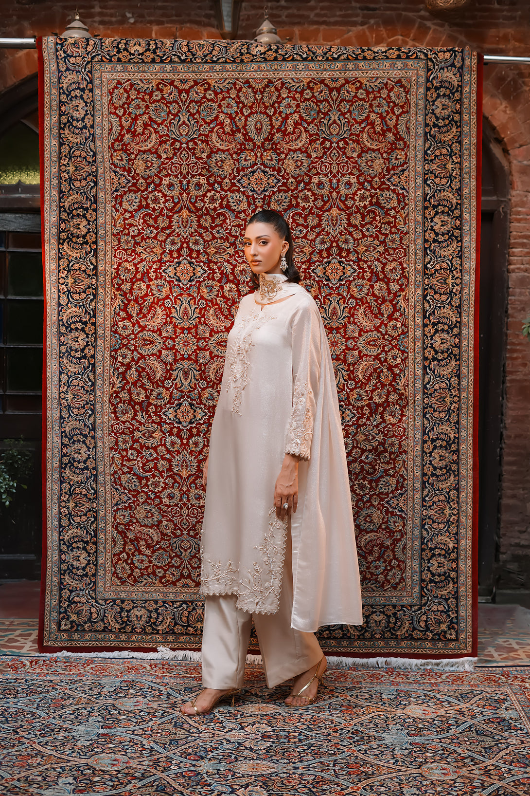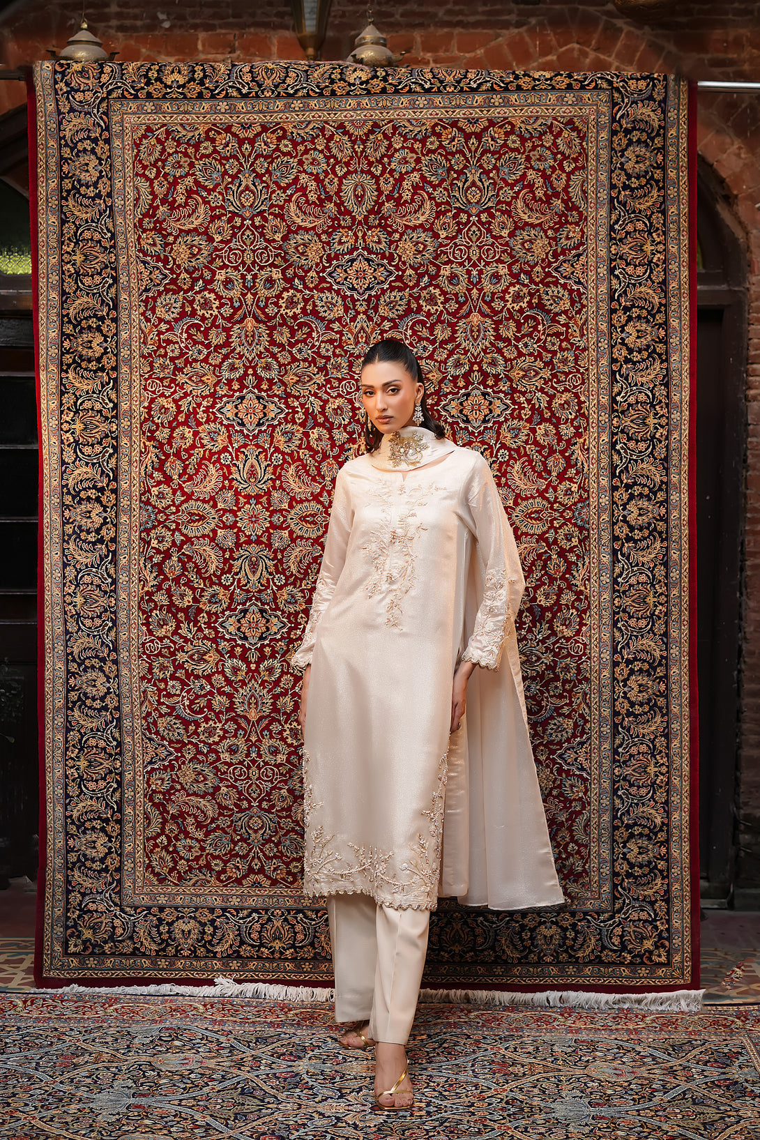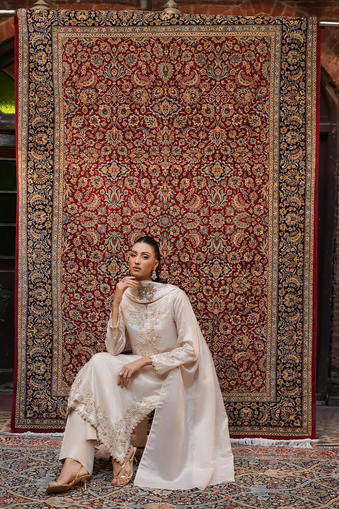 An ethereal ensemble crafted in pure chiffon lamé, delicately hand-embroidered with sequins, beads, and zardozi. The look is elevated with a pleated dupatta and a signature jewel motif that adds timeless elegance. Paired with Korean raw silk pants and lined with medium silk, Mah-e-Noor captures classic refinement and lunar radiance in every detail.