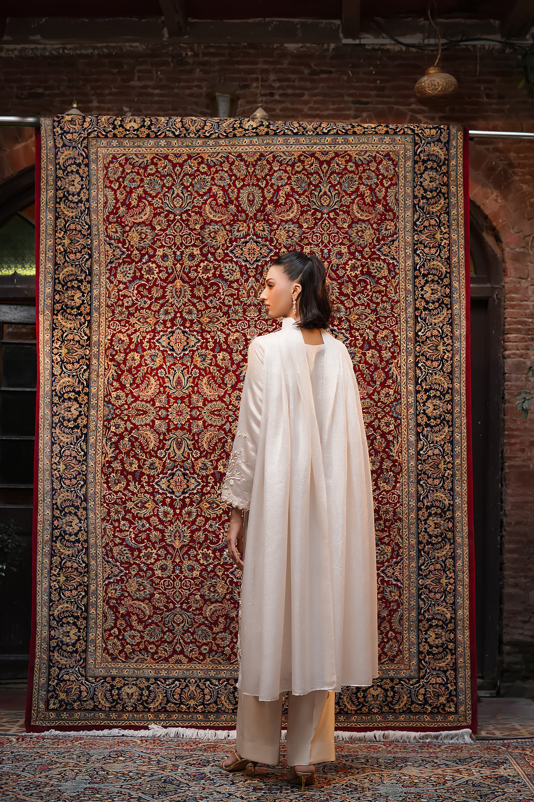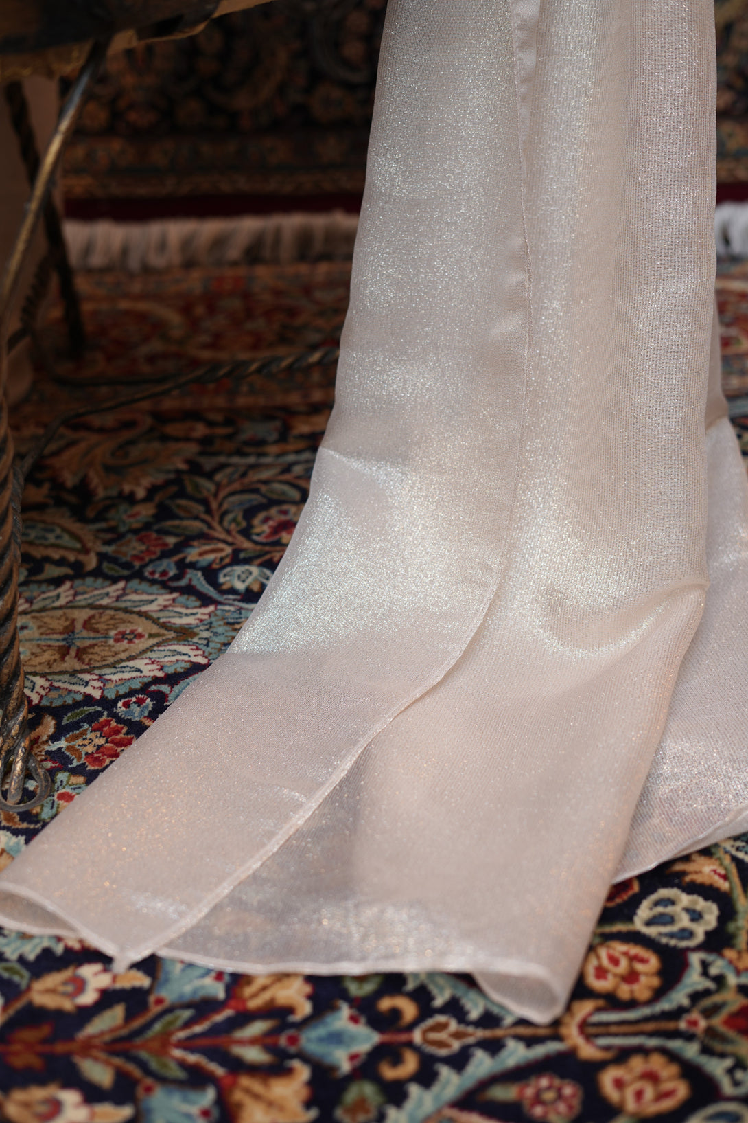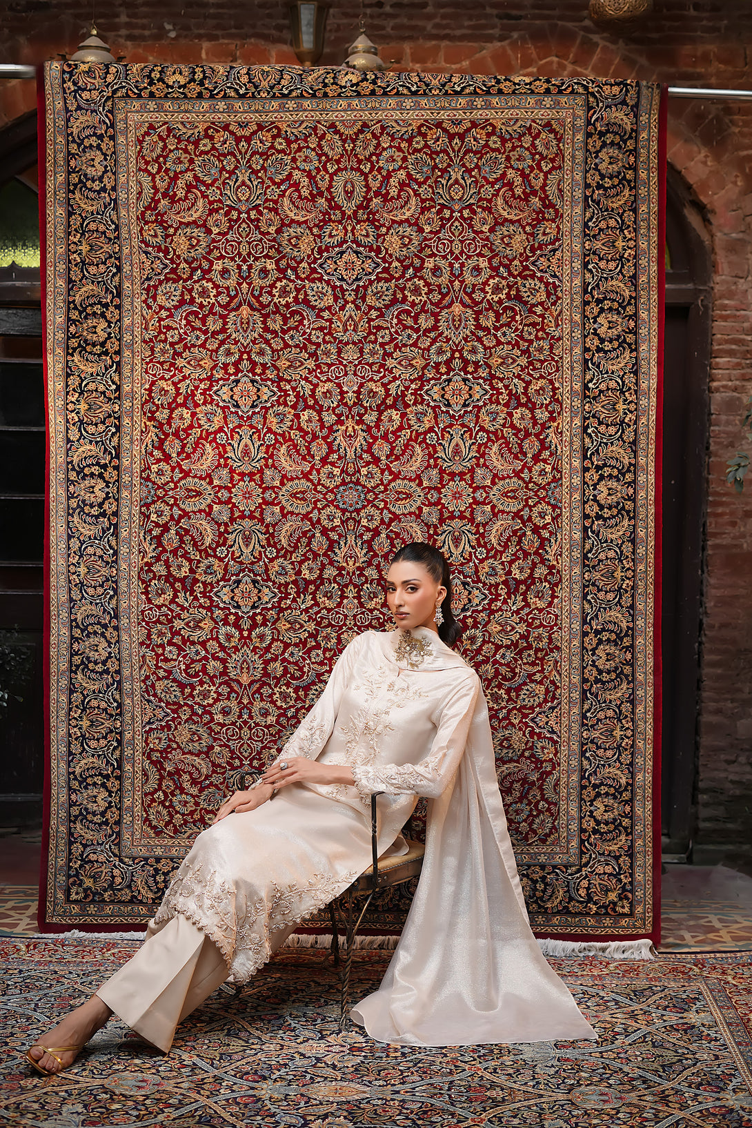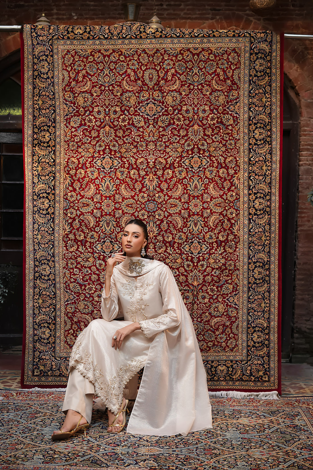 An ethereal ensemble crafted in pure chiffon lamé, delicately hand-embroidered with sequins, beads, and zardozi. The look is elevated with a pleated dupatta and a signature jewel motif that adds timeless elegance. Paired with Korean raw silk pants and lined with medium silk, Mah-e-Noor captures classic refinement and lunar radiance in every detail.
