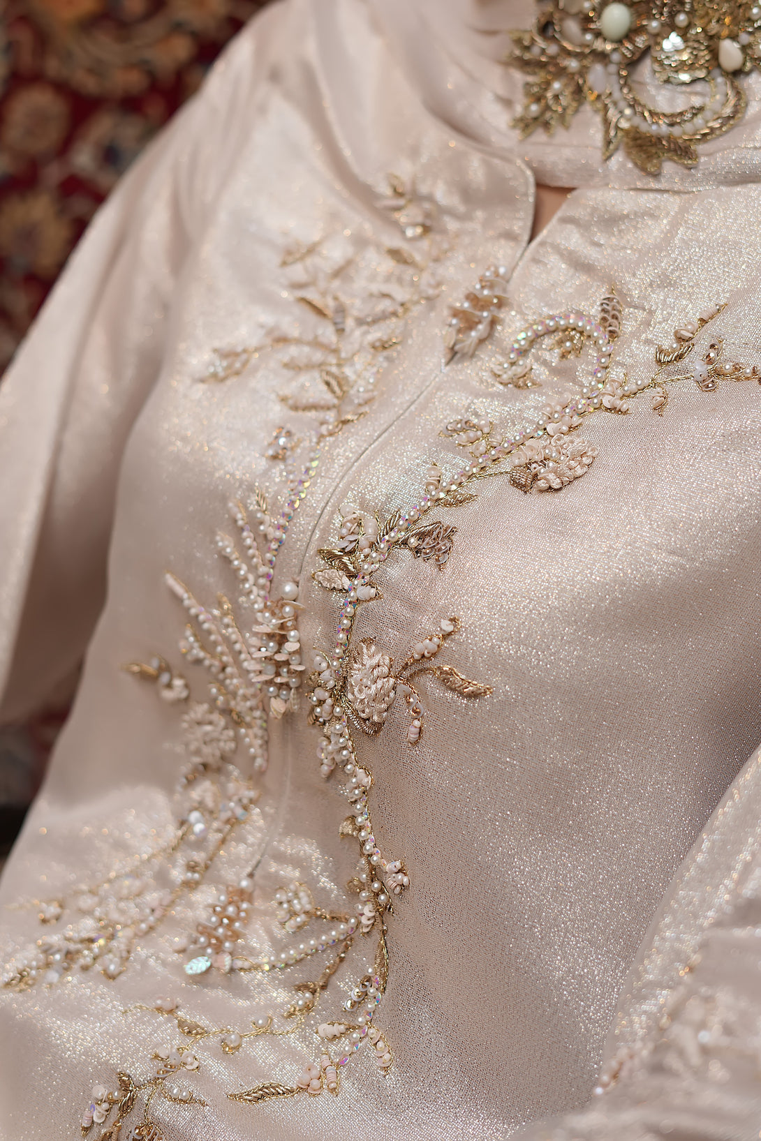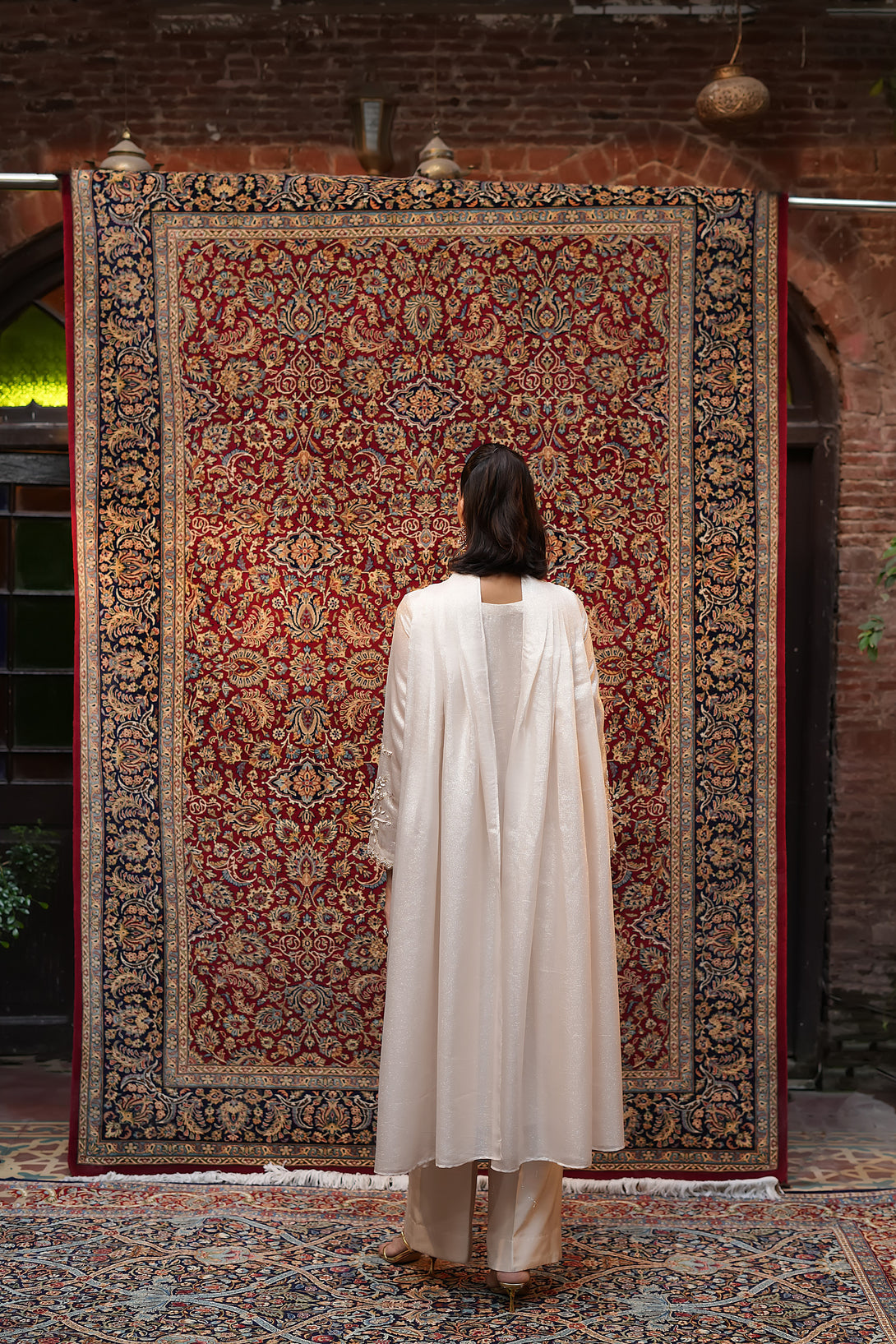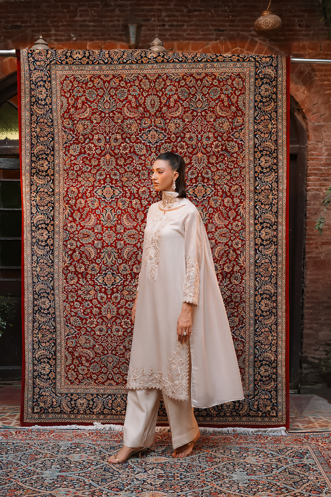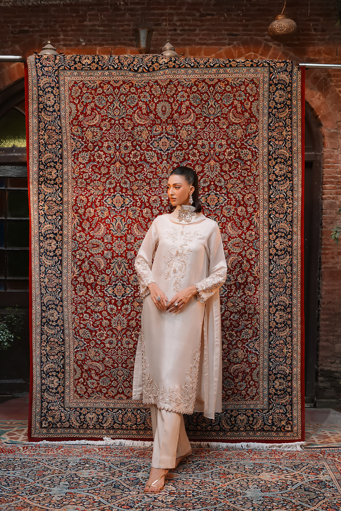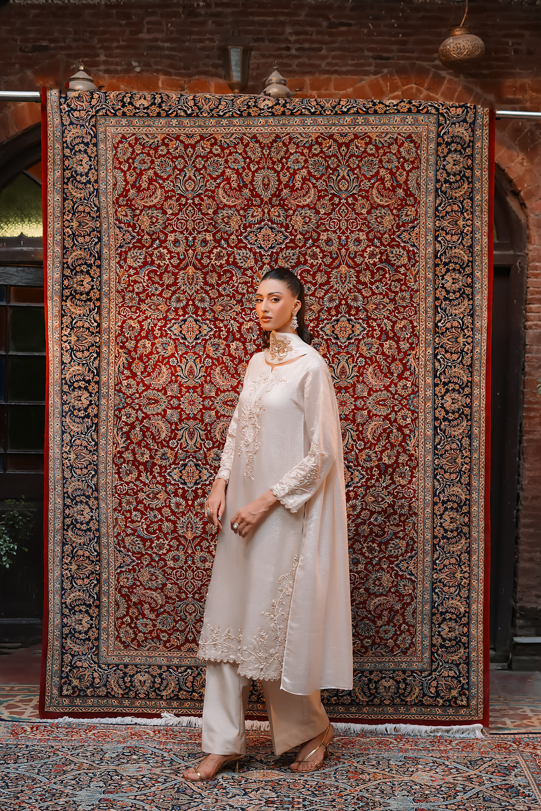 An ethereal ensemble crafted in pure chiffon lamé, delicately hand-embroidered with sequins, beads, and zardozi. The look is elevated with a pleated dupatta and a signature jewel motif that adds timeless elegance. Paired with Korean raw silk pants and lined with medium silk, Mah-e-Noor captures classic refinement and lunar radiance in every detail.