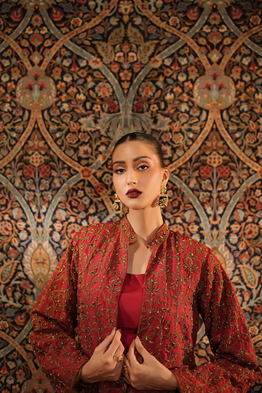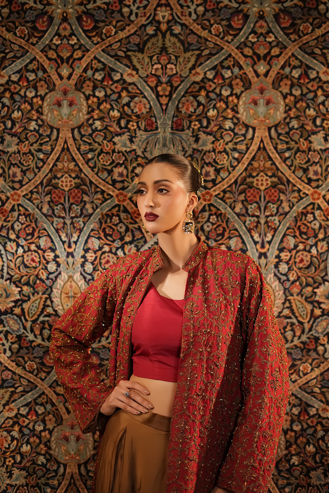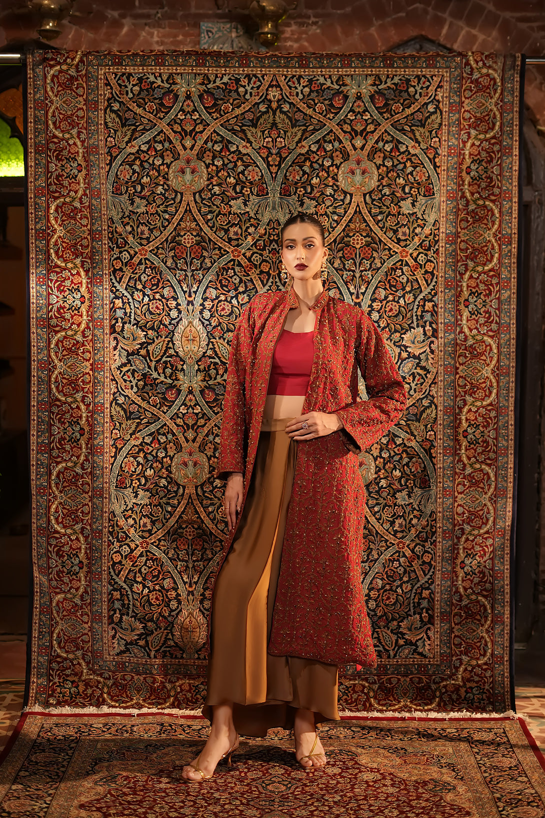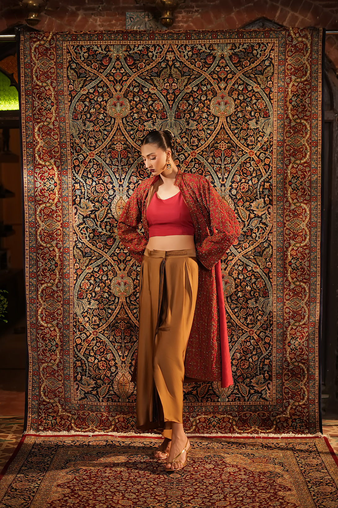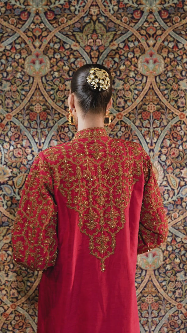Inspired by the timeless Mughal jaali lattice, reminiscent of Islamic architectural heritage, this stunning red jacket is adorned with intricate marori embroidery and delicate handwork, making it a true statement piece for the festive season. Designed with versatility in mind, it comes in two variations — styled with a blouse and half saree for a regal, traditional look, or paired with a pin-pleated slip and pants for a chic, contemporary ensemble — seamlessly blending cultural artistry with modern elegance.
