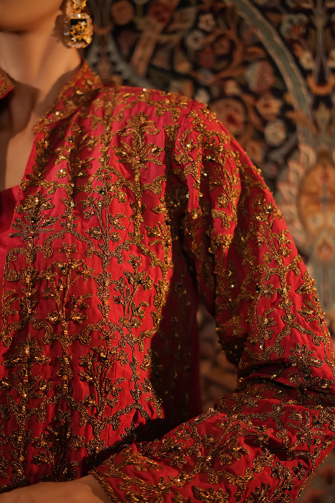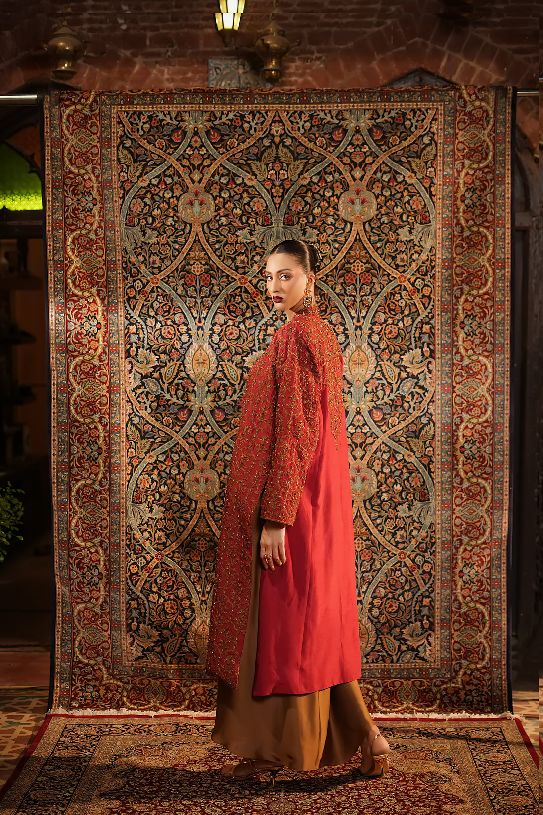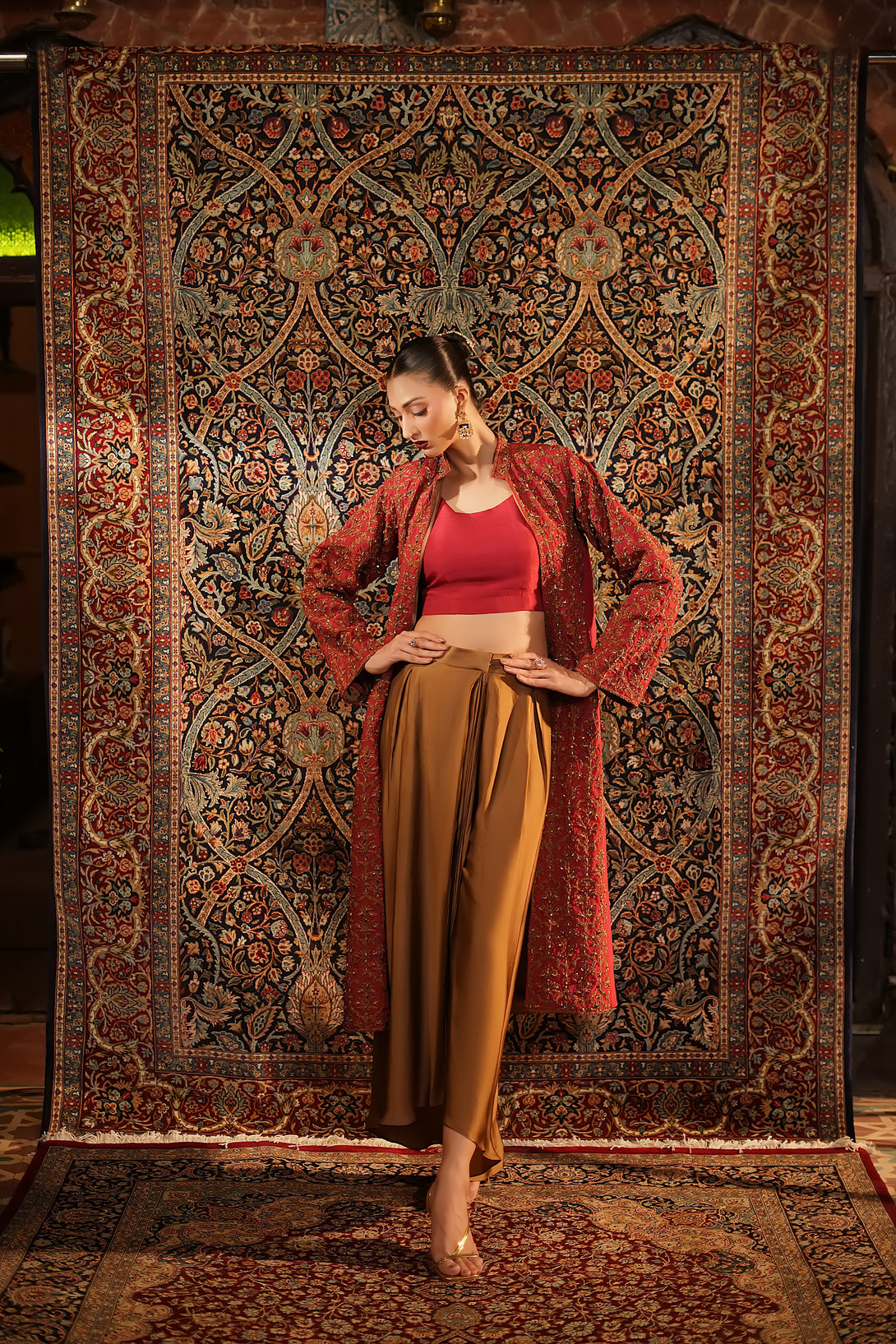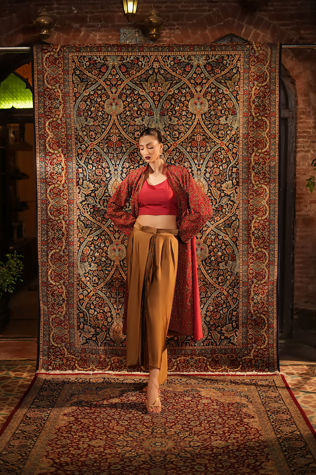 Inspired by the timeless Mughal jaali lattice, reminiscent of Islamic architectural heritage, this stunning red jacket is adorned with intricate marori embroidery and delicate handwork, making it a true statement piece for the festive season. Designed with versatility in mind, it comes in two variations — styled with a blouse and half saree for a regal, traditional look, or paired with a pin-pleated slip and pants for a chic, contemporary ensemble — seamlessly blending cultural artistry with modern elegance.