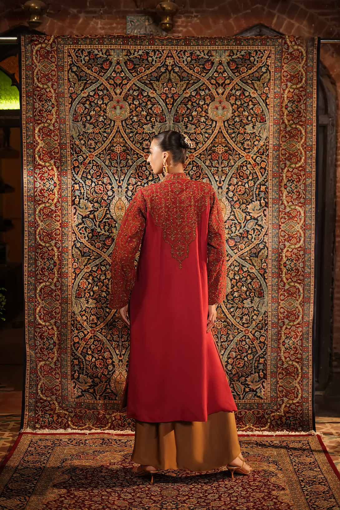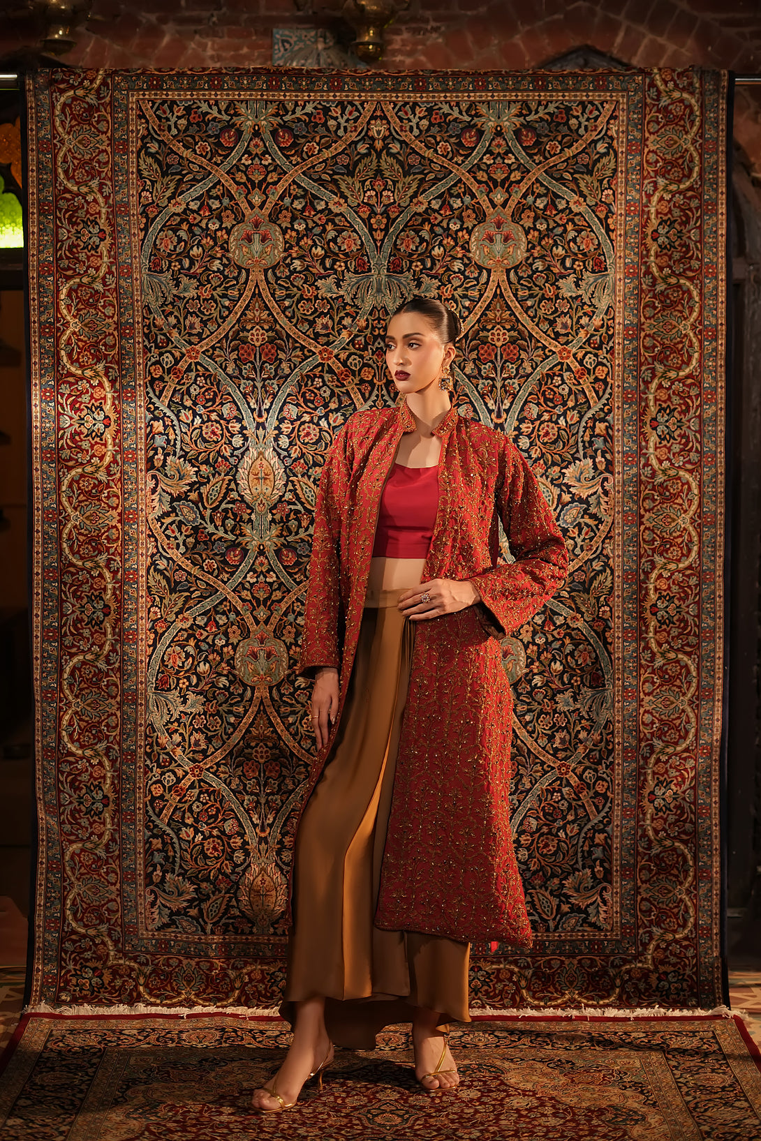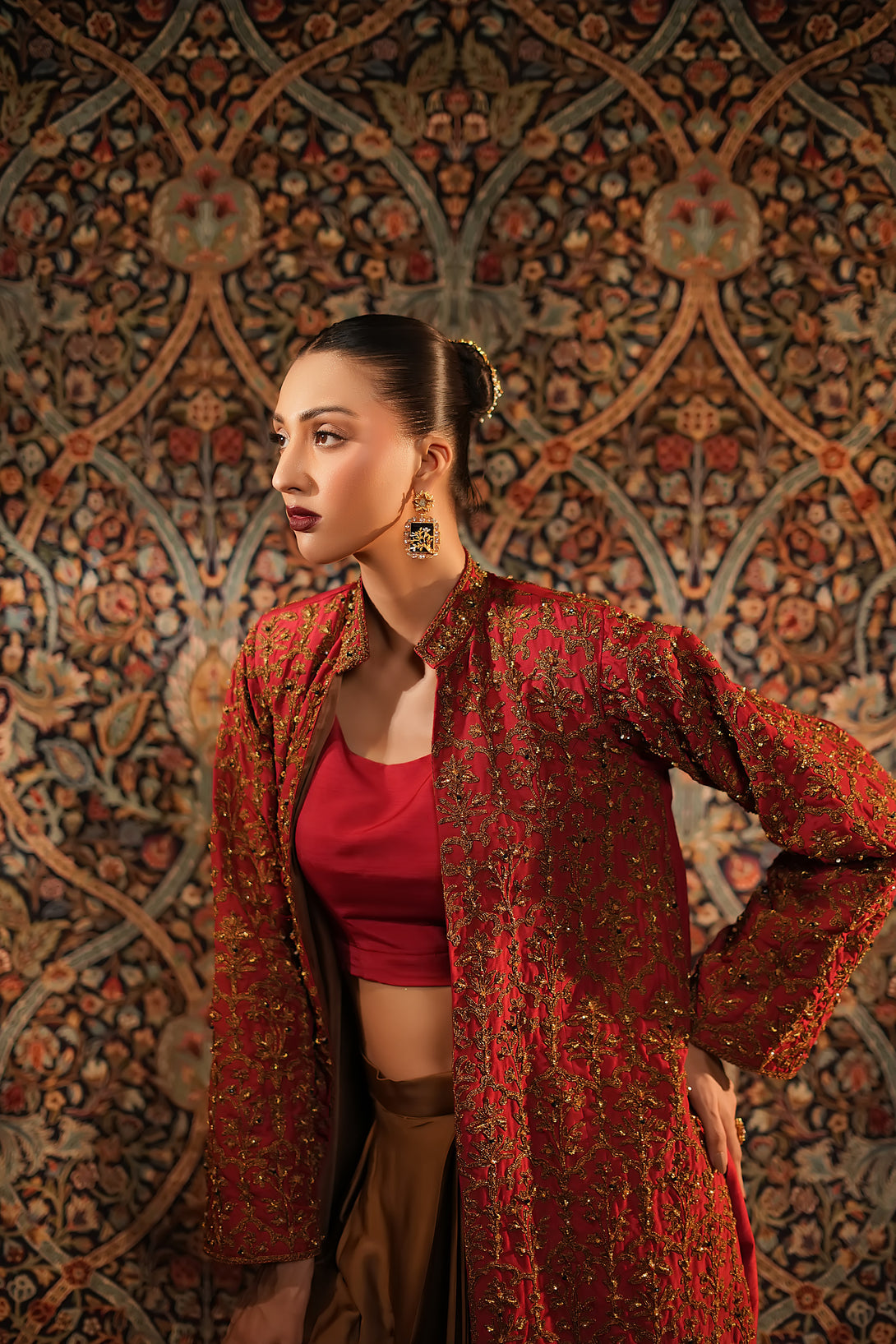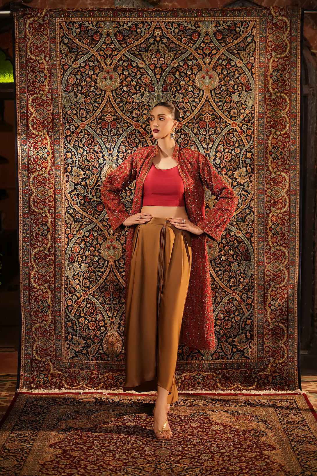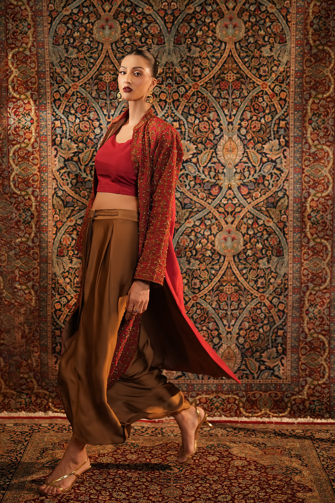 Inspired by the timeless Mughal jaali lattice, reminiscent of Islamic architectural heritage, this stunning red jacket is adorned with intricate marori embroidery and delicate handwork, making it a true statement piece for the festive season. Designed with versatility in mind, it comes in two variations — styled with a blouse and half saree for a regal, traditional look, or paired with a pin-pleated slip and pants for a chic, contemporary ensemble — seamlessly blending cultural artistry with modern elegance.