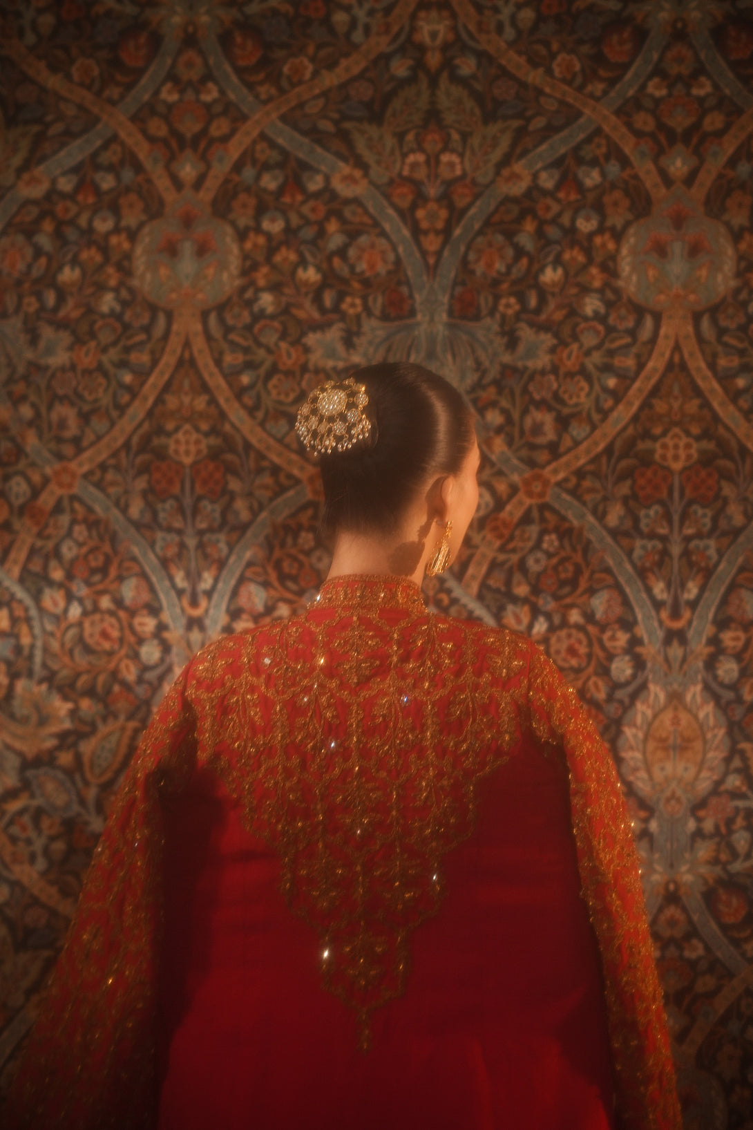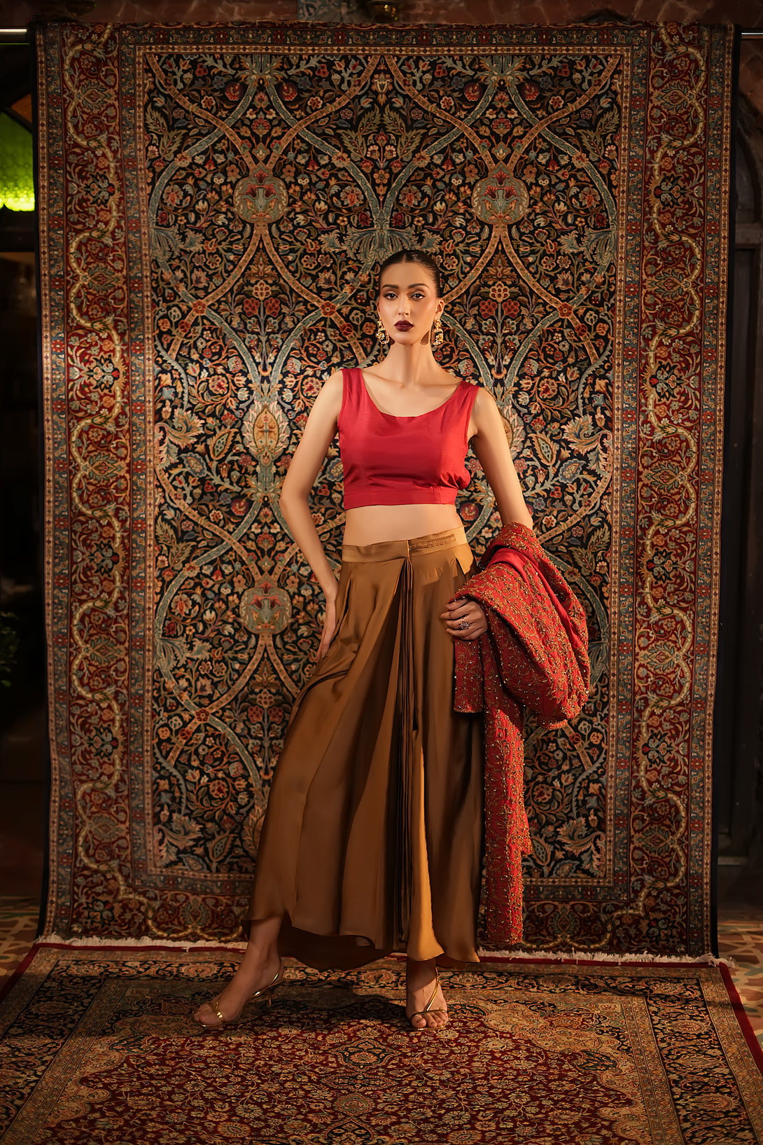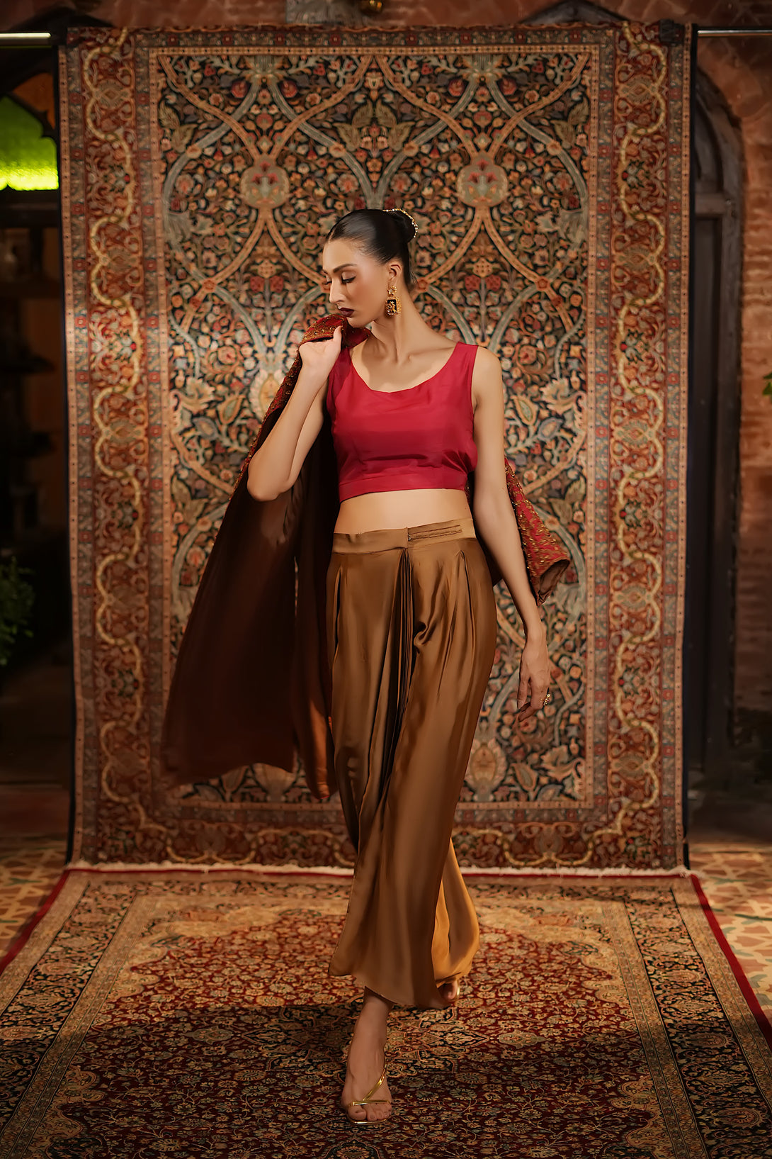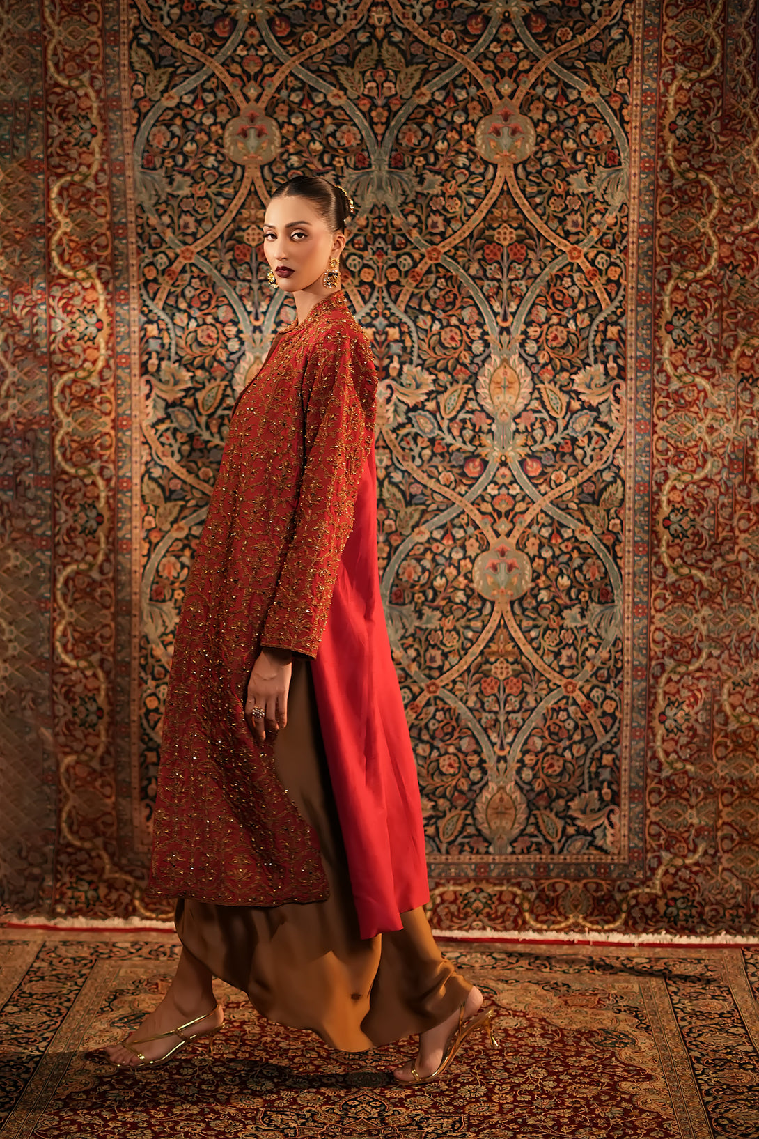 Inspired by the timeless Mughal jaali lattice, reminiscent of Islamic architectural heritage, this stunning red jacket is adorned with intricate marori embroidery and delicate handwork, making it a true statement piece for the festive season. Designed with versatility in mind, it comes in two variations — styled with a blouse and half saree for a regal, traditional look, or paired with a pin-pleated slip and pants for a chic, contemporary ensemble — seamlessly blending cultural artistry with modern elegance.