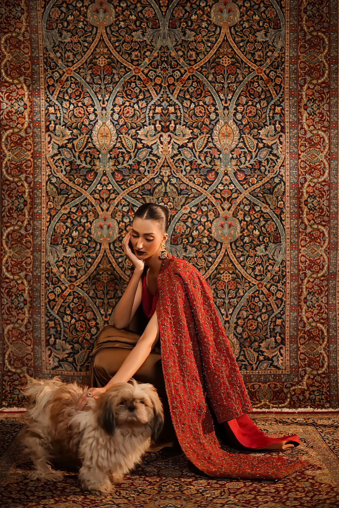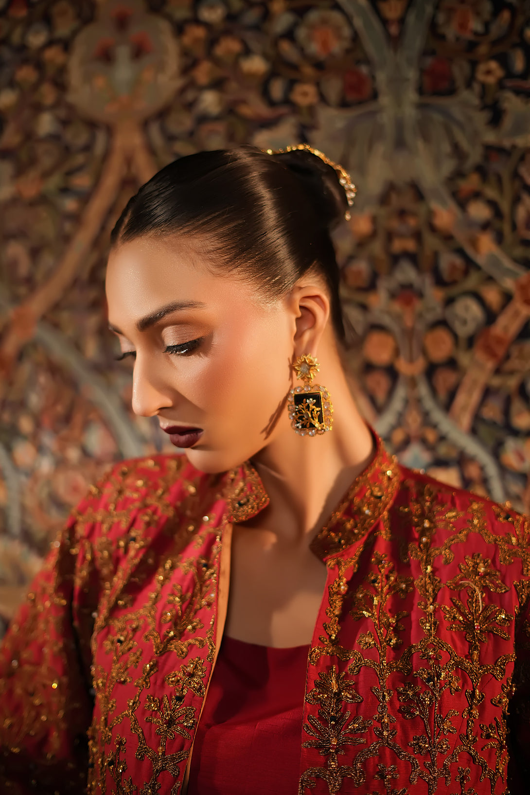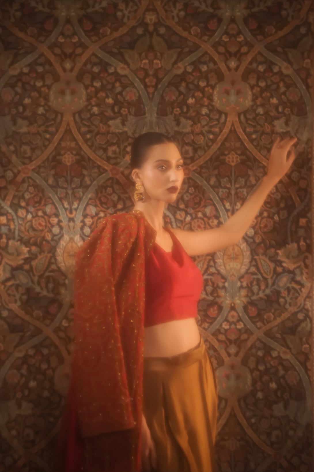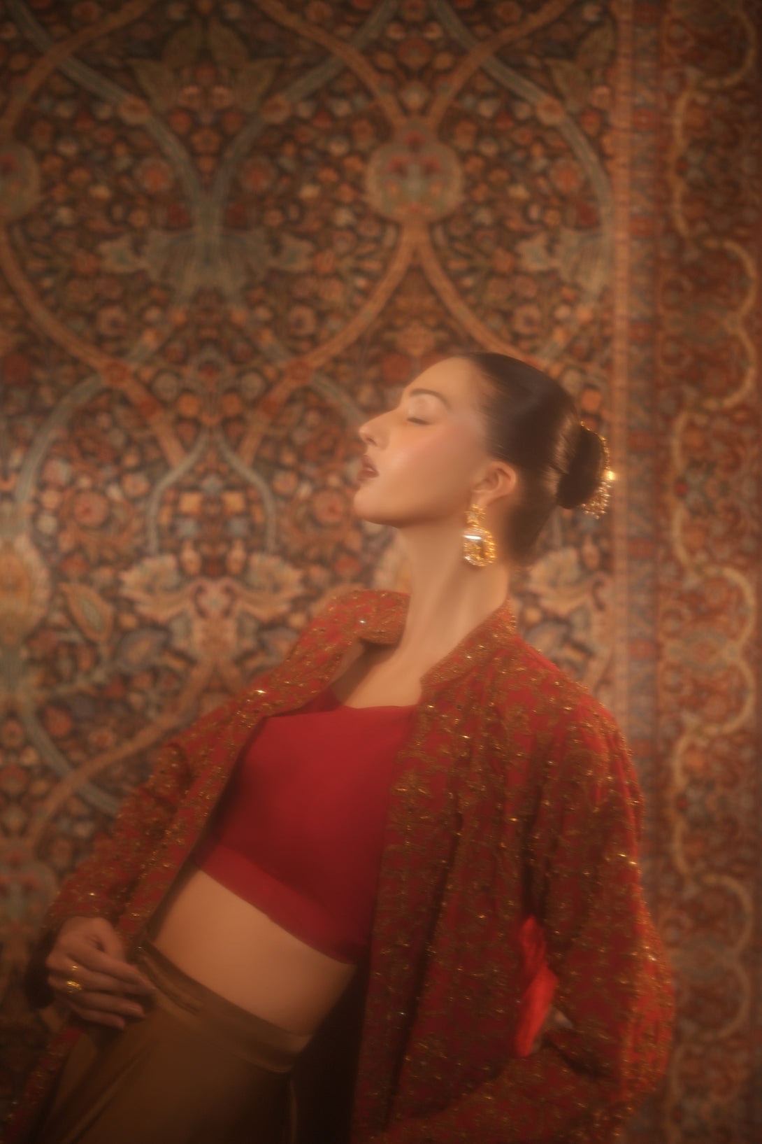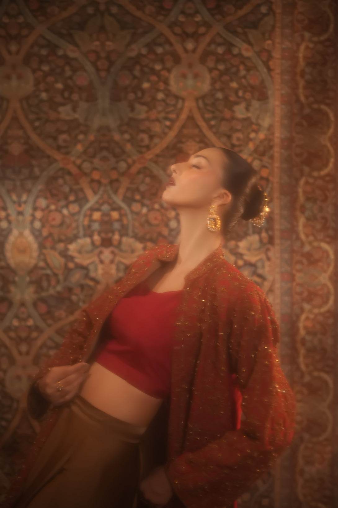 Inspired by the timeless Mughal jaali lattice, reminiscent of Islamic architectural heritage, this stunning red jacket is adorned with intricate marori embroidery and delicate handwork, making it a true statement piece for the festive season. Designed with versatility in mind, it comes in two variations — styled with a blouse and half saree for a regal, traditional look, or paired with a pin-pleated slip and pants for a chic, contemporary ensemble — seamlessly blending cultural artistry with modern elegance.