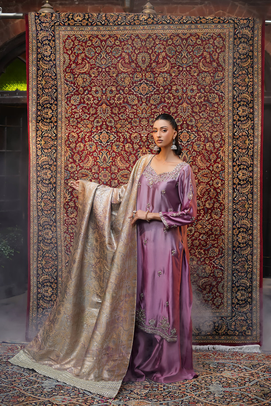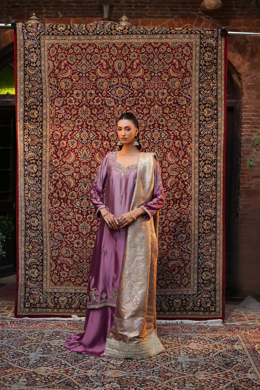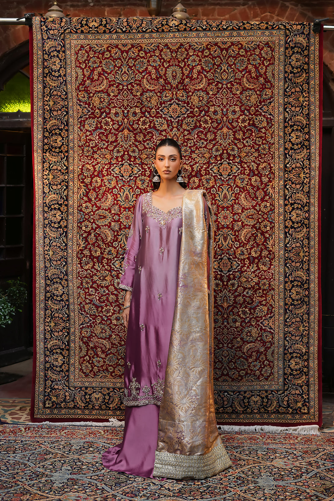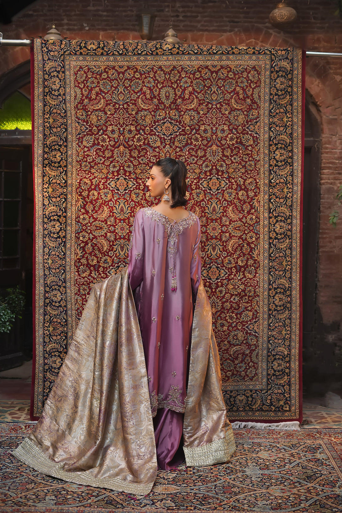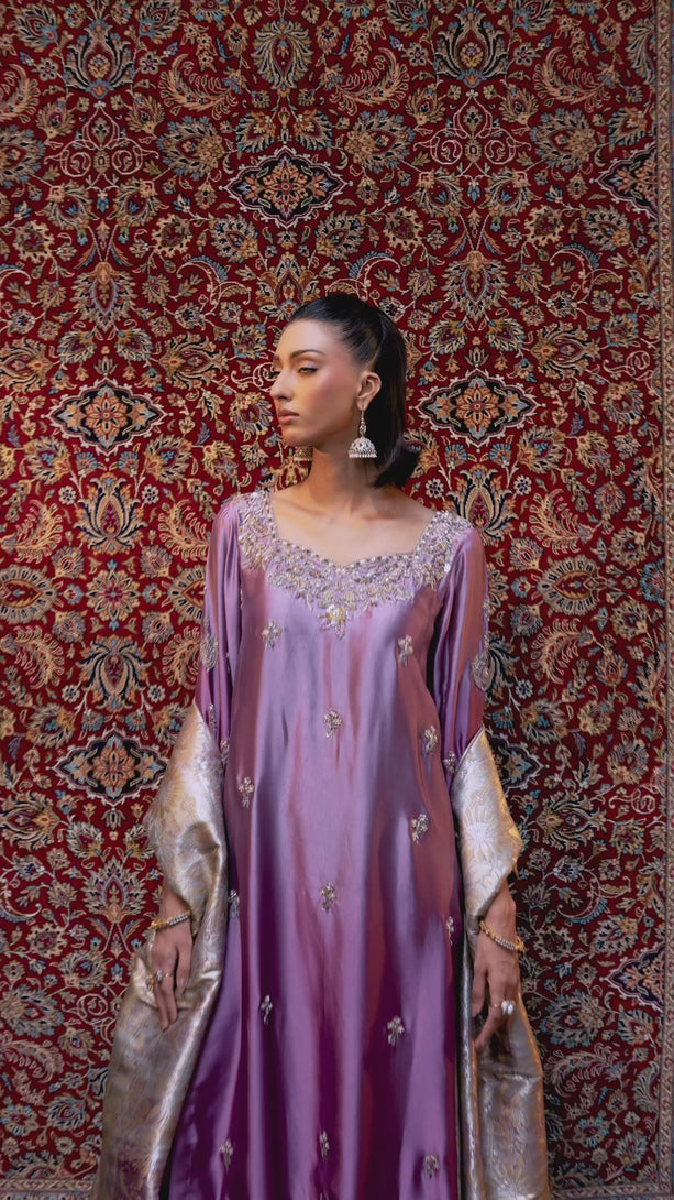 Crafted from pure tissue silk in dreamy ombré lilac tones, this regal ensemble is meticulously hand-embellished by our skilled artisans with Mughal-inspired motifs that evoke a true maharani aura. Paired with box-pleated loose azar pants and a luxurious jamawar shawl adorned with delicate tassels, the look exudes timeless elegance and royal grandeur — a complete festive statement for those who wish to embody sophistication and tradition.