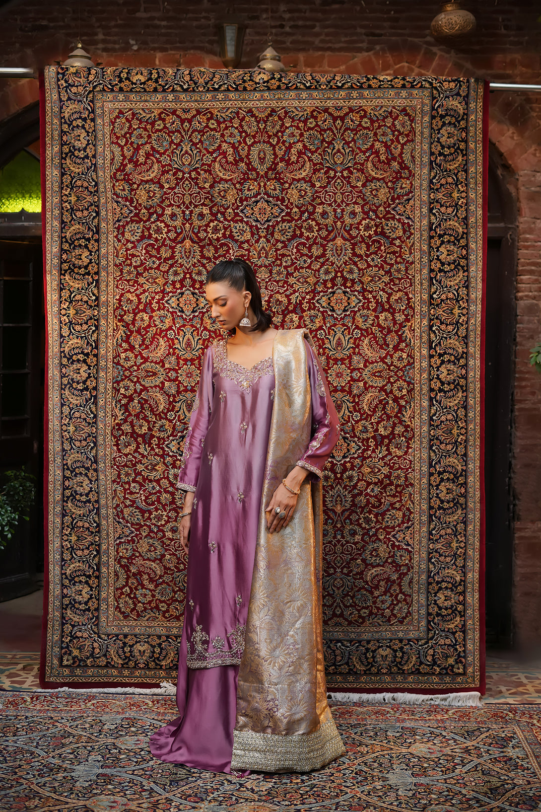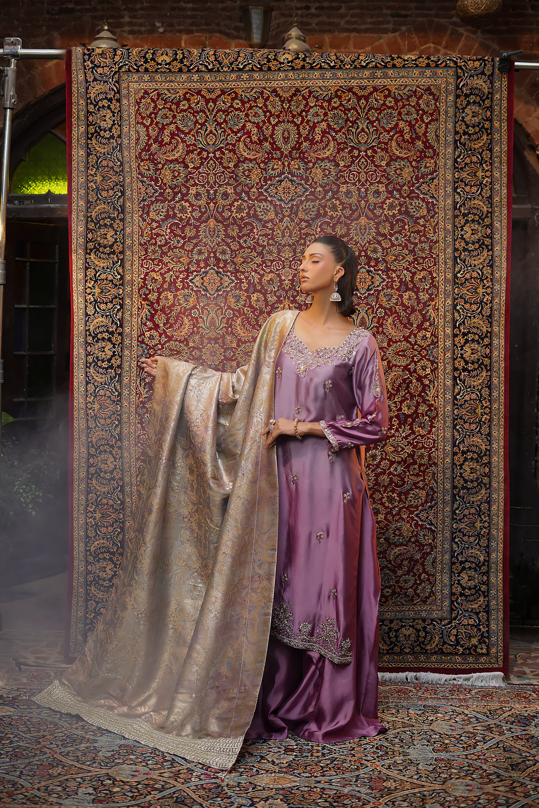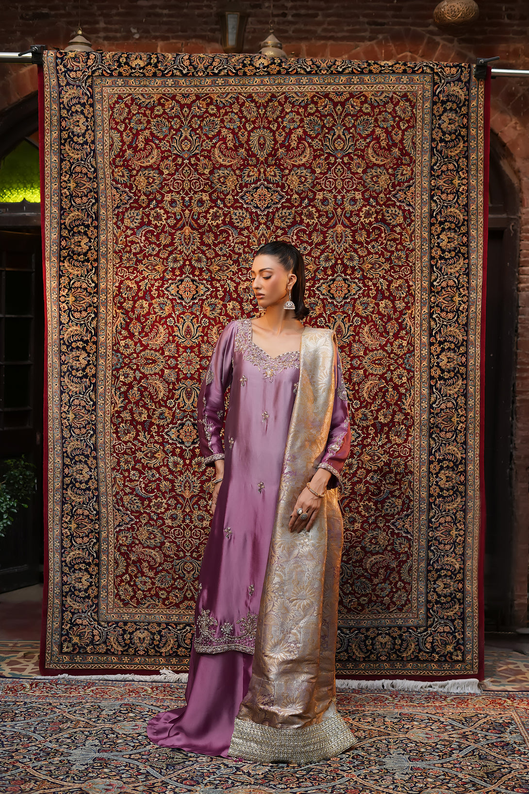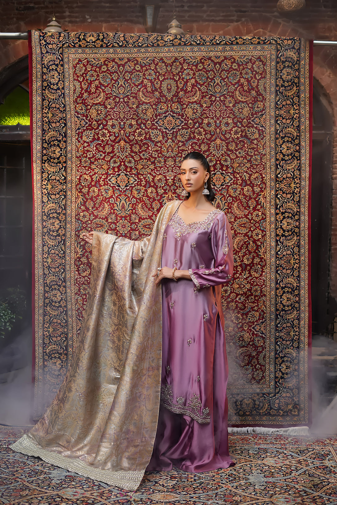 Crafted from pure tissue silk in dreamy ombré lilac tones, this regal ensemble is meticulously hand-embellished by our skilled artisans with Mughal-inspired motifs that evoke a true maharani aura. Paired with box-pleated loose azar pants and a luxurious jamawar shawl adorned with delicate tassels, the look exudes timeless elegance and royal grandeur — a complete festive statement for those who wish to embody sophistication and tradition.
