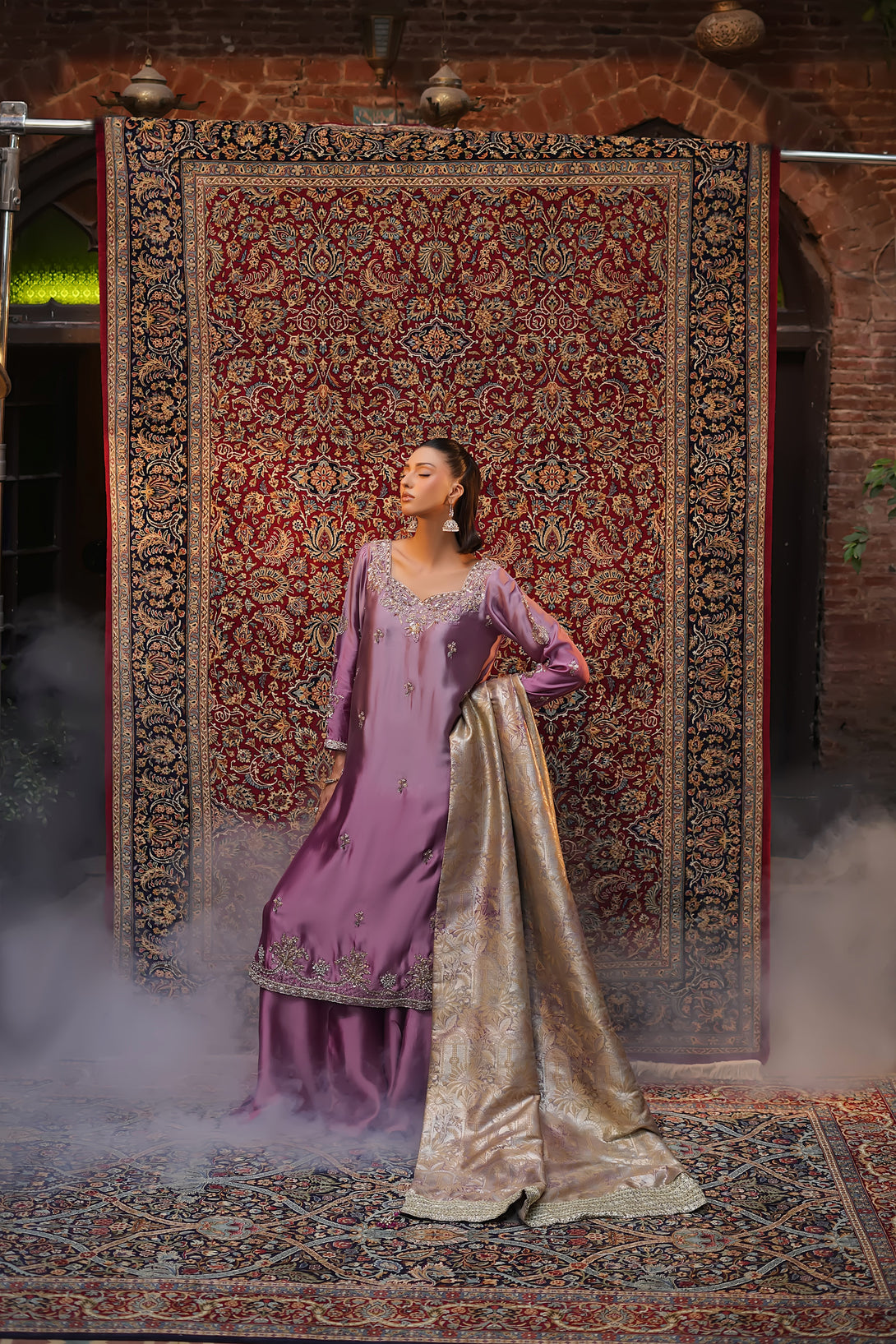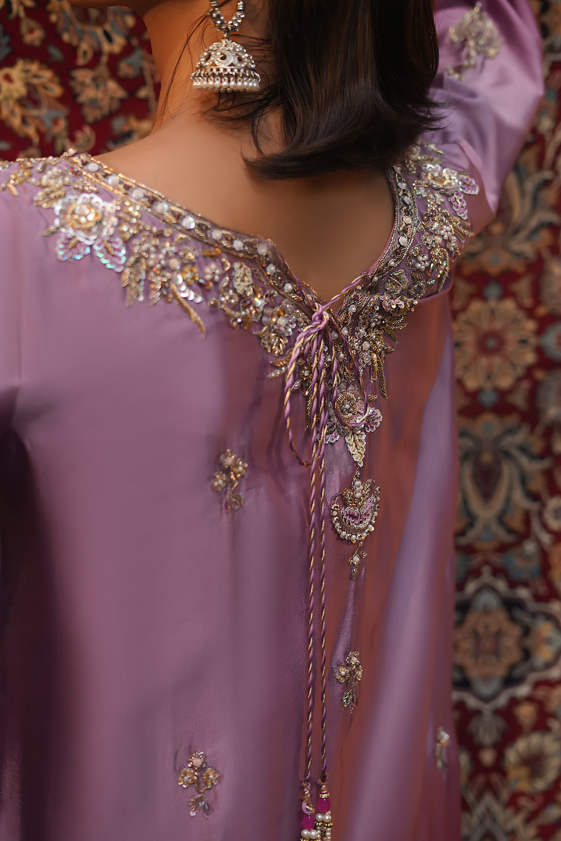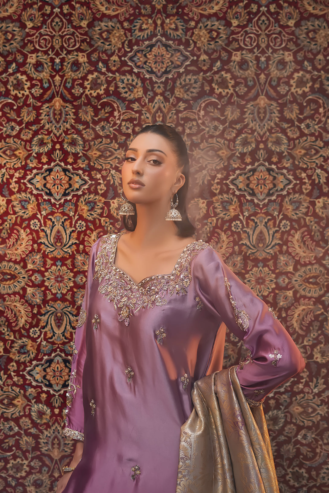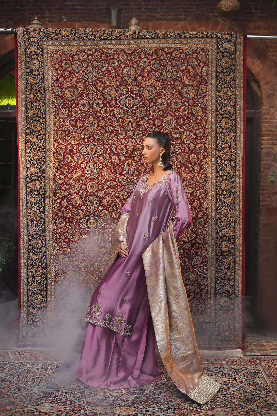Crafted from pure tissue silk in dreamy ombré lilac tones, this regal ensemble is meticulously hand-embellished by our skilled artisans with Mughal-inspired motifs that evoke a true maharani aura. Paired with box-pleated loose azar pants and a luxurious jamawar shawl adorned with delicate tassels, the look exudes timeless elegance and royal grandeur — a complete festive statement for those who wish to embody sophistication and tradition.