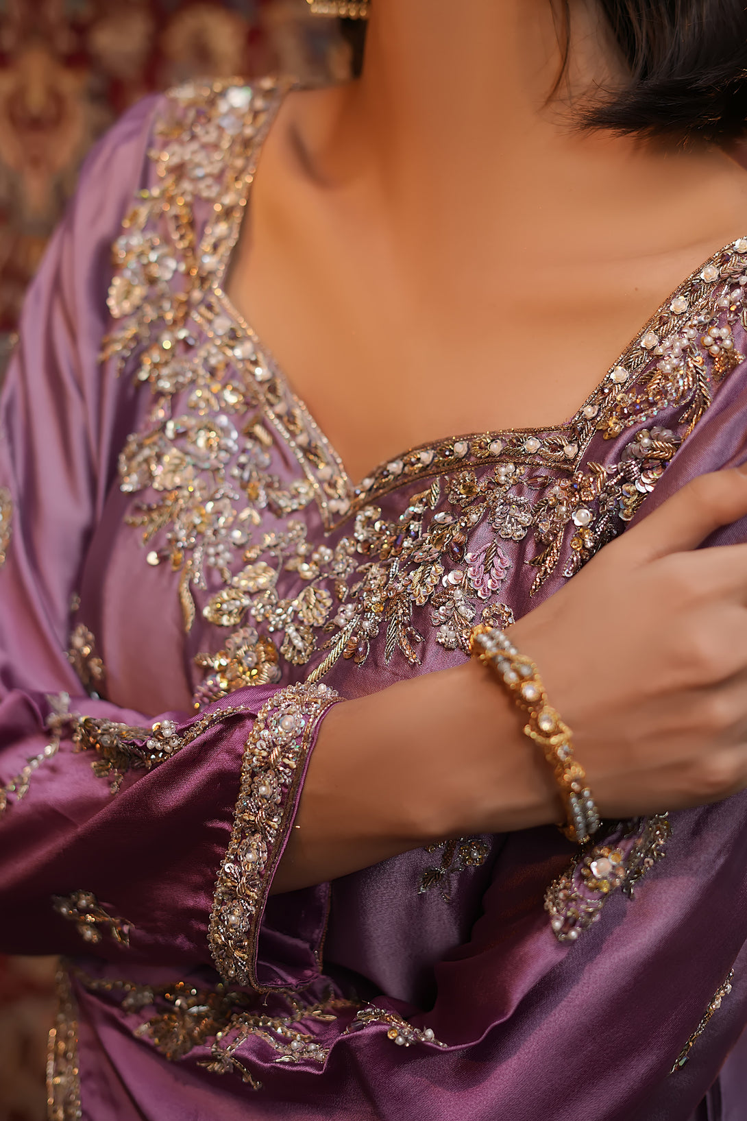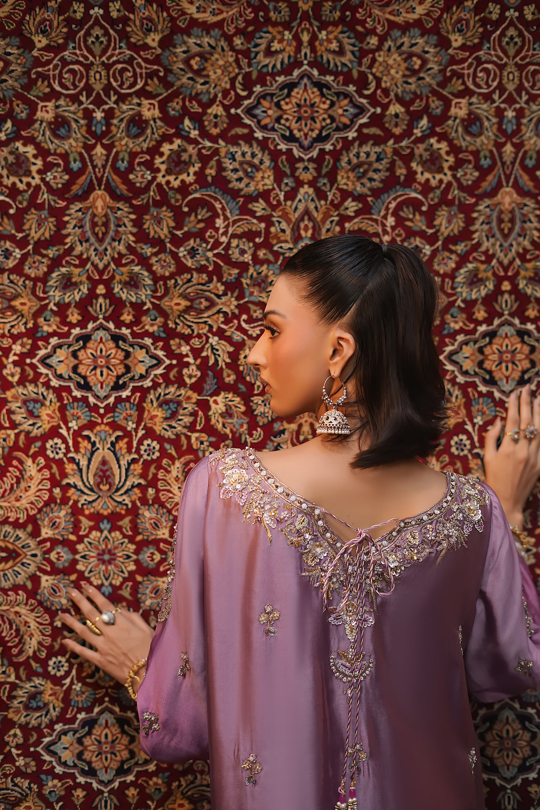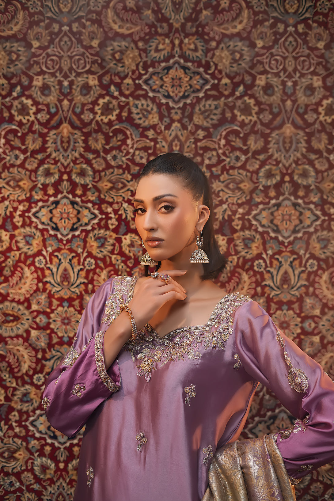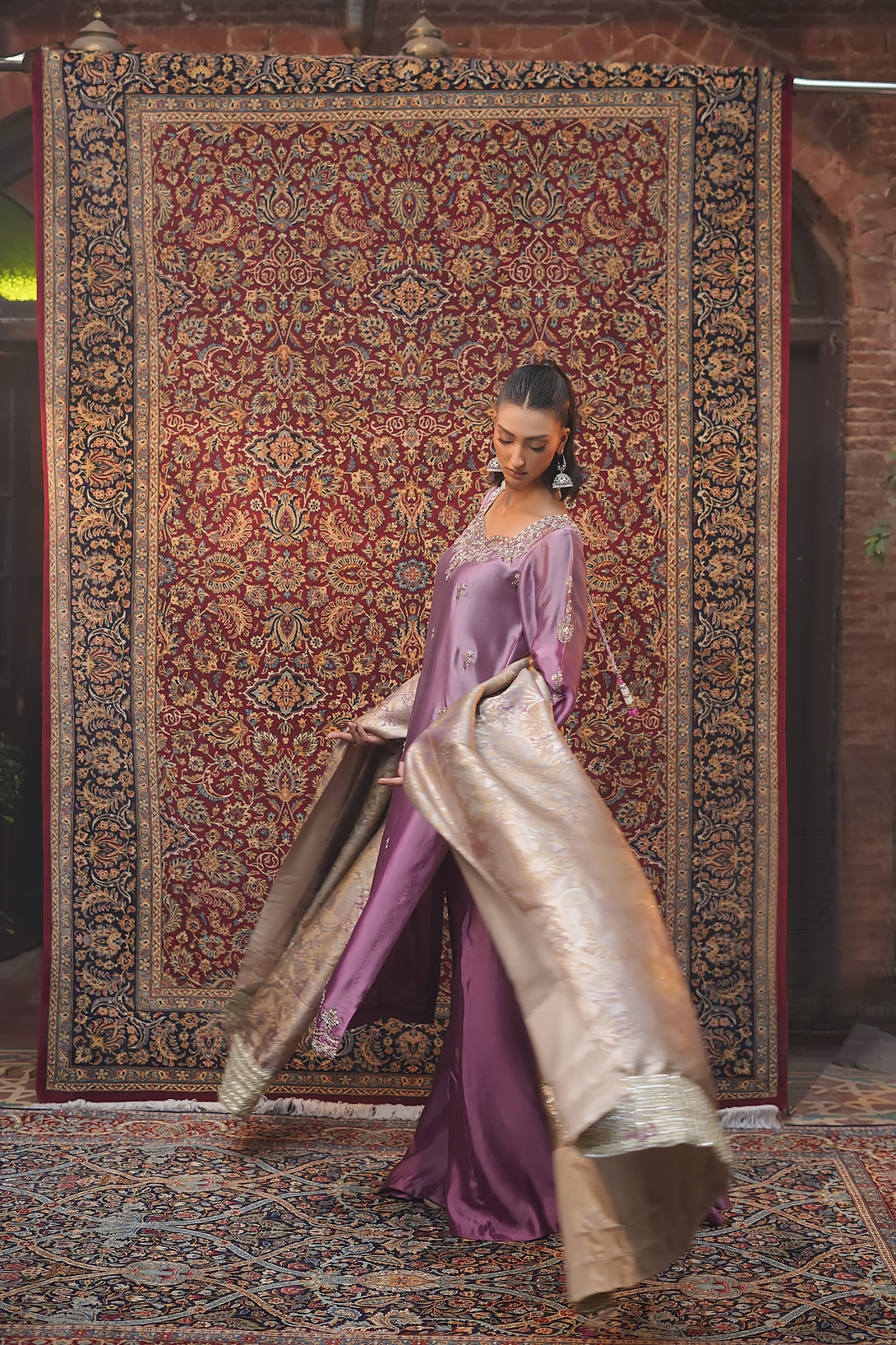 Crafted from pure tissue silk in dreamy ombré lilac tones, this regal ensemble is meticulously hand-embellished by our skilled artisans with Mughal-inspired motifs that evoke a true maharani aura. Paired with box-pleated loose azar pants and a luxurious jamawar shawl adorned with delicate tassels, the look exudes timeless elegance and royal grandeur — a complete festive statement for those who wish to embody sophistication and tradition.