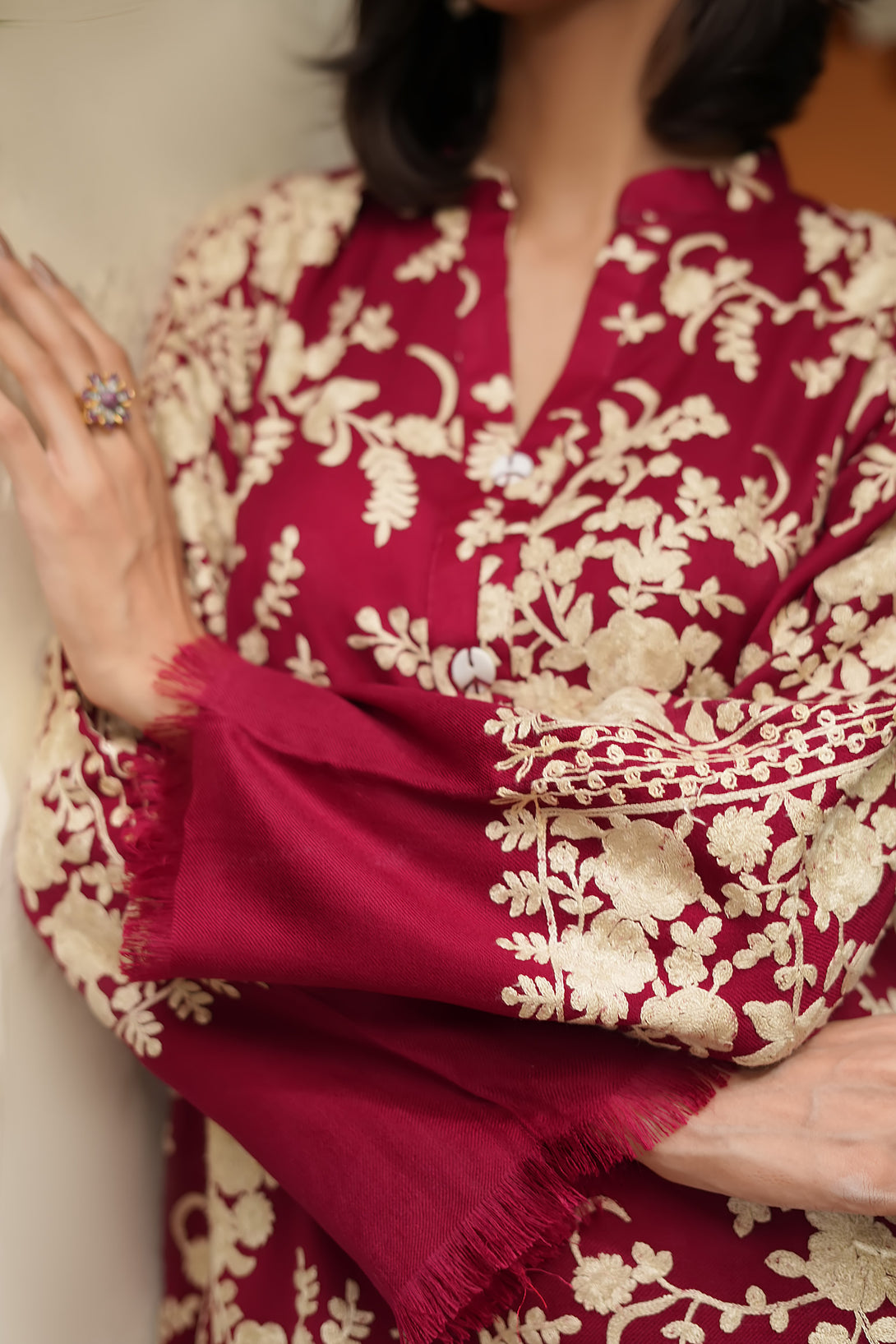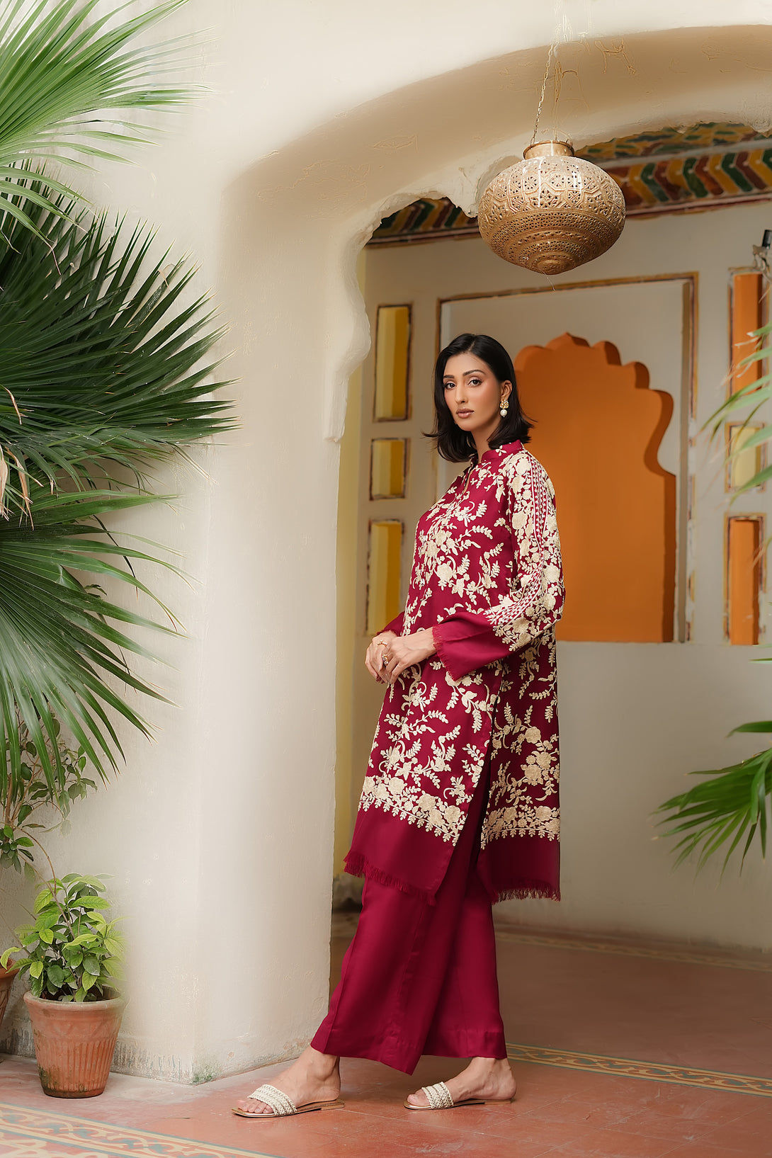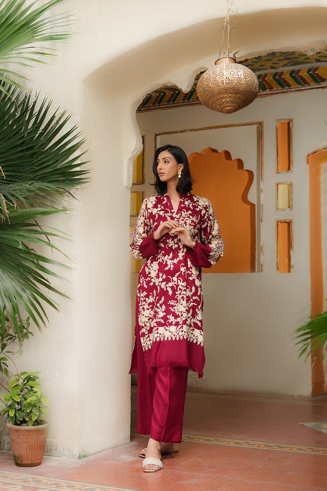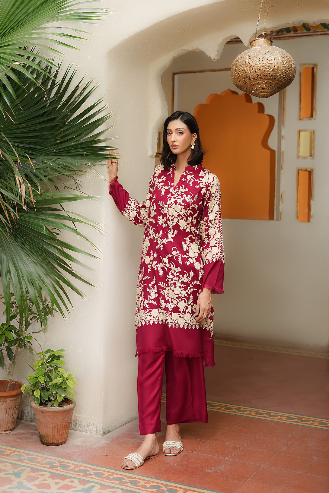 Stay warm and stylish with our exquisite Pashmina embroidered kurtas, paired perfectly with matching Pashmina pants. This versatile co-ord set is ideal for casual lunches, dinners, or even a chic addition to your workplace attire.