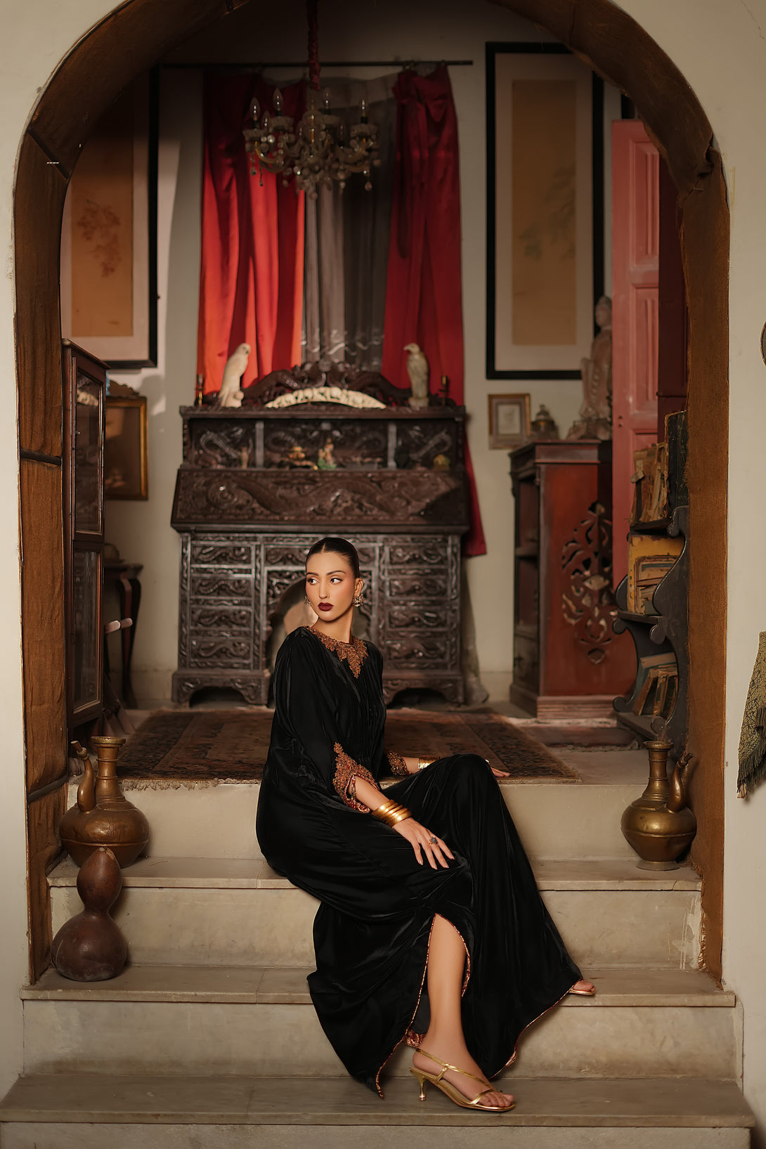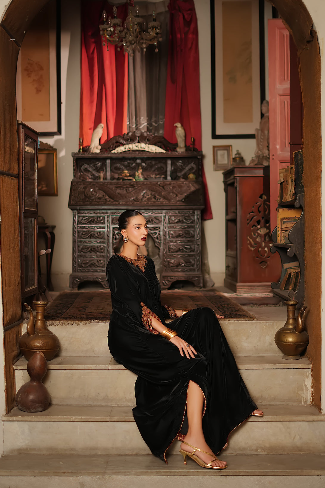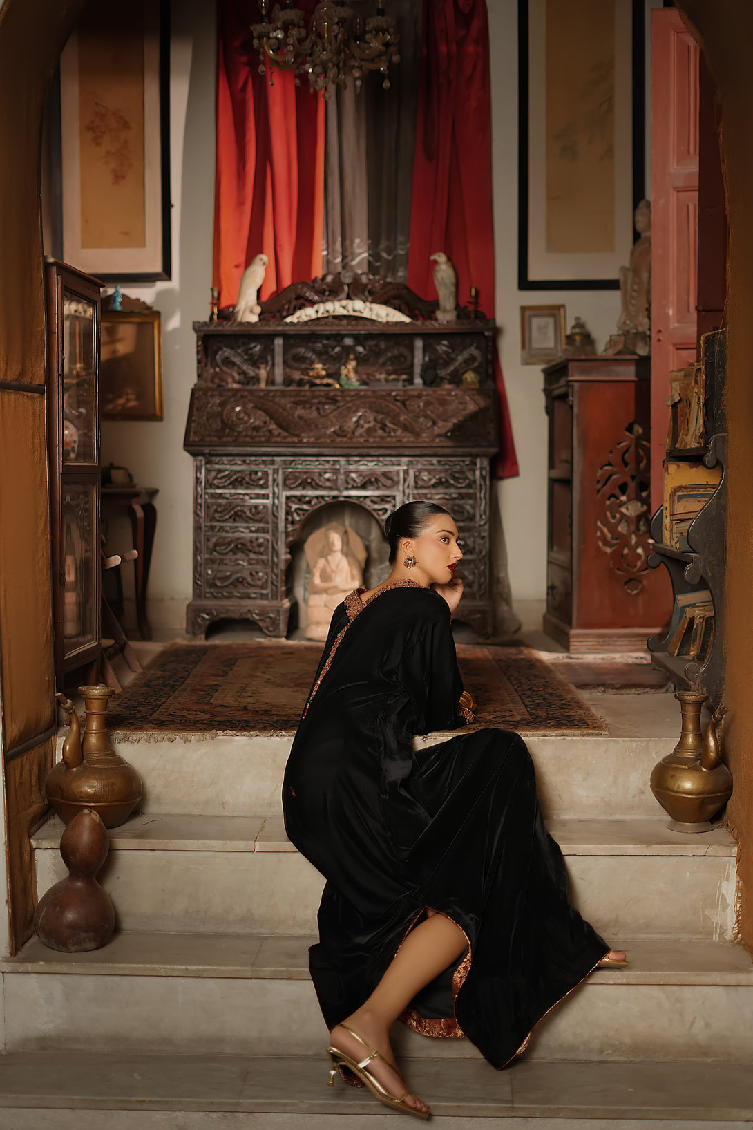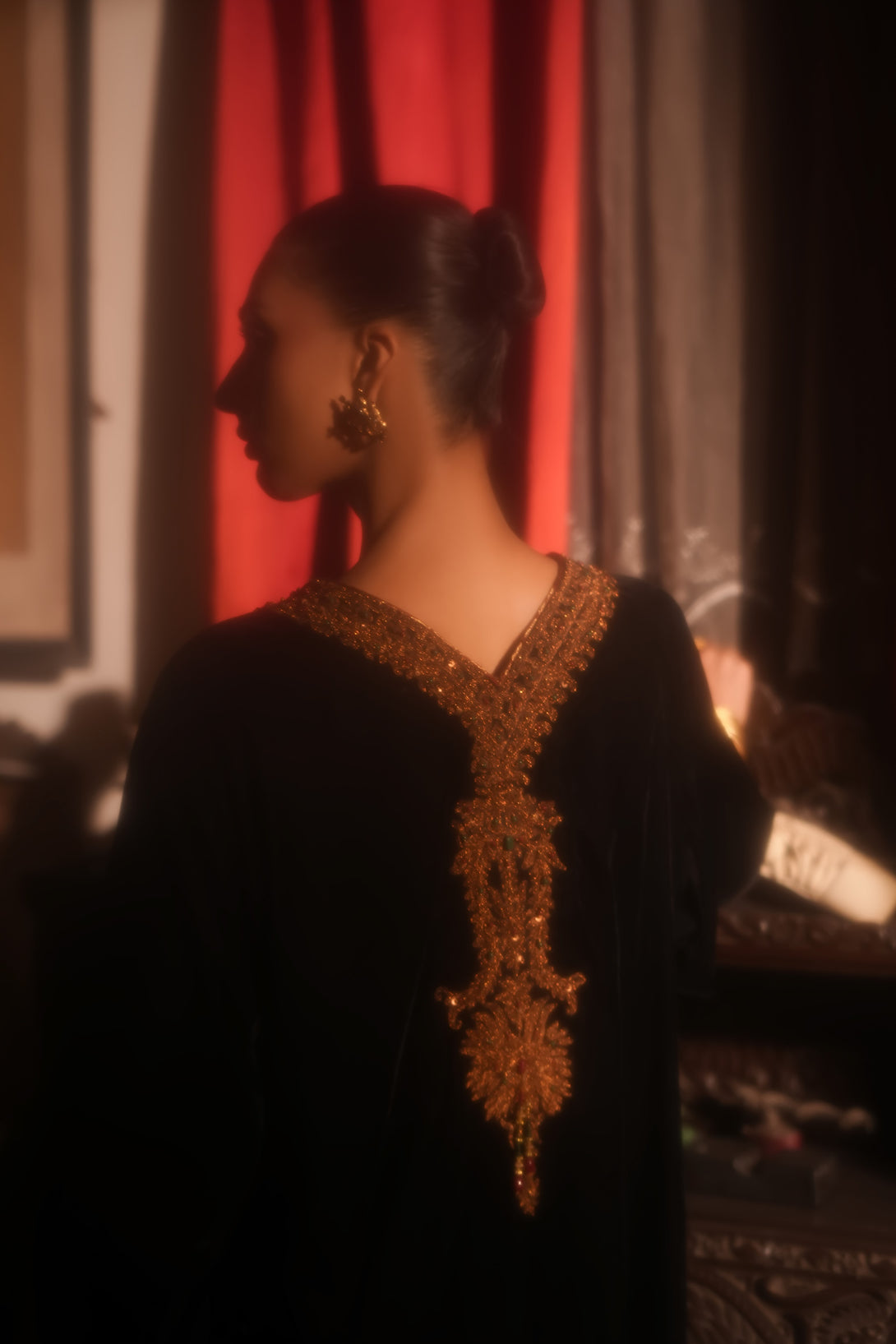 A luxurious velvet kaftan adorned with intricate Mughal marori work, further enhanced with delicate hand embellishments in beads and sequins. A perfect blend of tradition and sophistication, making it an elegant choice for festive occasions.