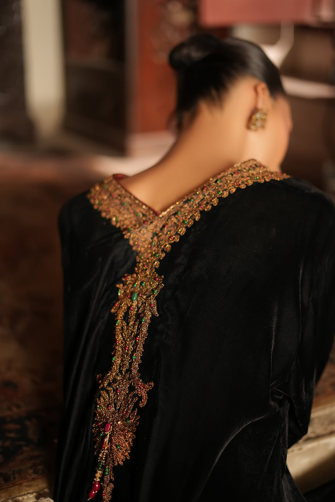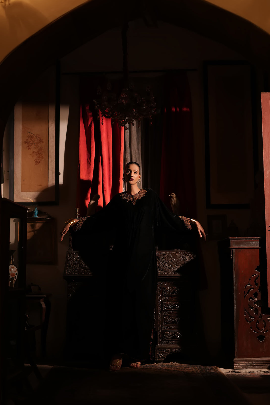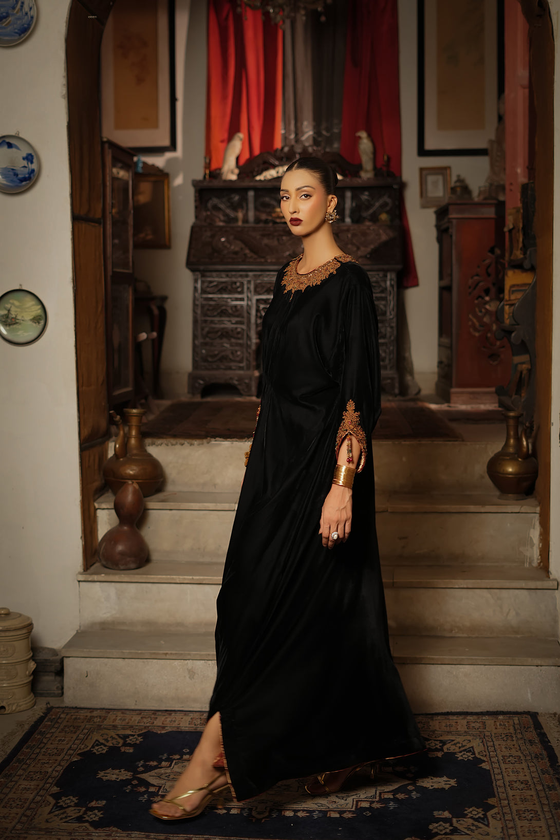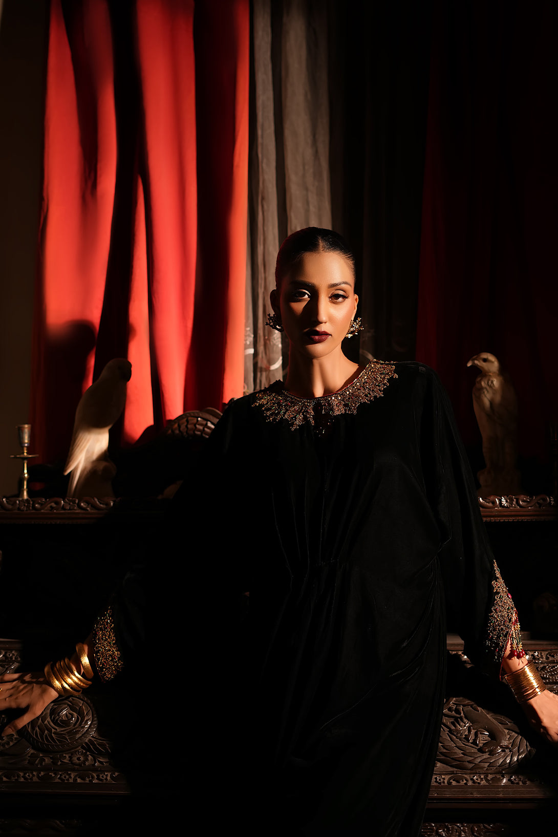 A luxurious velvet kaftan adorned with intricate Mughal marori work, further enhanced with delicate hand embellishments in beads and sequins. A perfect blend of tradition and sophistication, making it an elegant choice for festive occasions.