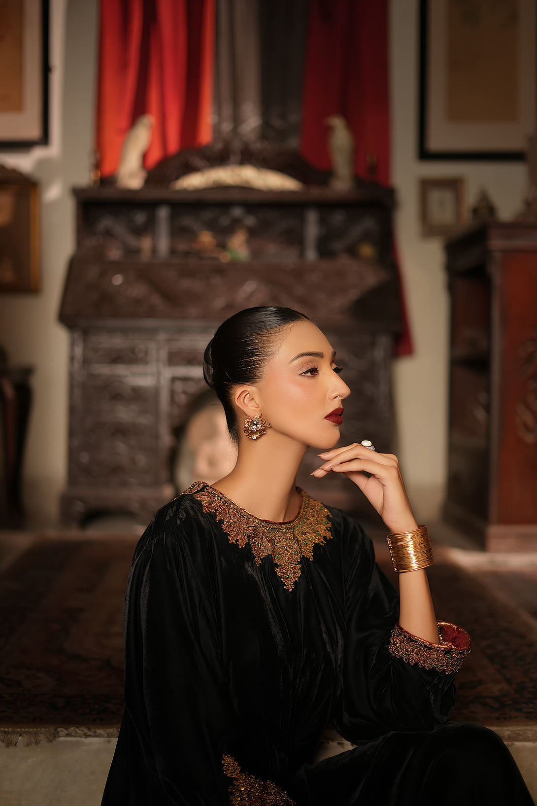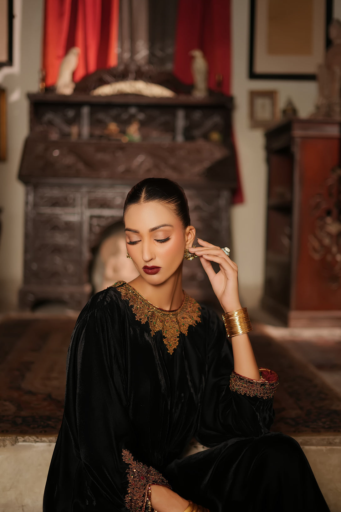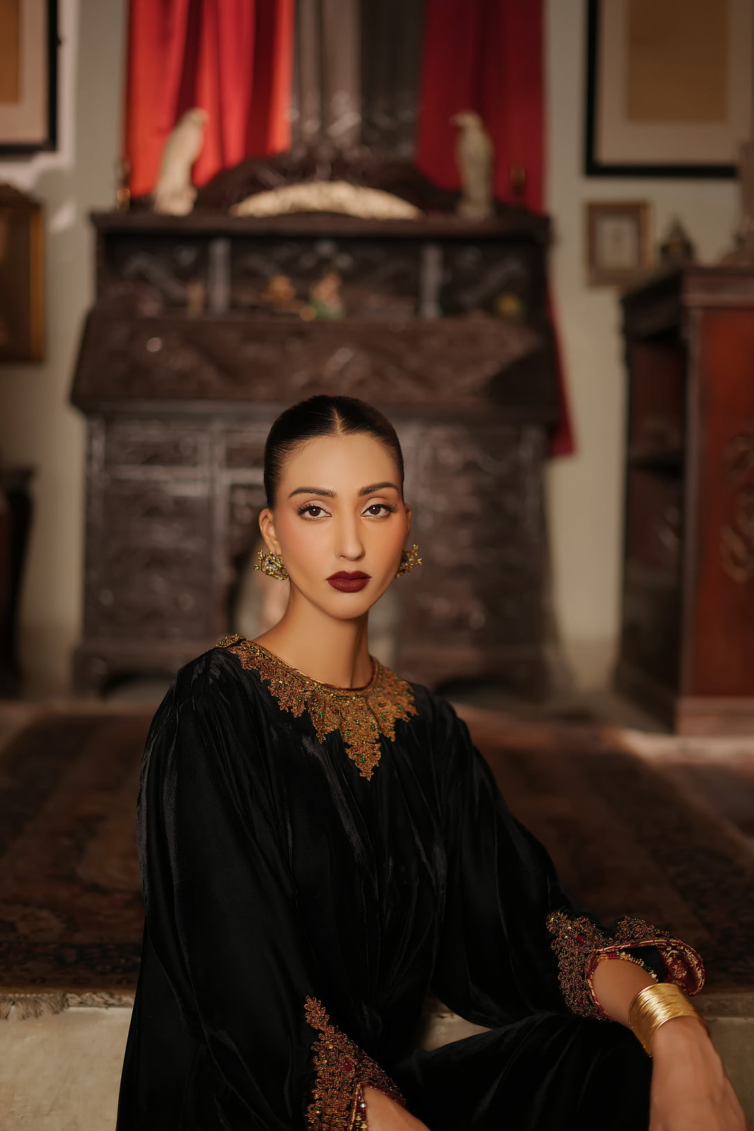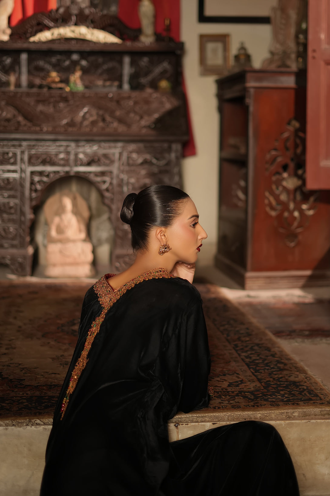 A luxurious velvet kaftan adorned with intricate Mughal marori work, further enhanced with delicate hand embellishments in beads and sequins. A perfect blend of tradition and sophistication, making it an elegant choice for festive occasions.