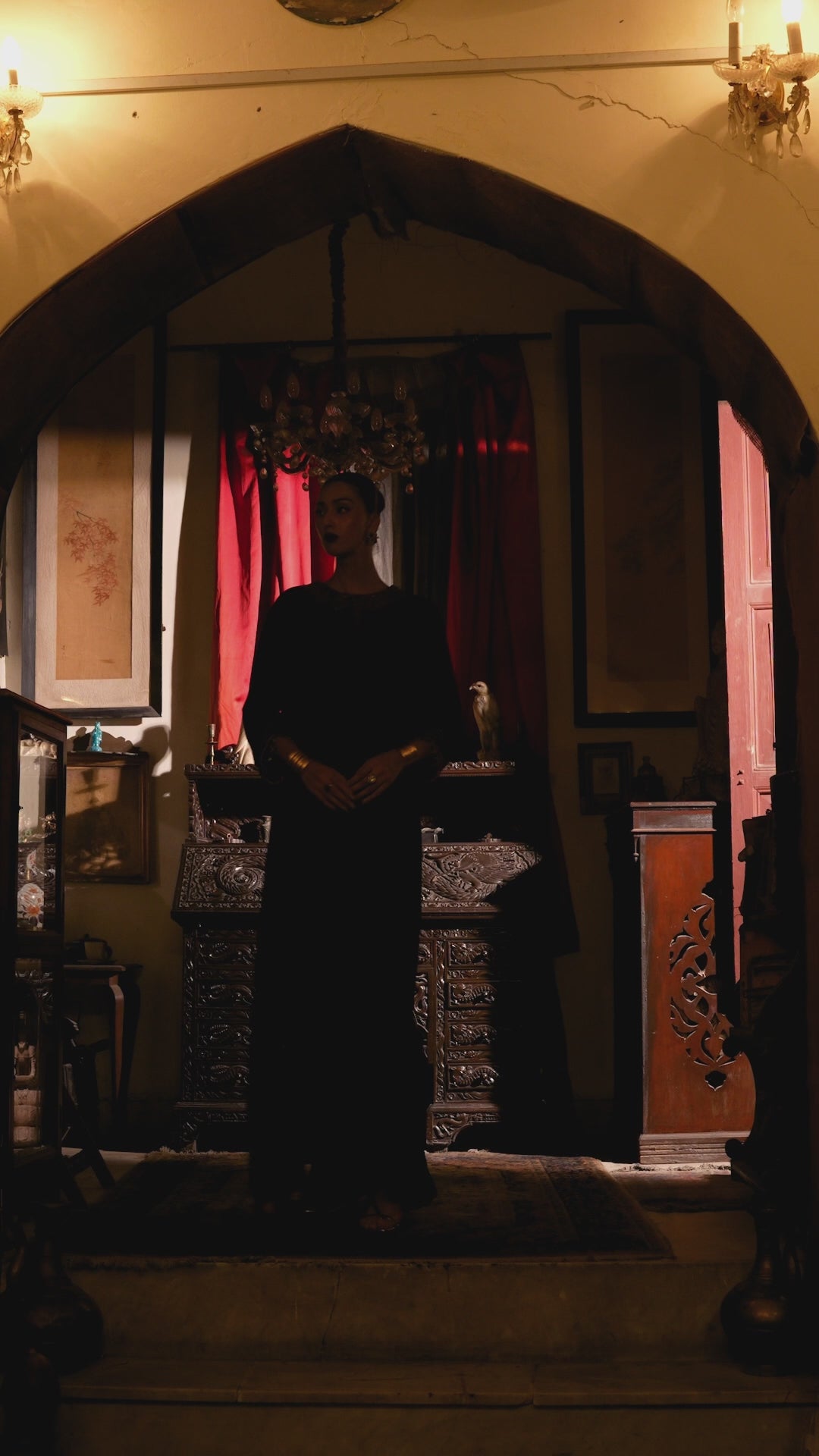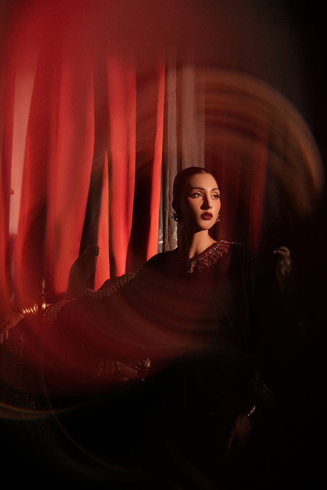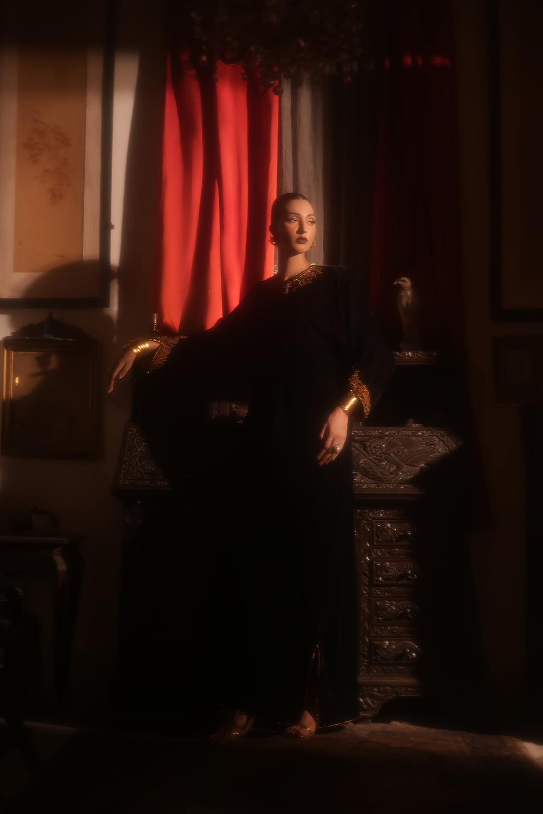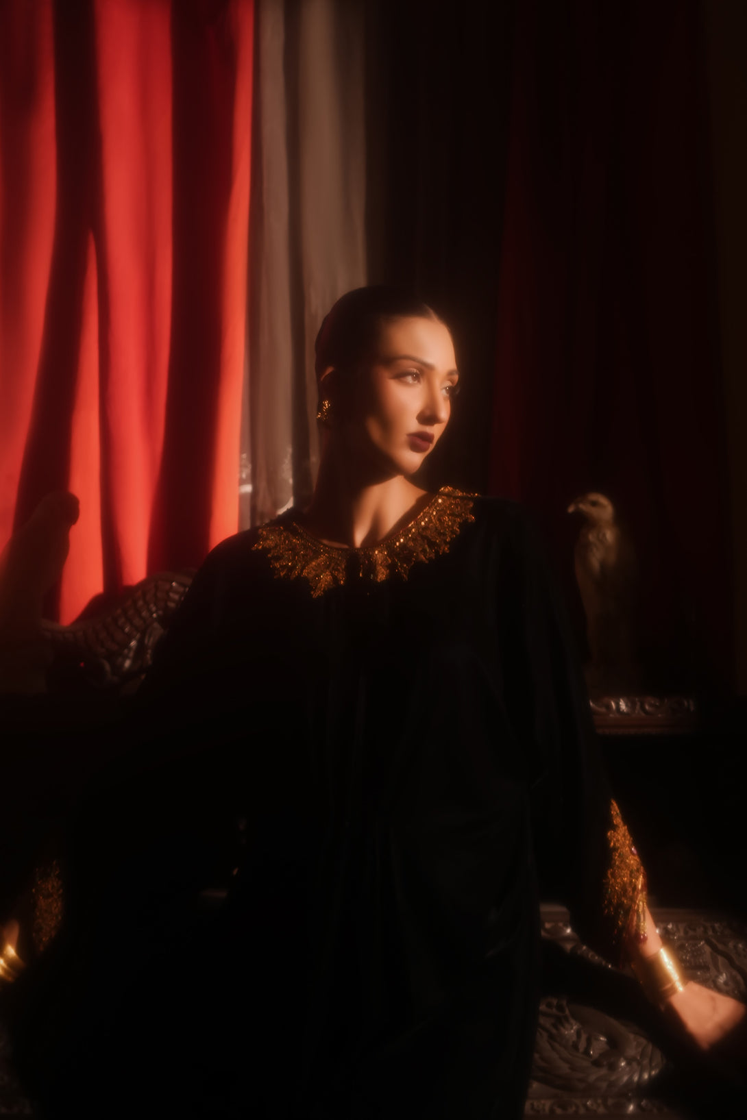 A luxurious velvet kaftan adorned with intricate Mughal marori work, further enhanced with delicate hand embellishments in beads and sequins. A perfect blend of tradition and sophistication, making it an elegant choice for festive occasions.