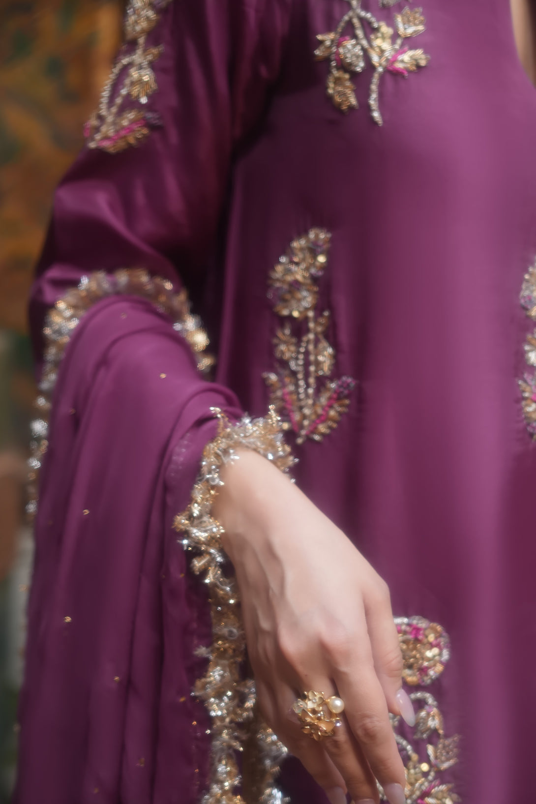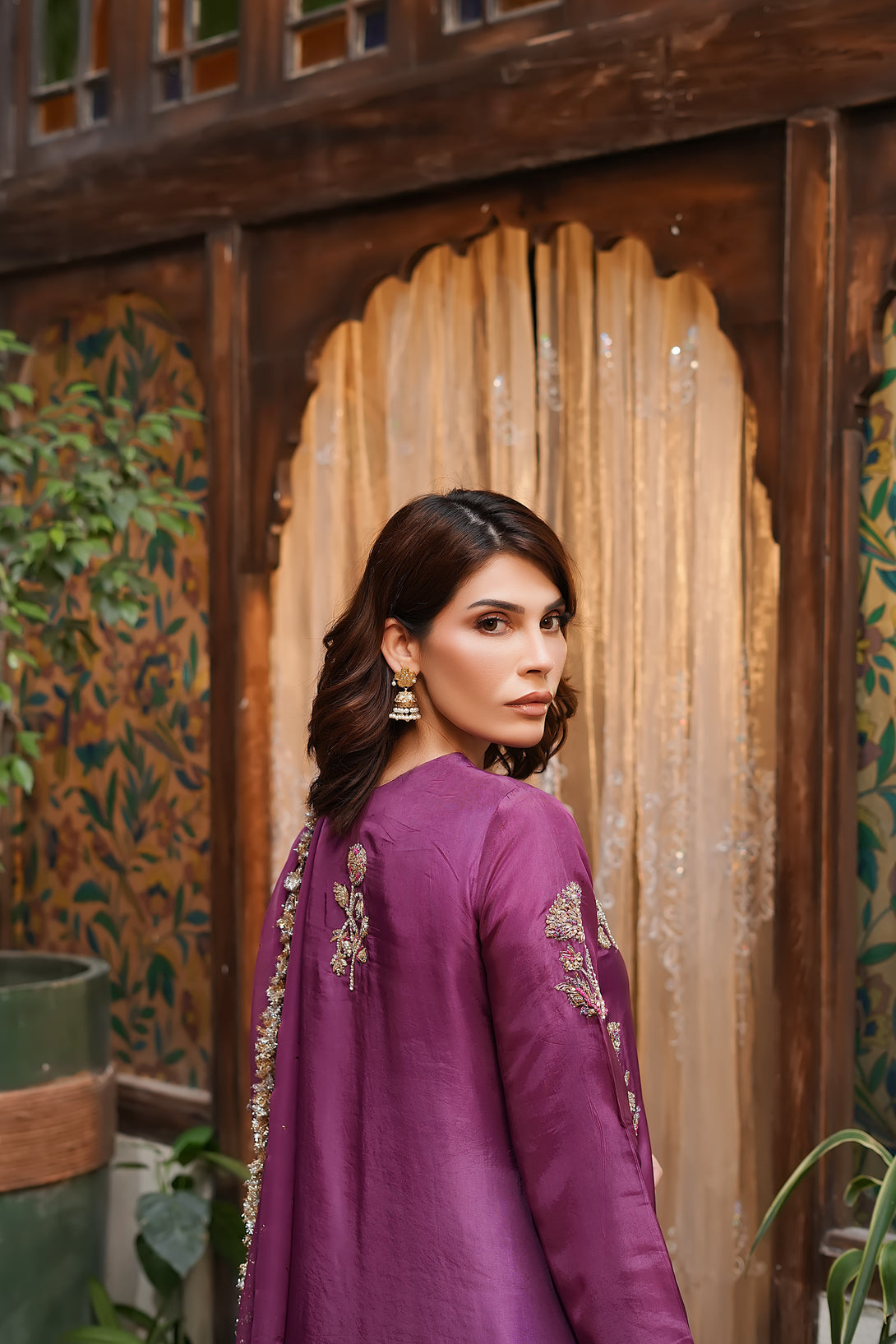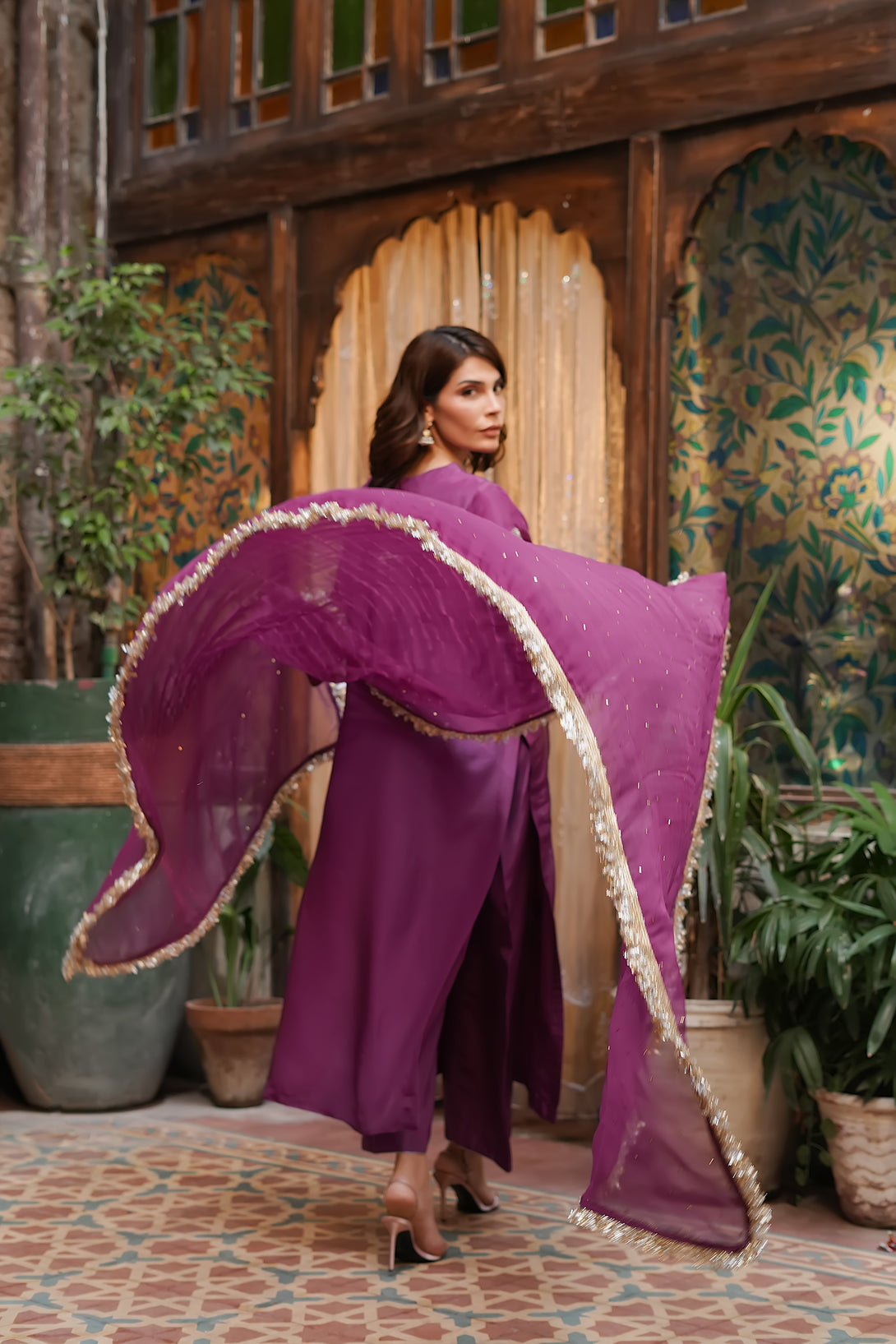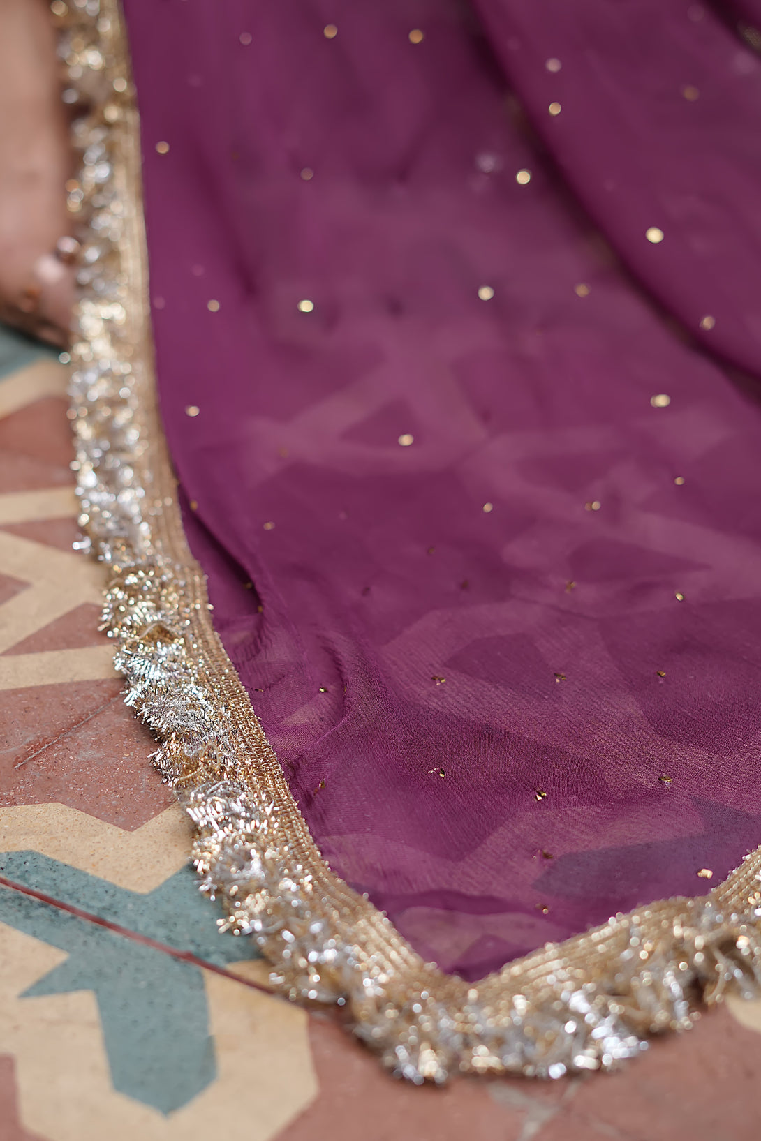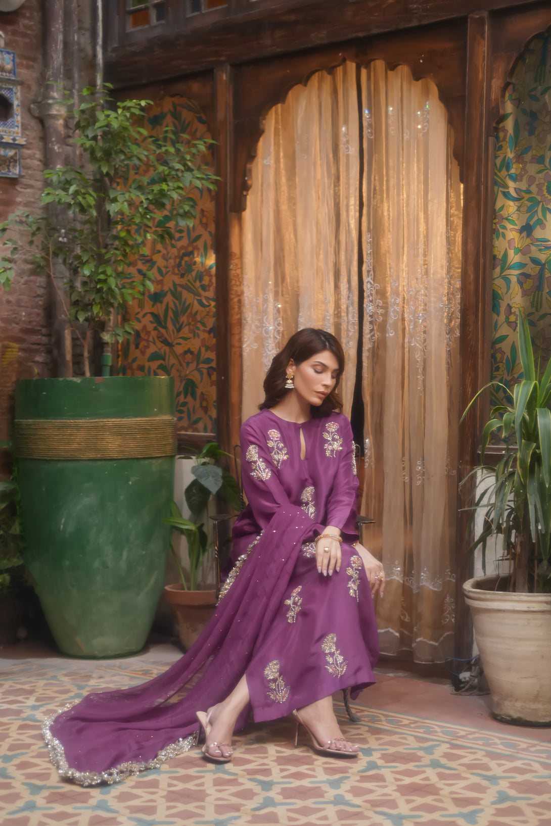 On a royal purple canvas, intricate Mughal motifs come to life through exquisite resham, zardozi, and pearl work, creating a truly regal look. Paired with a dupatta delicately dotted with mukesh and finished with classic kiran edging, this ensemble embodies timeless elegance with a touch of old-world charm.