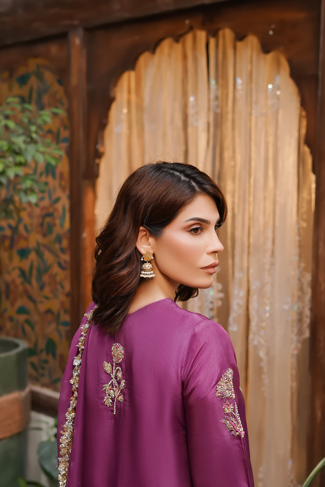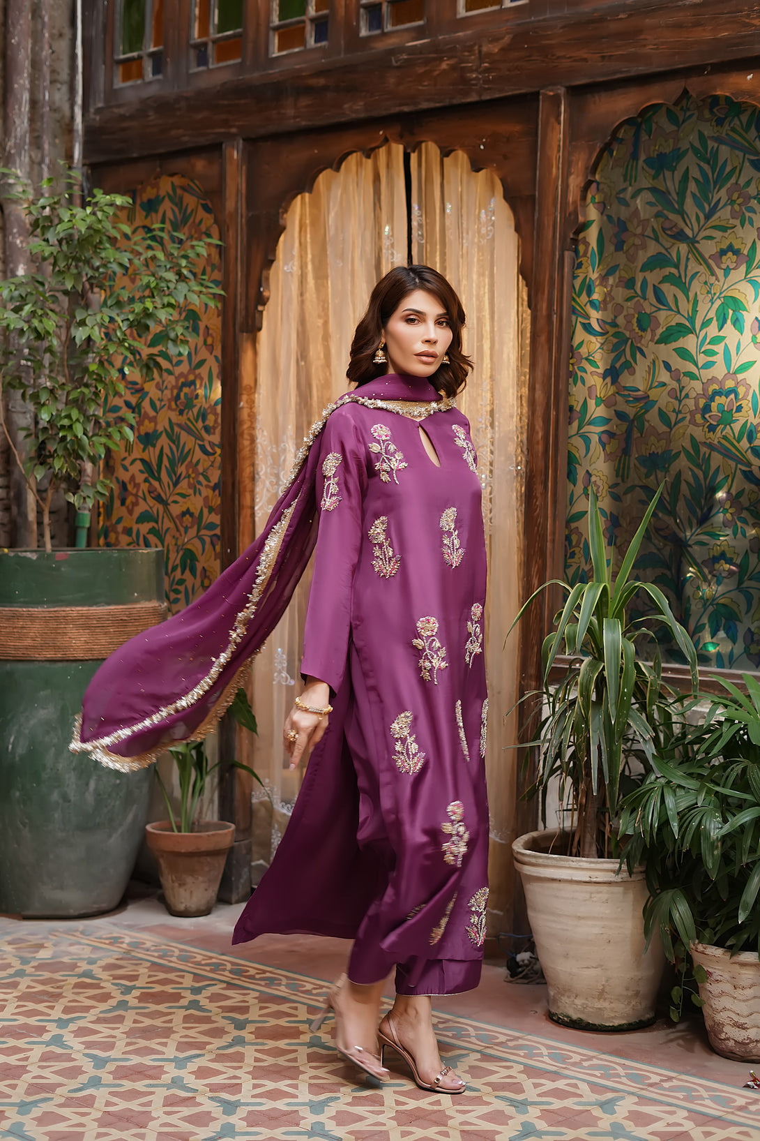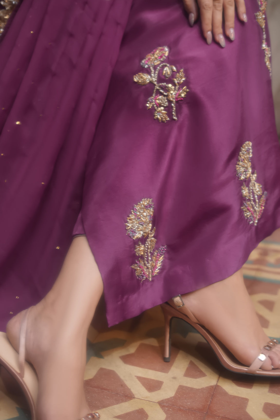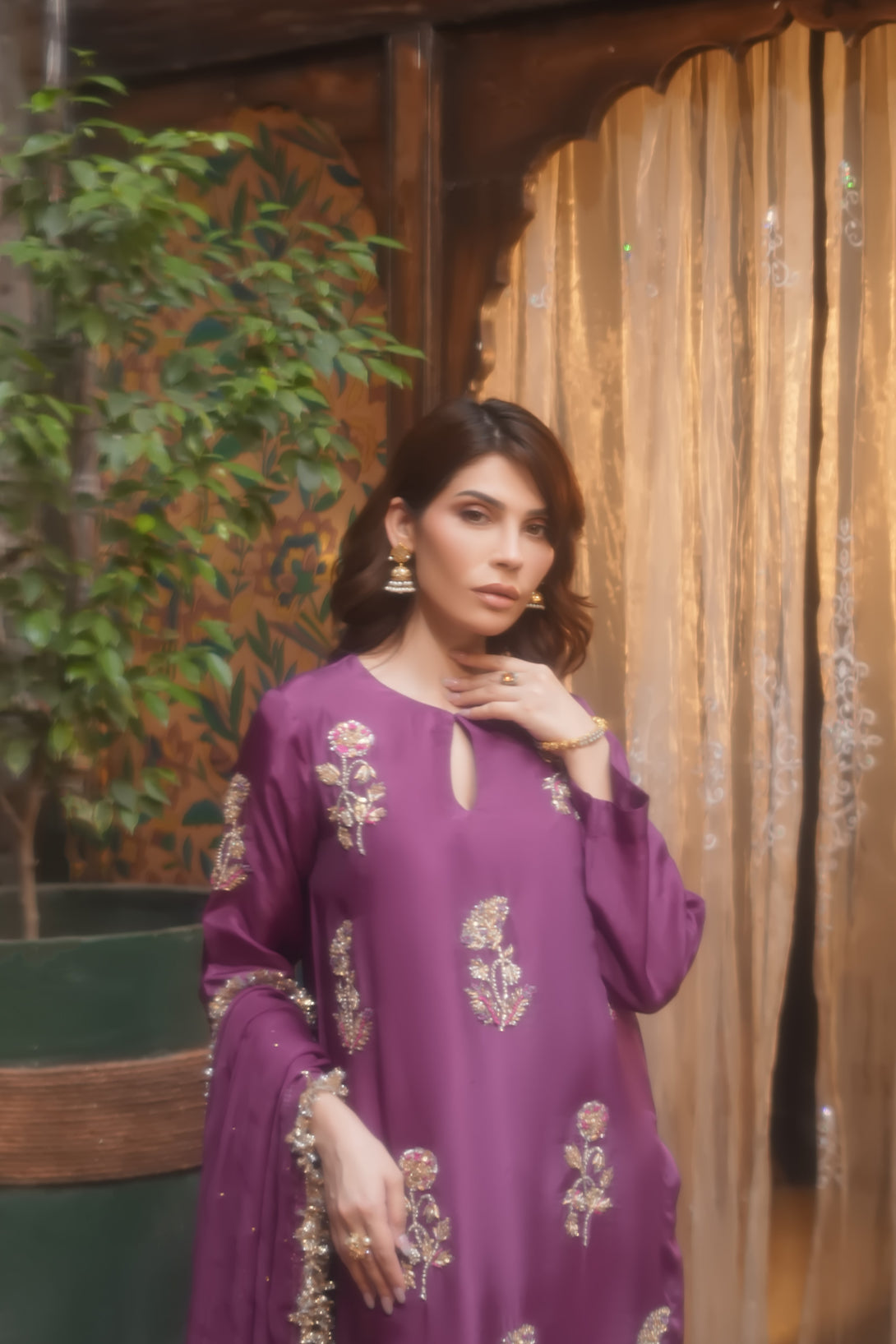 On a royal purple canvas, intricate Mughal motifs come to life through exquisite resham, zardozi, and pearl work, creating a truly regal look. Paired with a dupatta delicately dotted with mukesh and finished with classic kiran edging, this ensemble embodies timeless elegance with a touch of old-world charm.