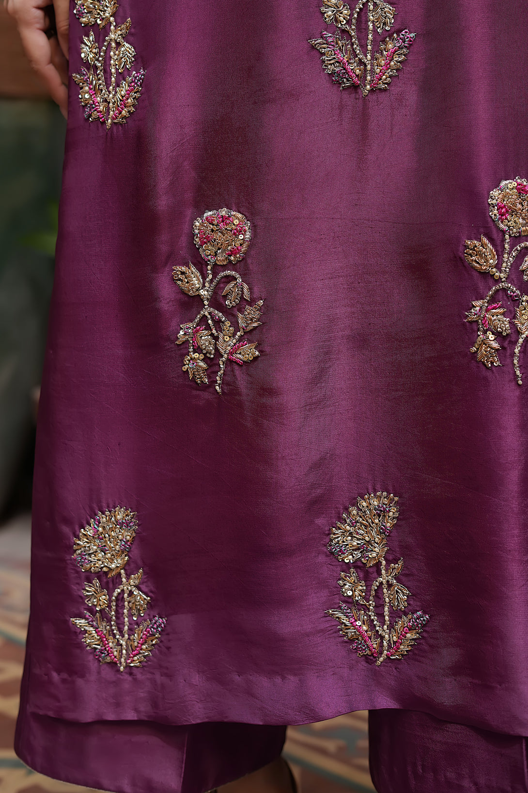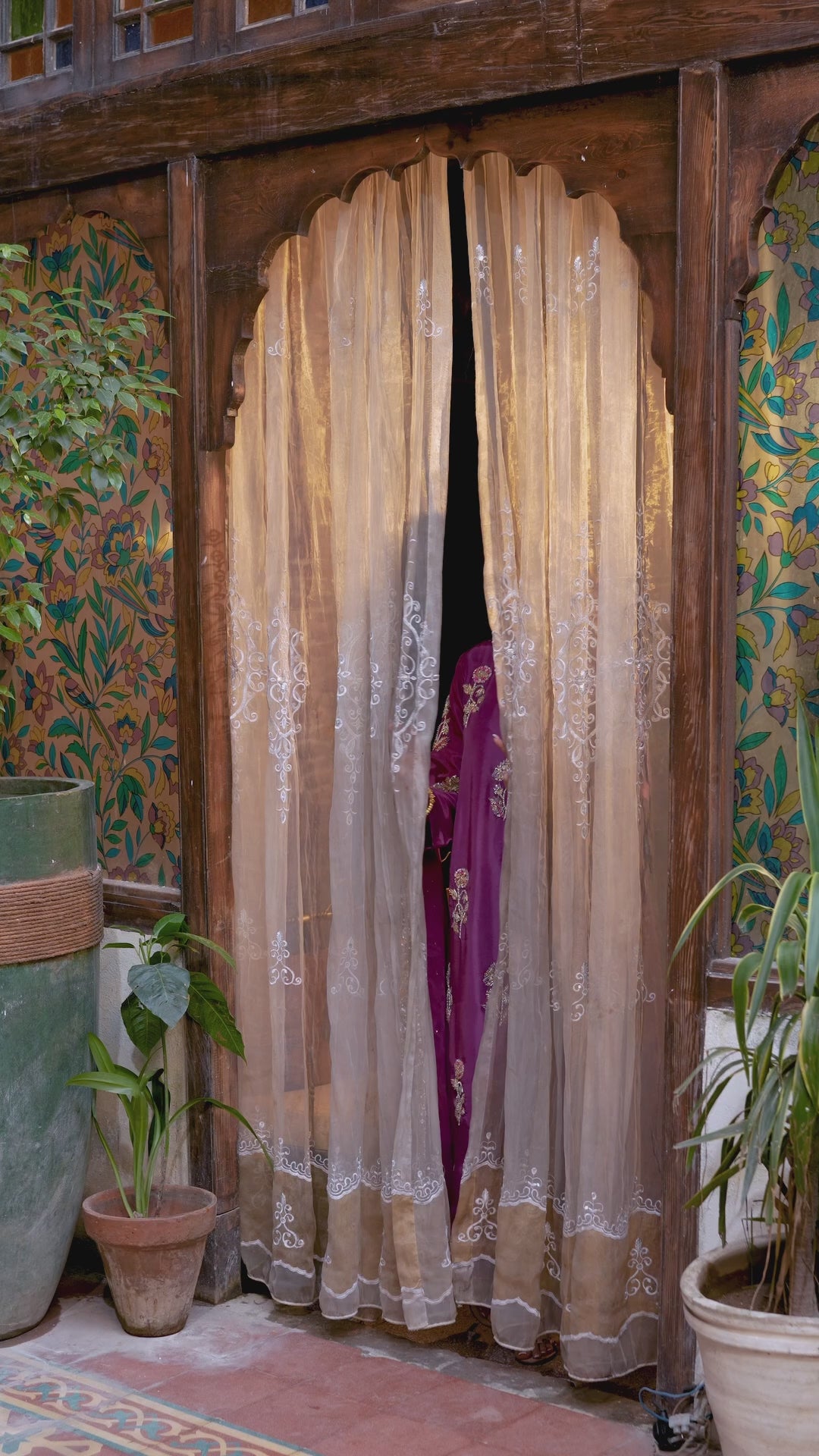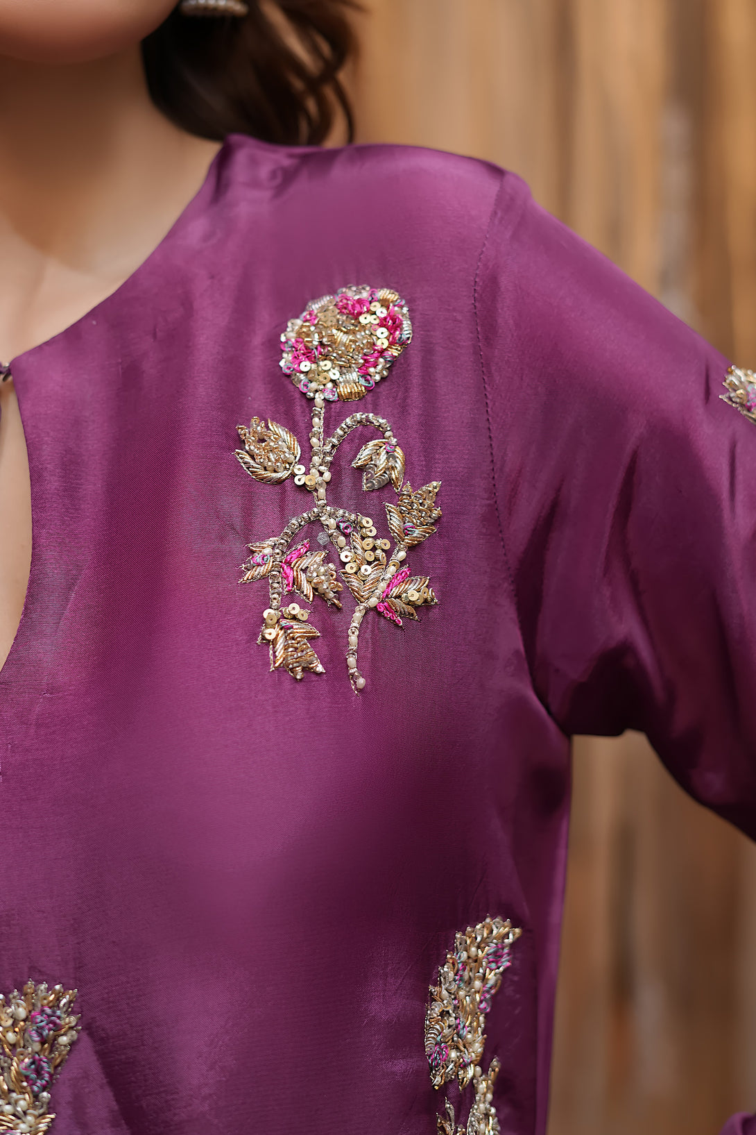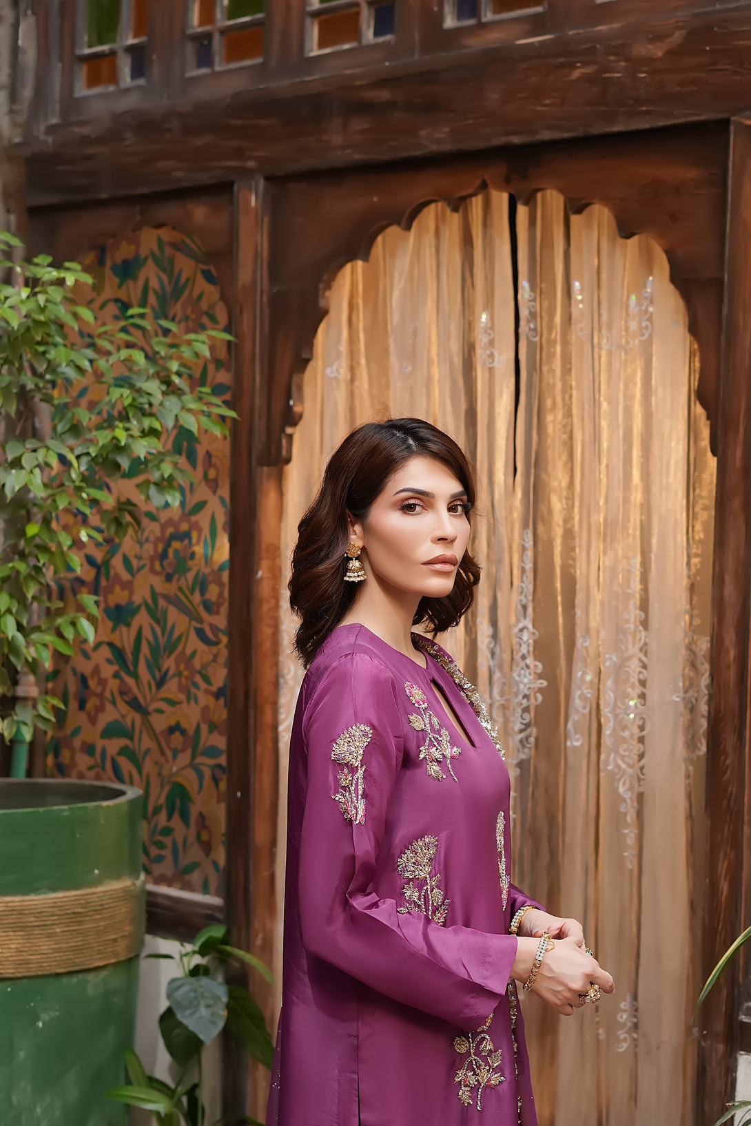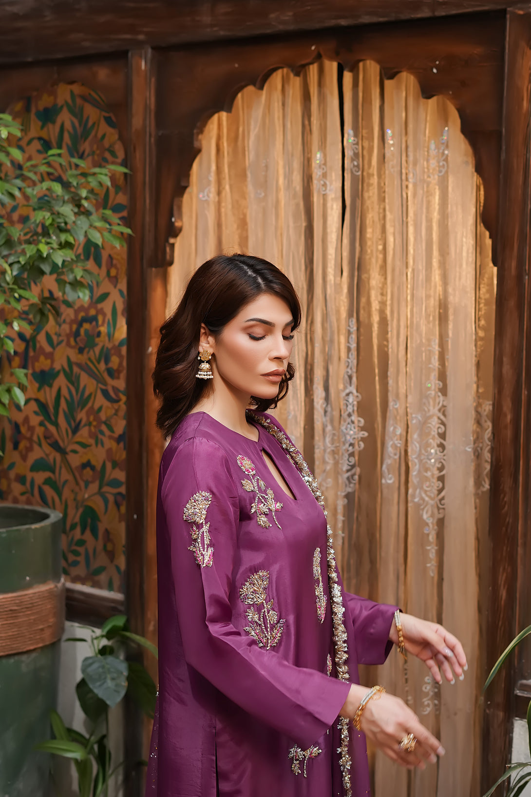 On a royal purple canvas, intricate Mughal motifs come to life through exquisite resham, zardozi, and pearl work, creating a truly regal look. Paired with a dupatta delicately dotted with mukesh and finished with classic kiran edging, this ensemble embodies timeless elegance with a touch of old-world charm.