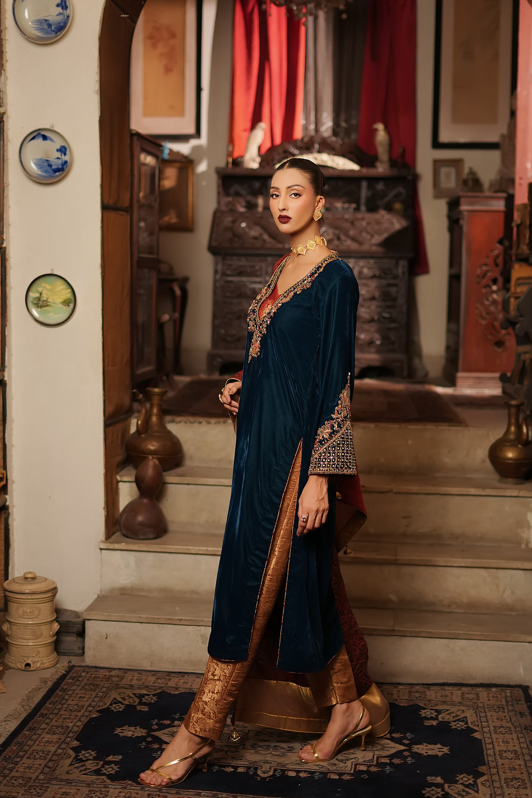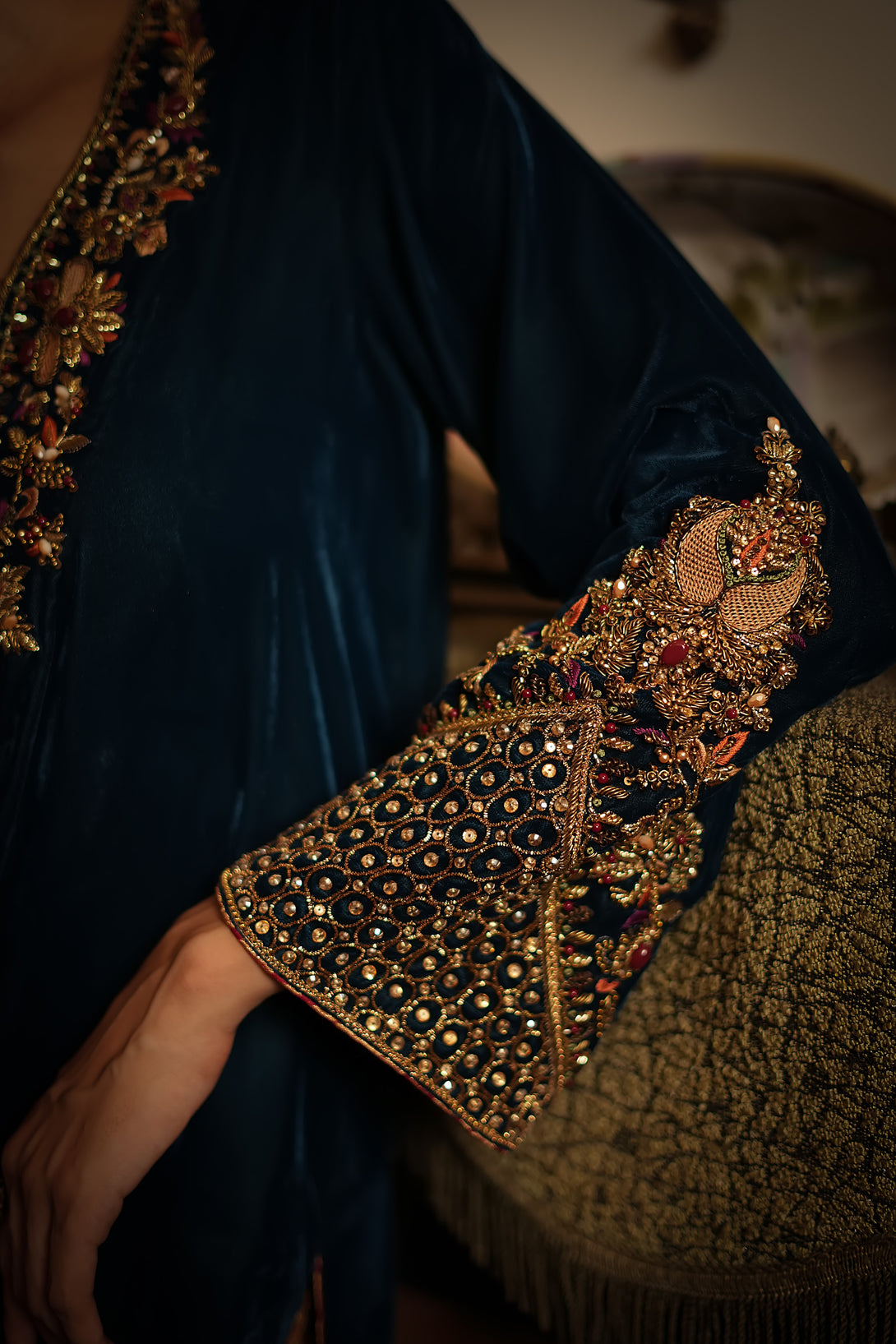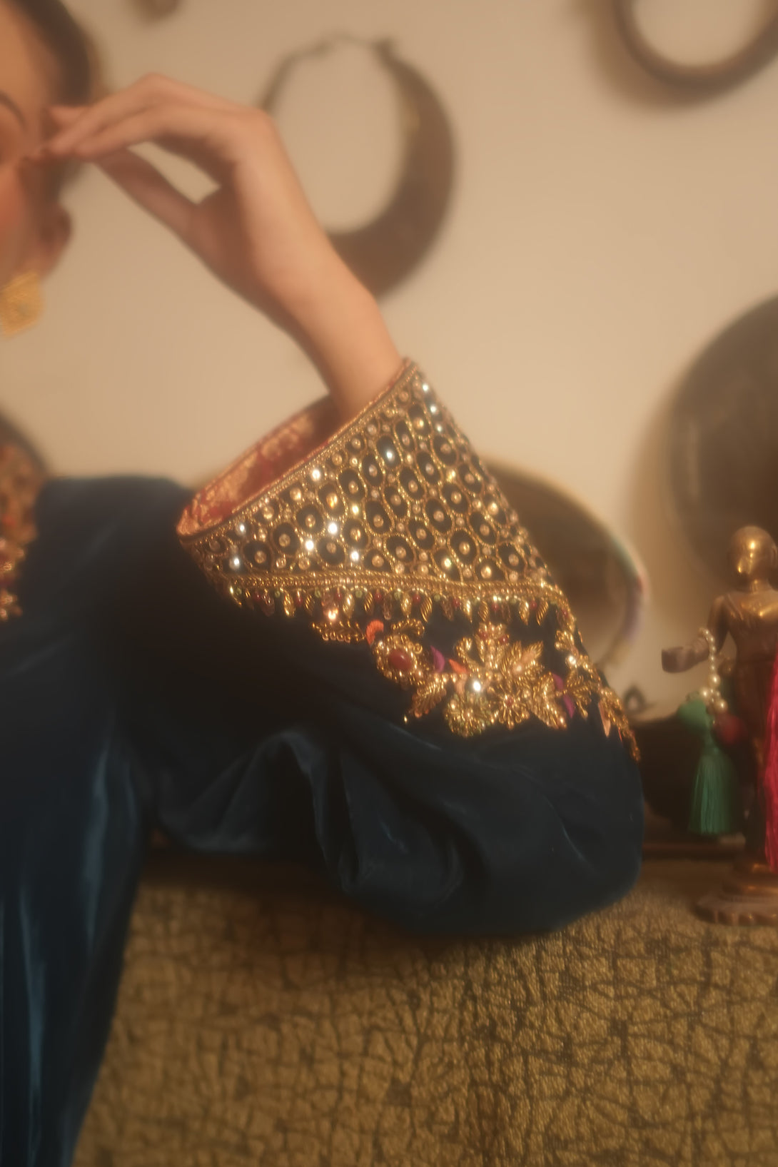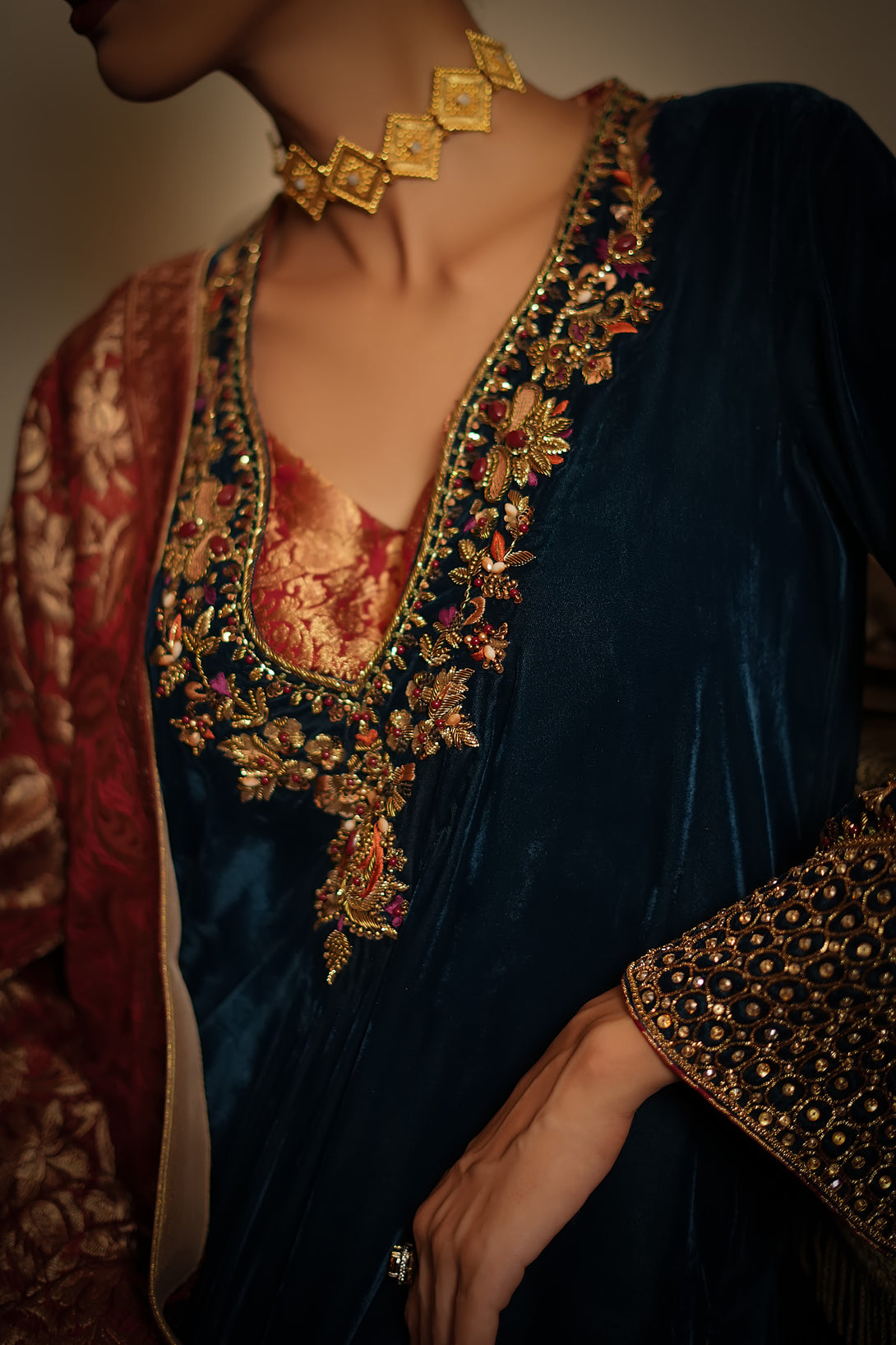 A beautiful and luxurious teal velvet ensemble, entirely handcrafted with exquisite zardozi, sequins, beads, and resham work. Paired with gold jamavar pants and a maroon jamavar blouse, this look exudes timeless elegance and regal charm.