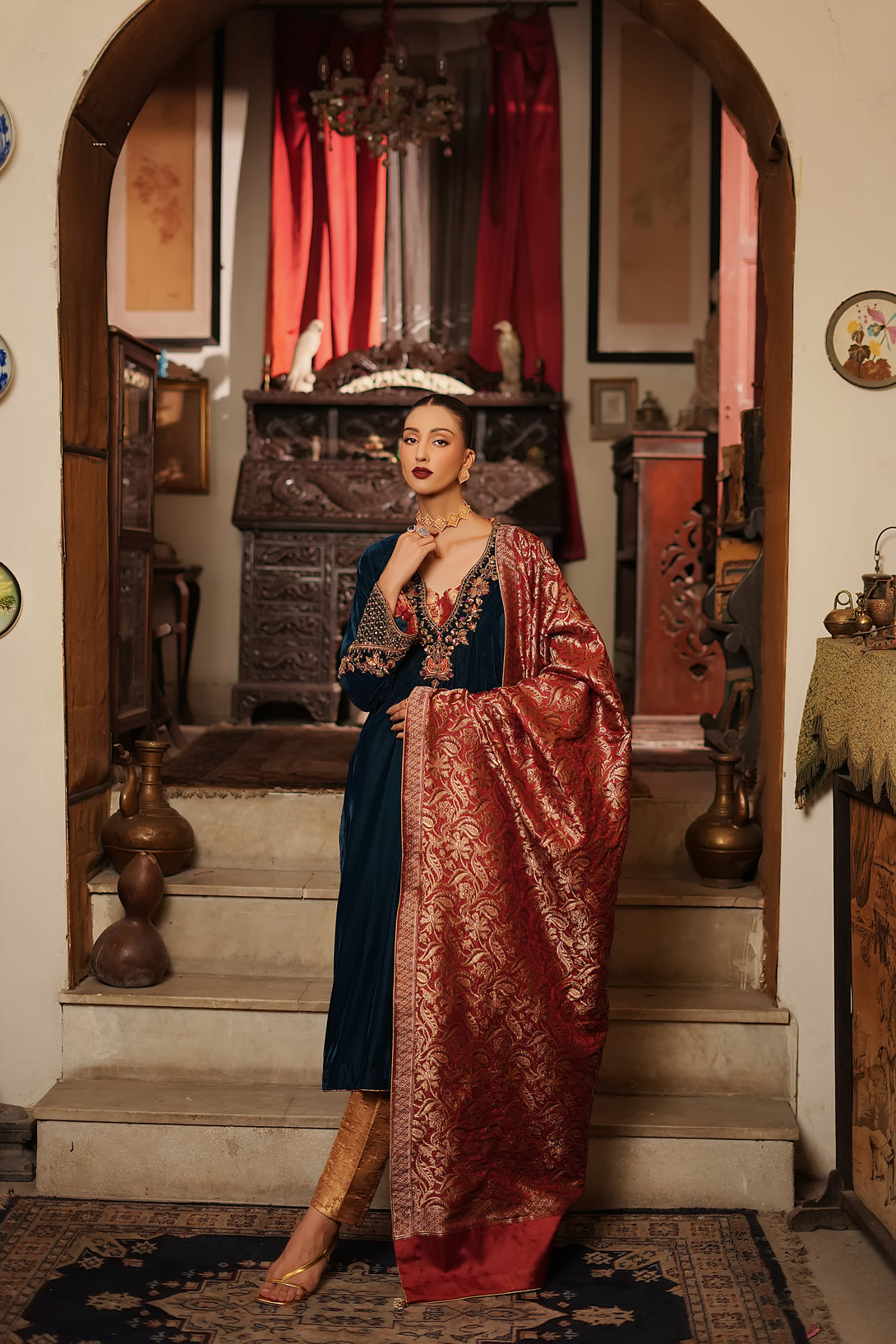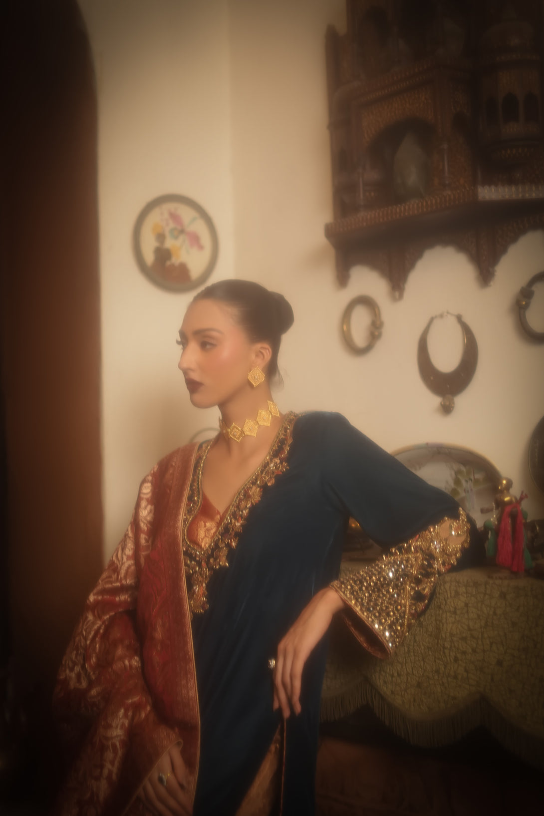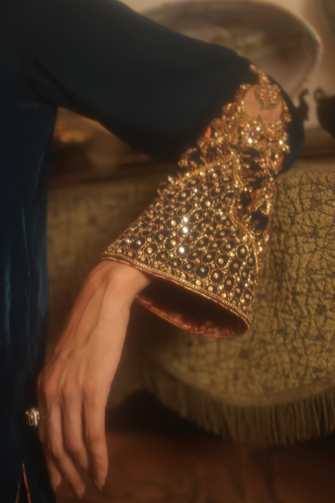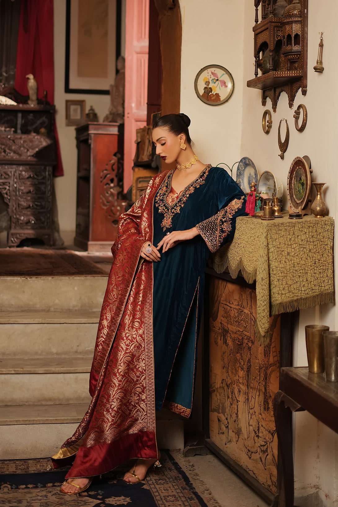 A beautiful and luxurious teal velvet ensemble, entirely handcrafted with exquisite zardozi, sequins, beads, and resham work. Paired with gold jamavar pants and a maroon jamavar blouse, this look exudes timeless elegance and regal charm.
