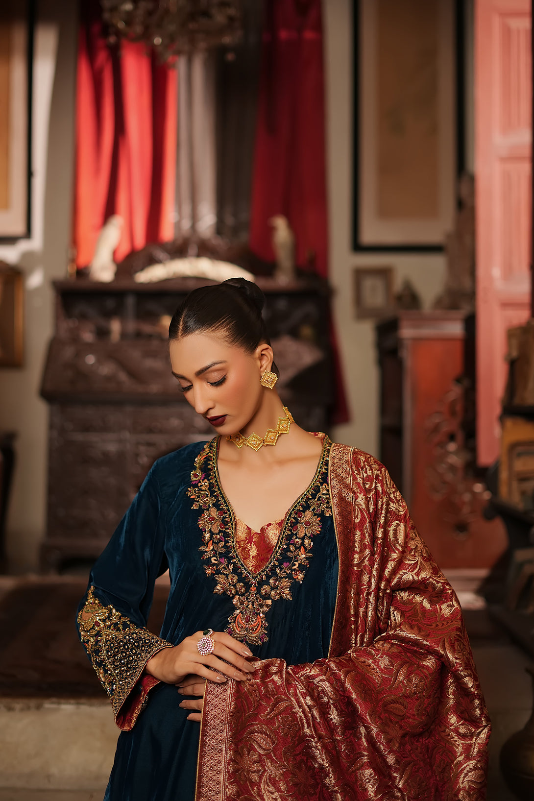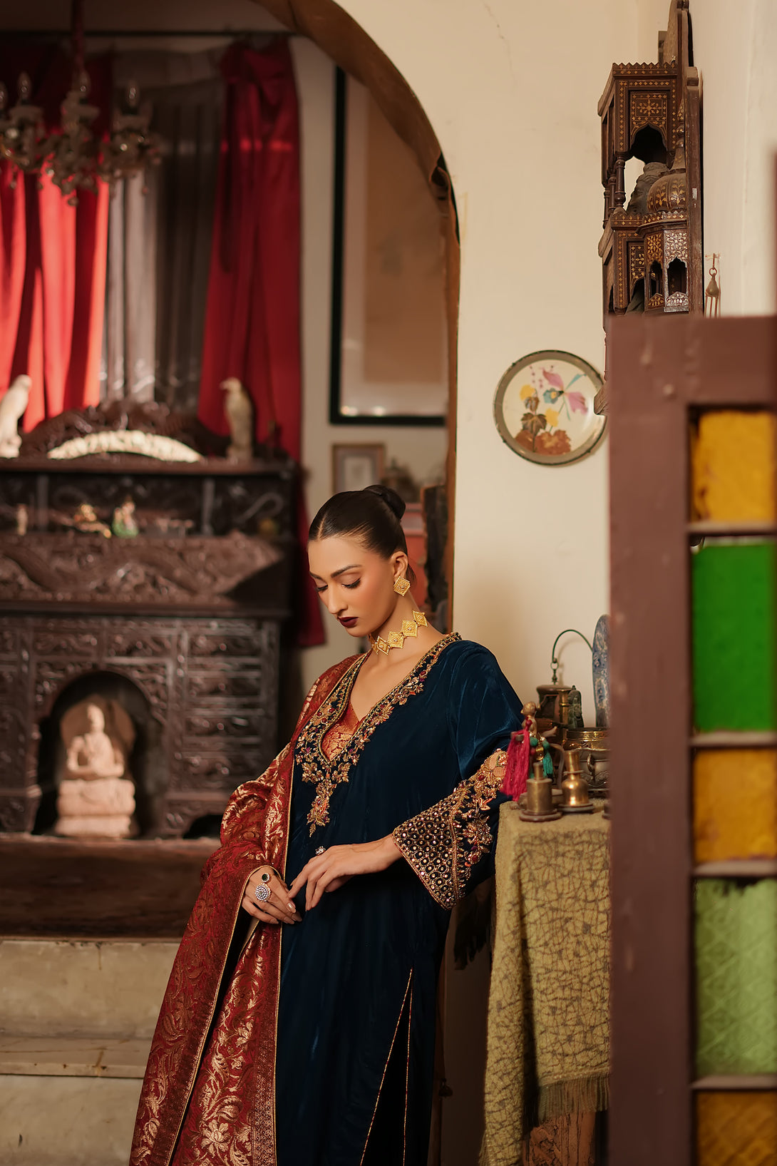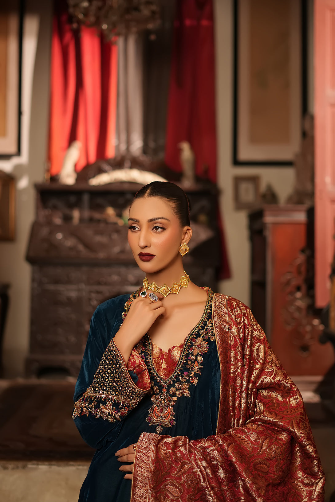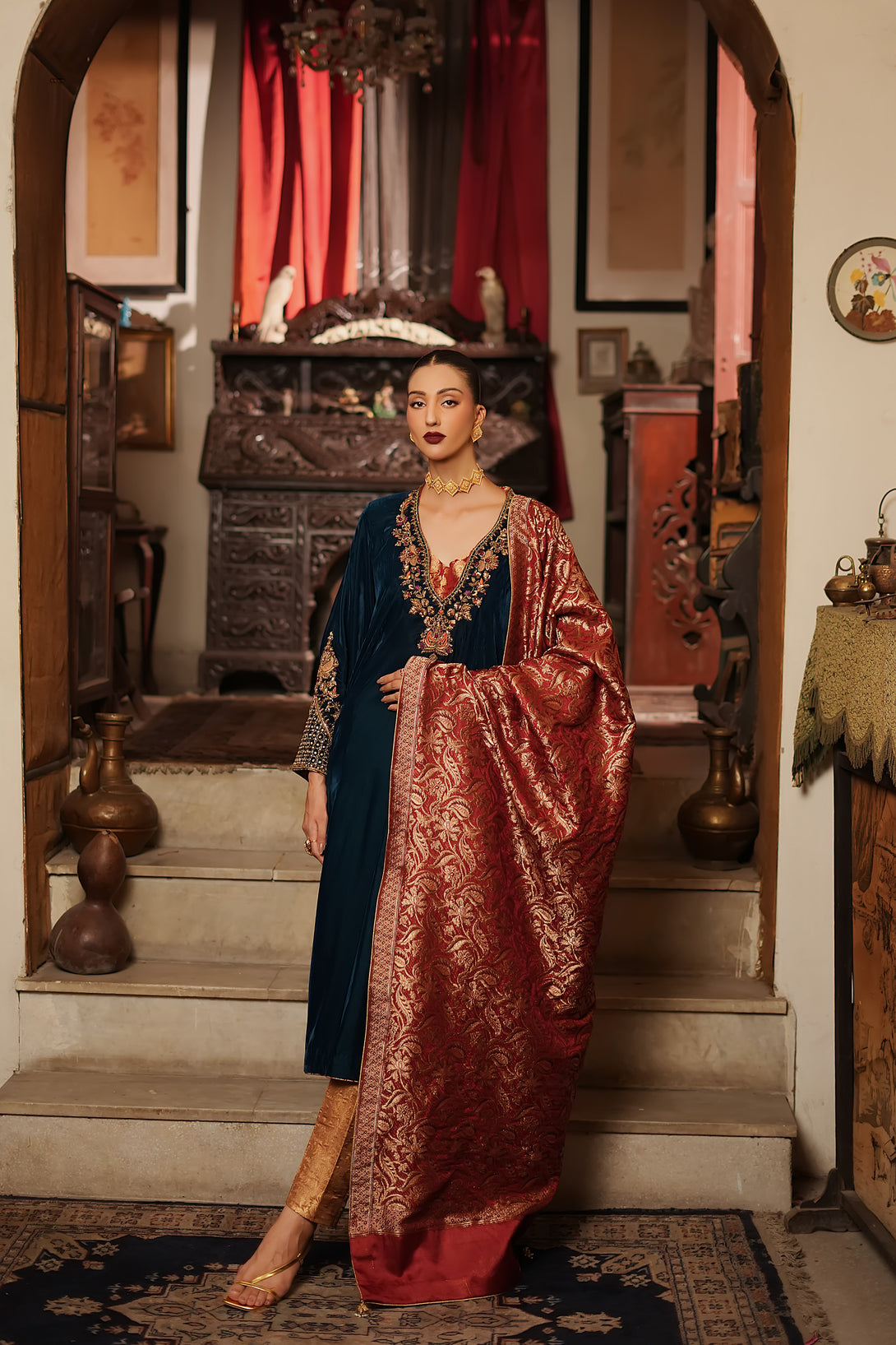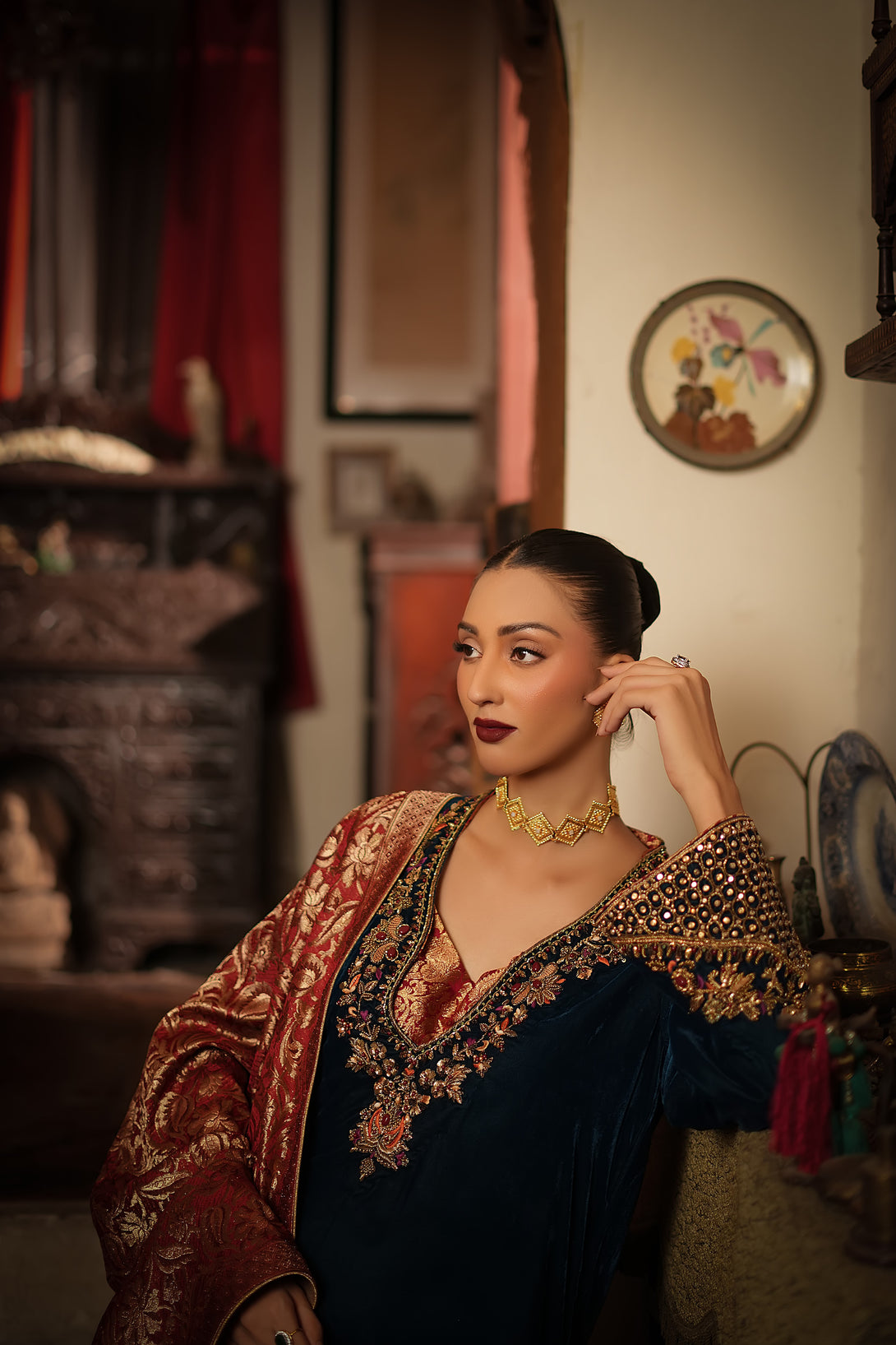 A beautiful and luxurious teal velvet ensemble, entirely handcrafted with exquisite zardozi, sequins, beads, and resham work. Paired with gold jamavar pants and a maroon jamavar blouse, this look exudes timeless elegance and regal charm.