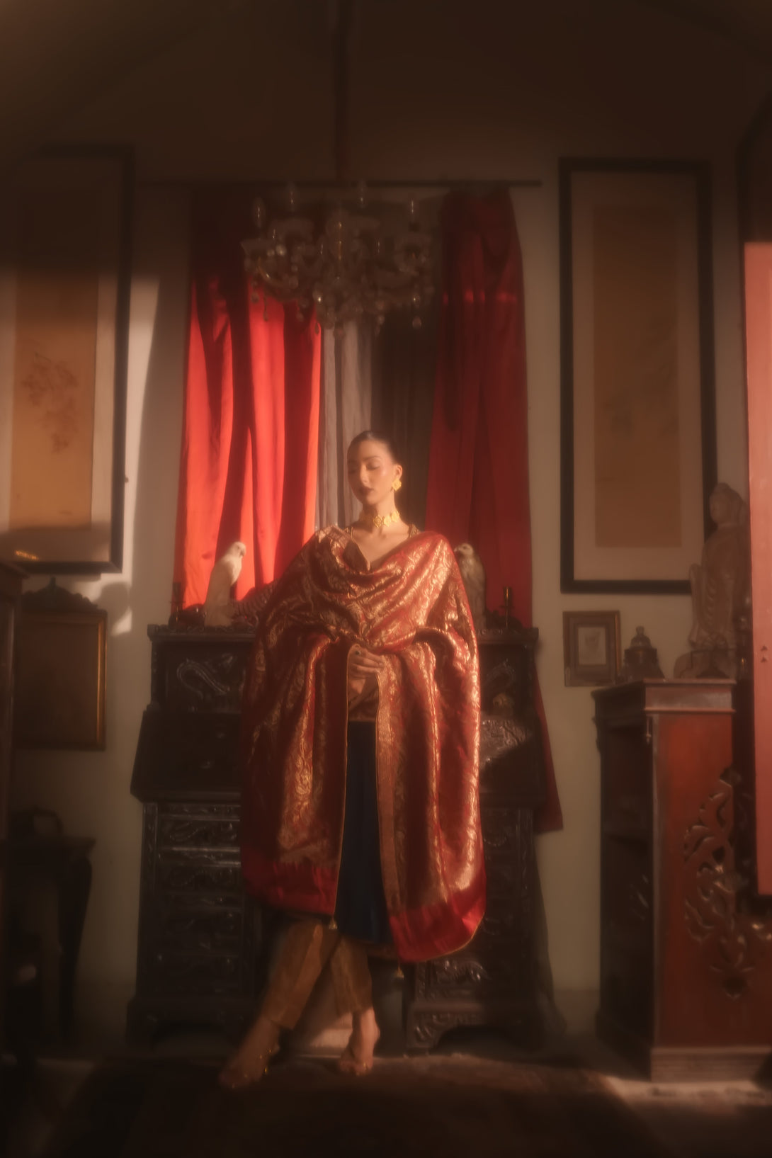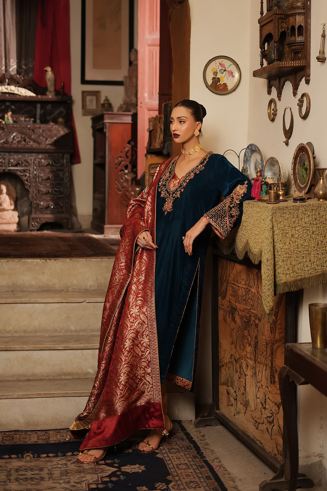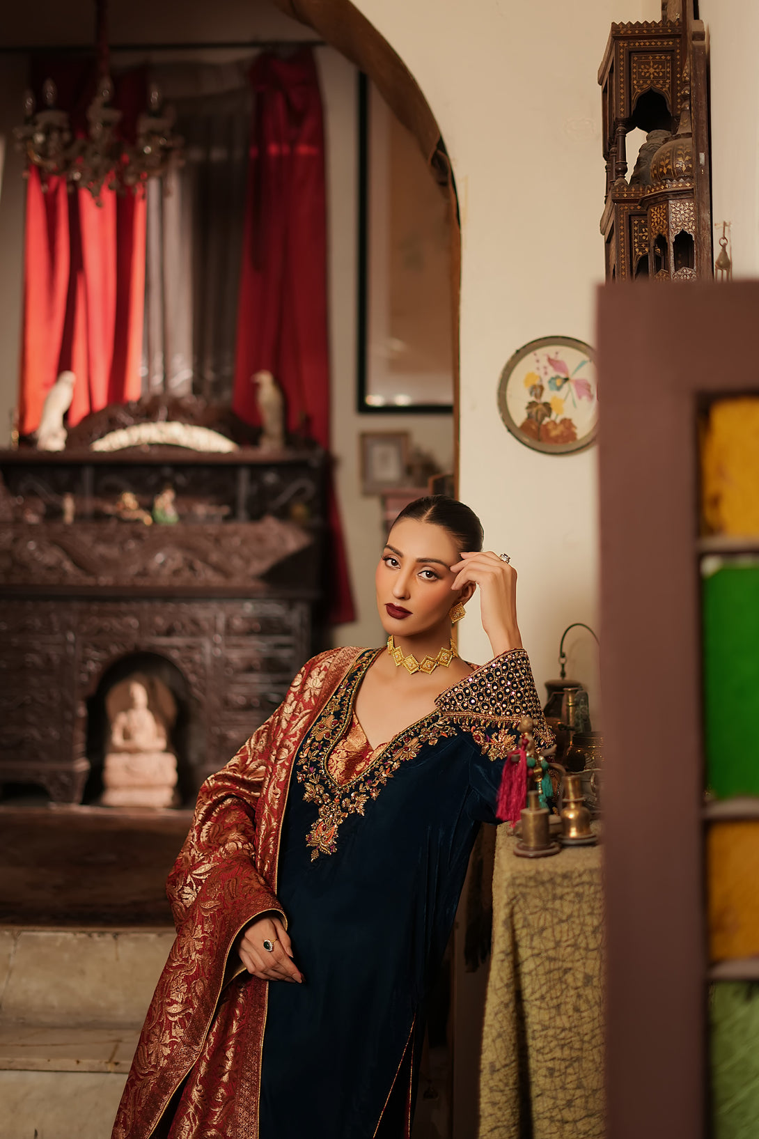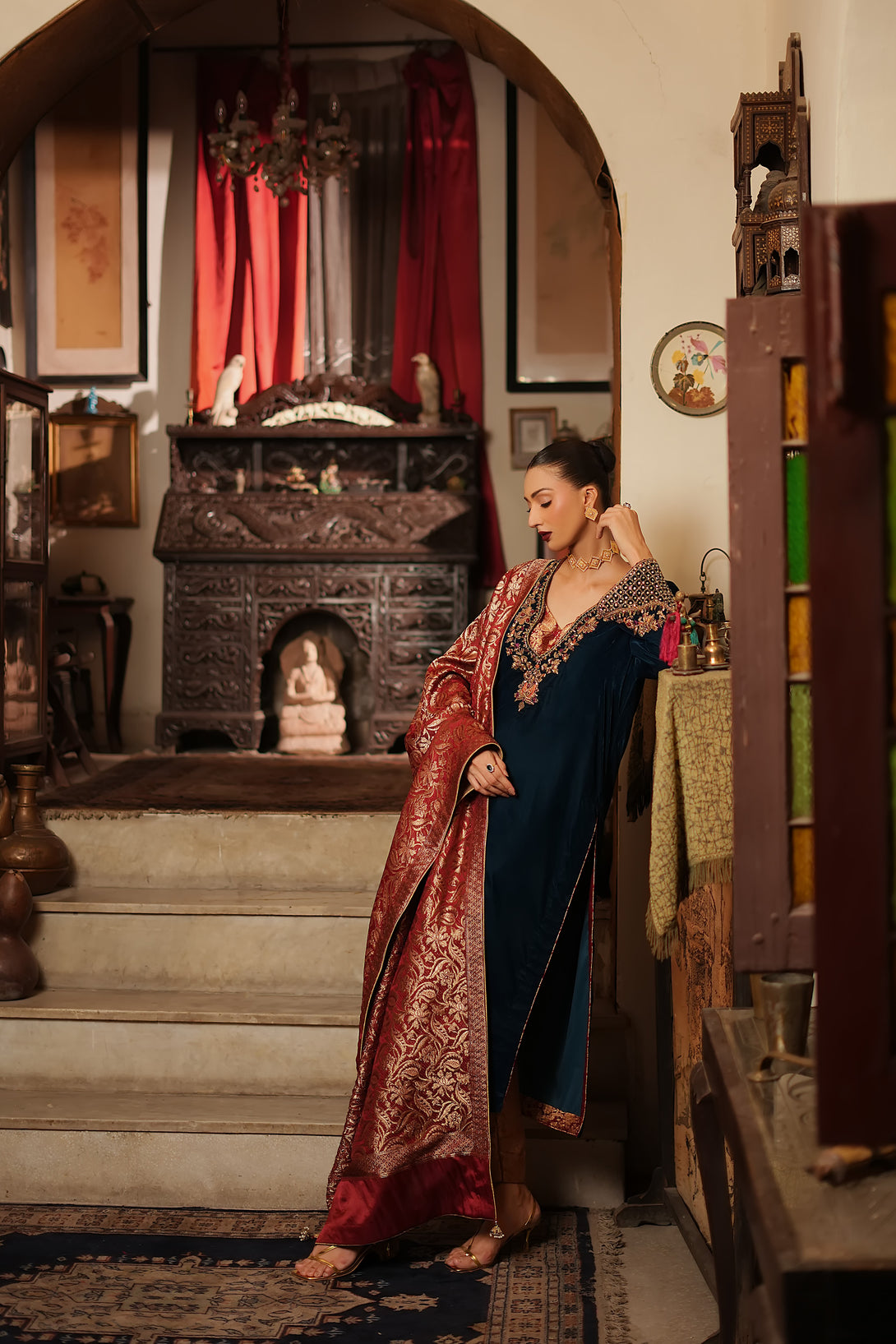 A beautiful and luxurious teal velvet ensemble, entirely handcrafted with exquisite zardozi, sequins, beads, and resham work. Paired with gold jamavar pants and a maroon jamavar blouse, this look exudes timeless elegance and regal charm.