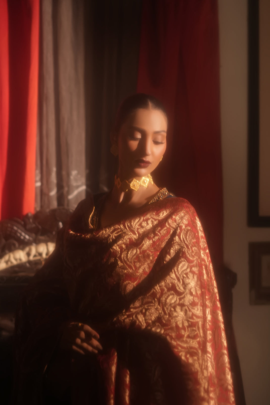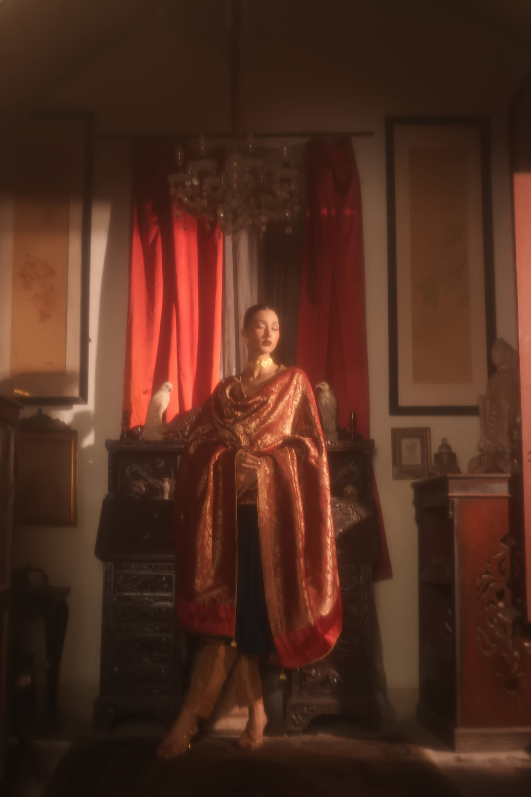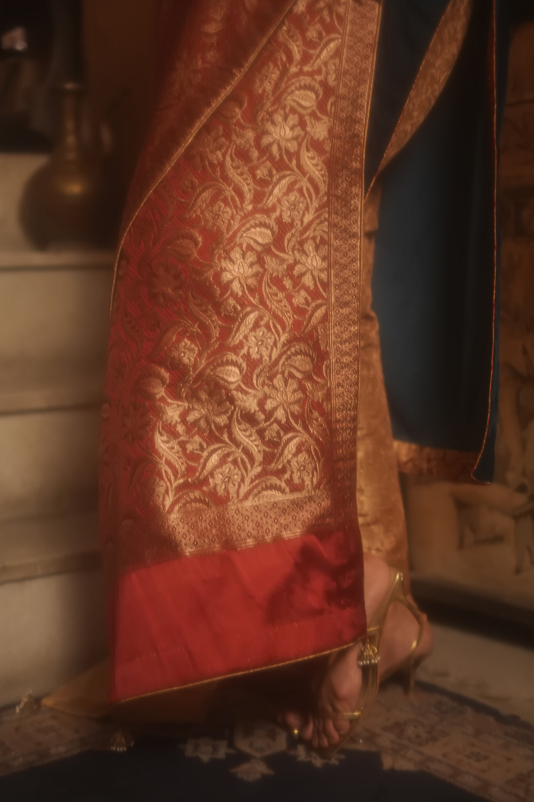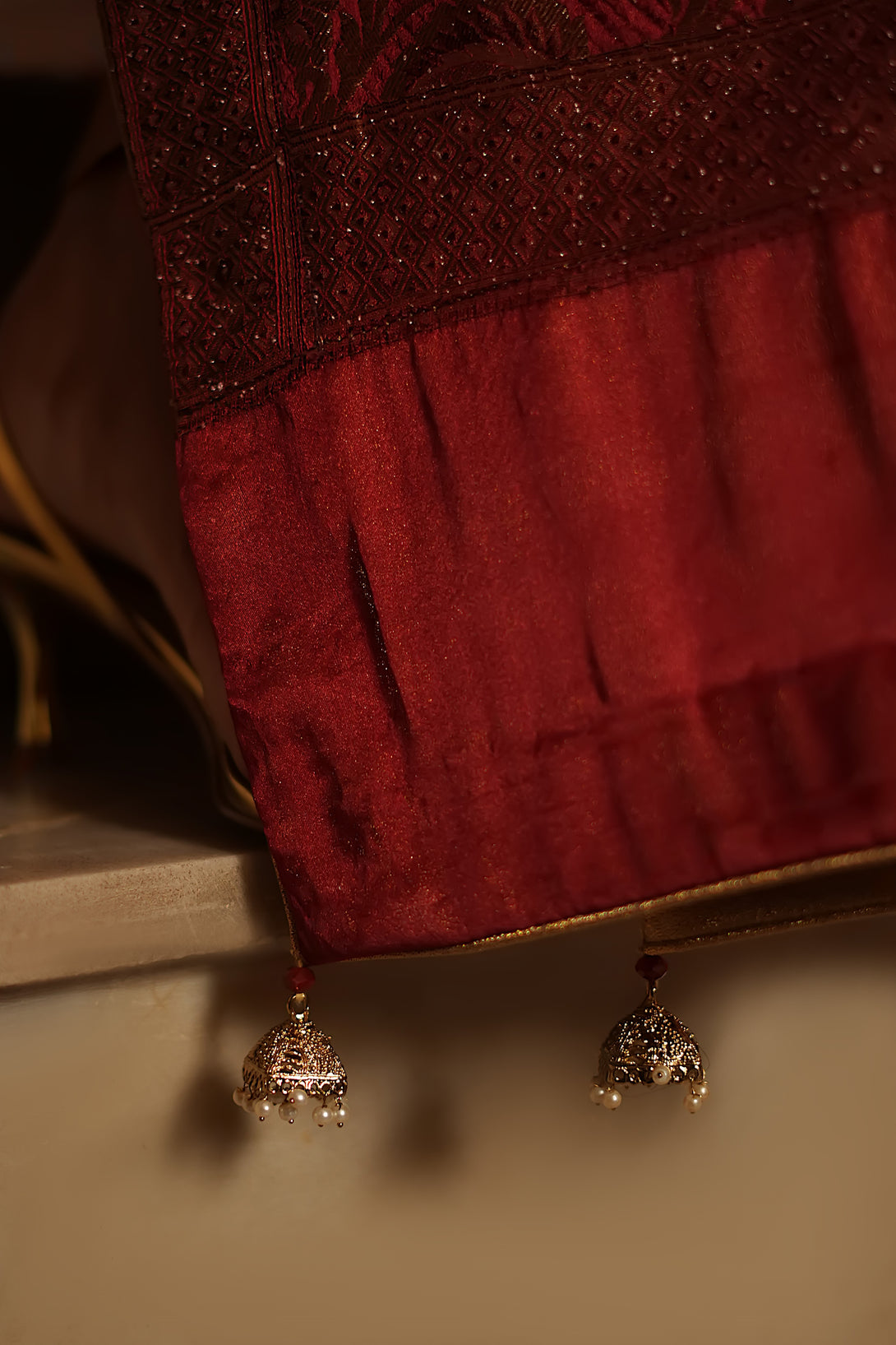 A beautiful and luxurious teal velvet ensemble, entirely handcrafted with exquisite zardozi, sequins, beads, and resham work. Paired with gold jamavar pants and a maroon jamavar blouse, this look exudes timeless elegance and regal charm.