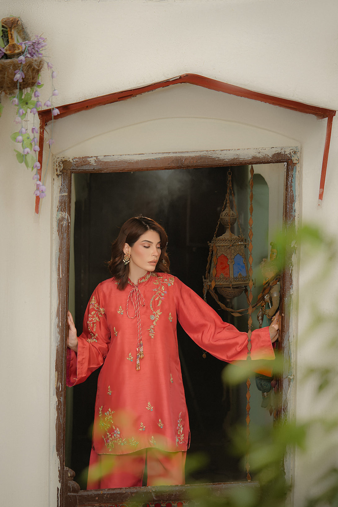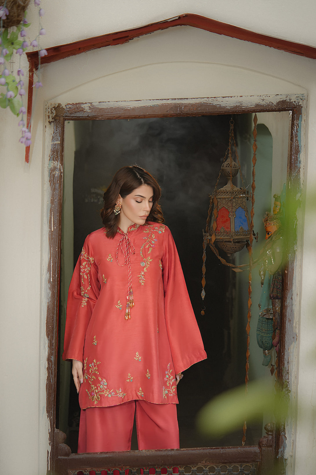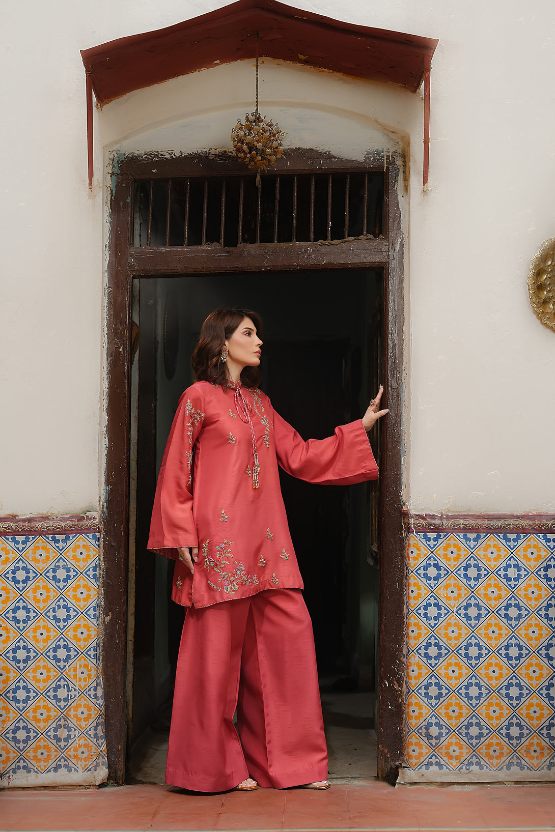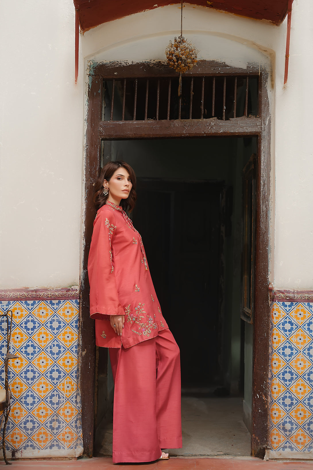 A graceful two-piece ensemble in coral Korean raw silk, featuring intricate resham, zardozi, and beadwork that adds rich texture and depth. The short shirt paired with flared pants and delicate tassel details creates an effortlessly elegant look, perfect for festive soirées.