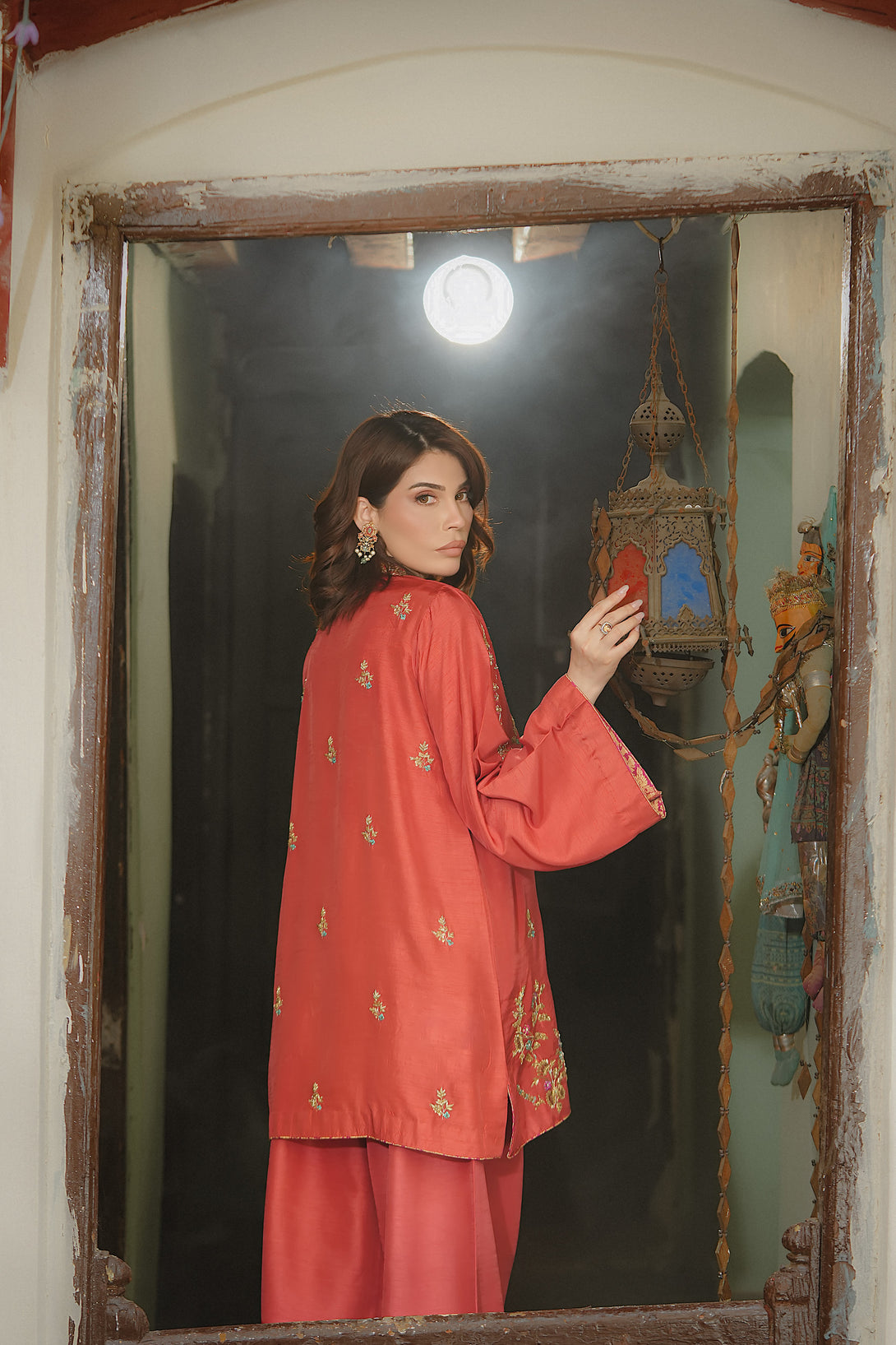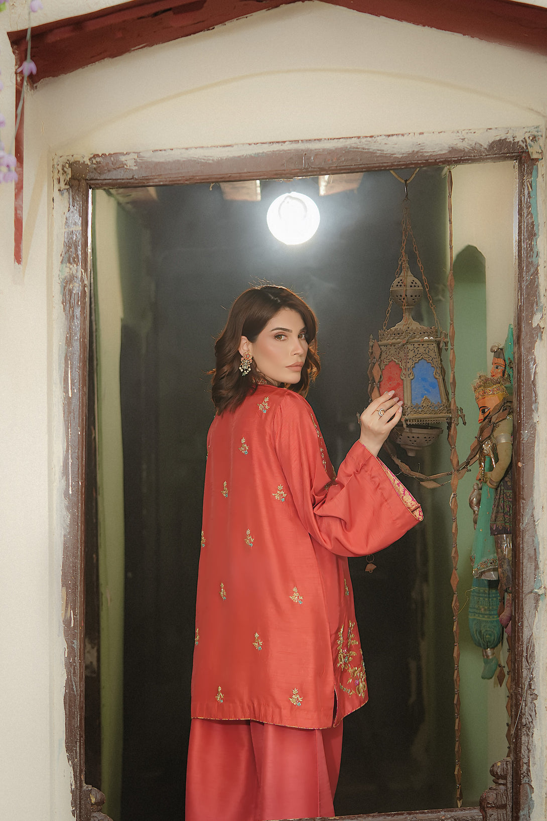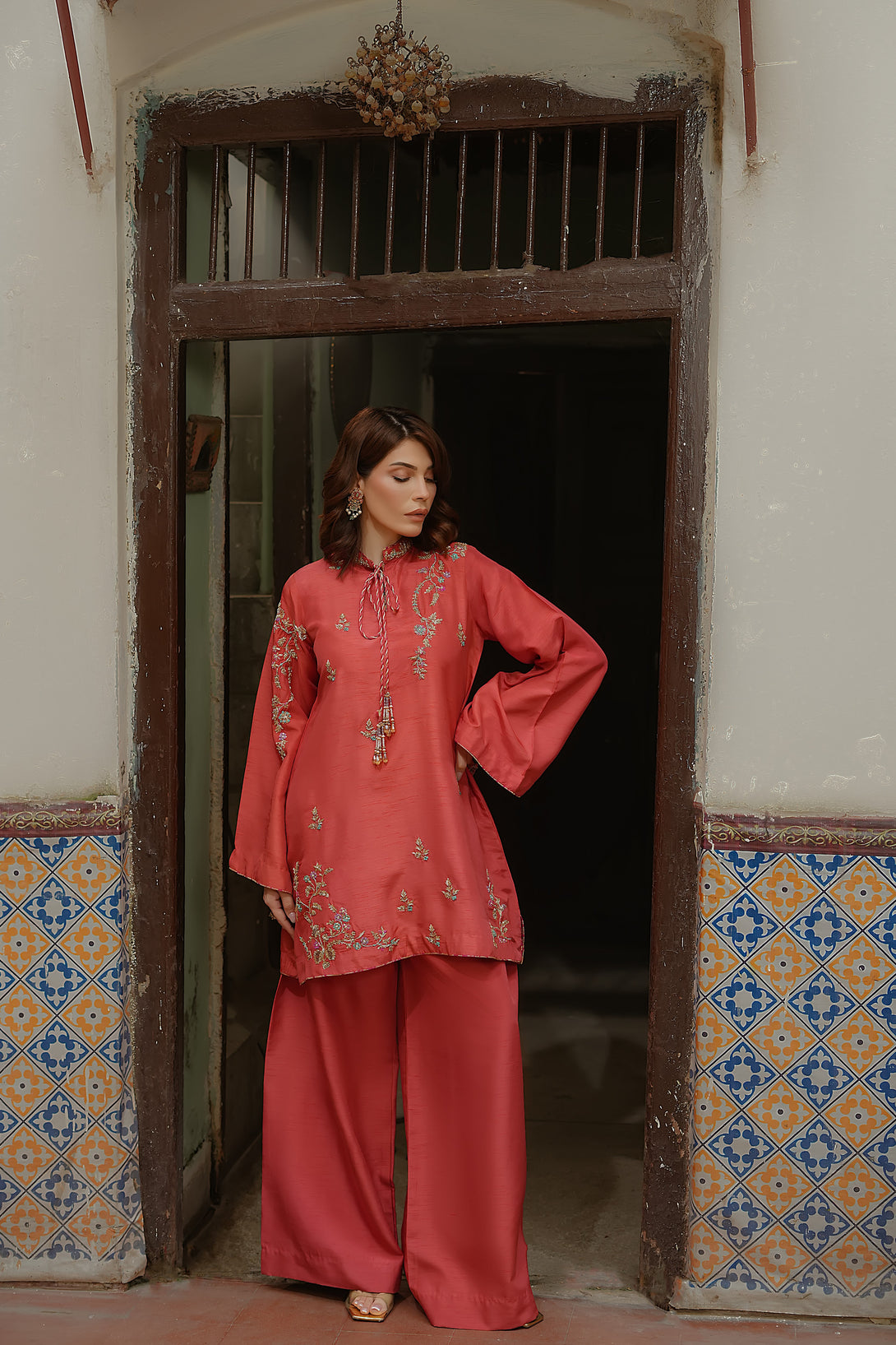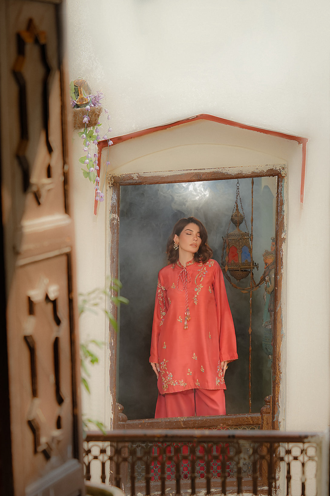 A graceful two-piece ensemble in coral Korean raw silk, featuring intricate resham, zardozi, and beadwork that adds rich texture and depth. The short shirt paired with flared pants and delicate tassel details creates an effortlessly elegant look, perfect for festive soirées.