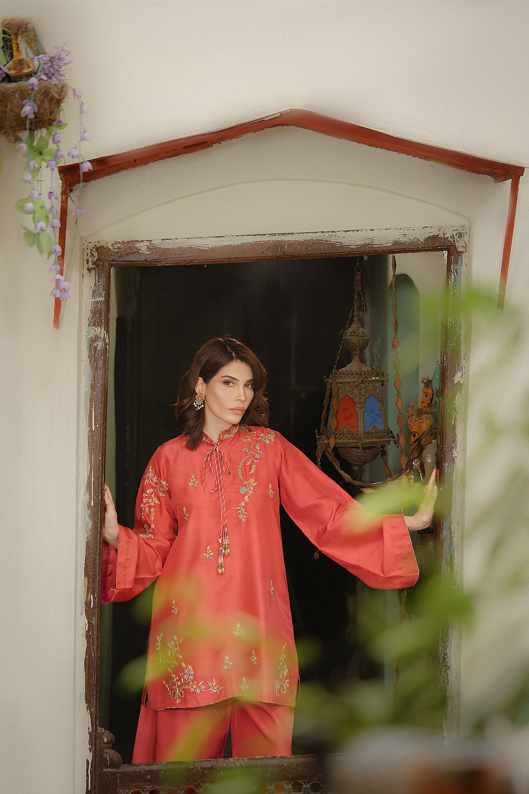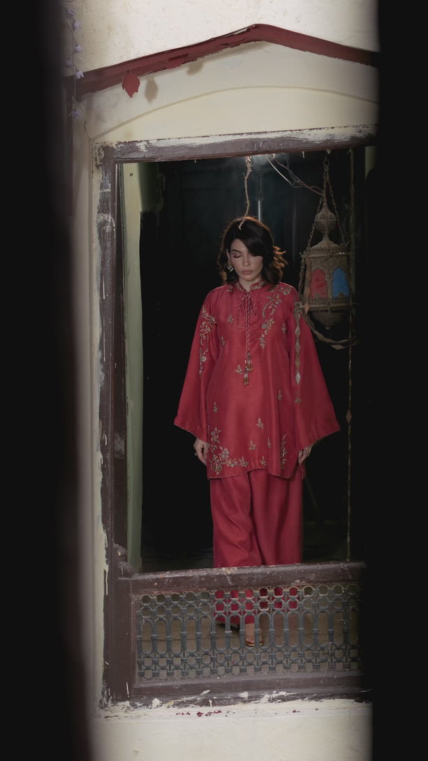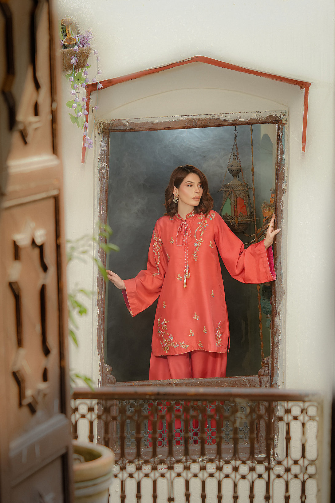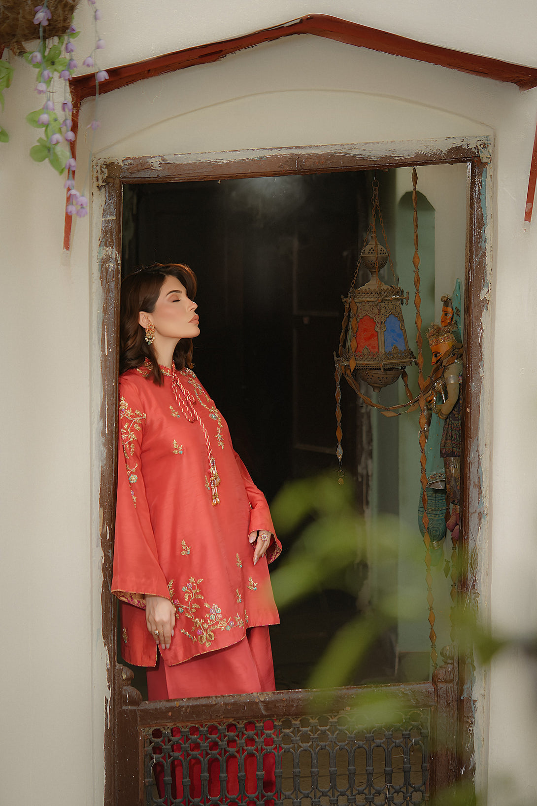 A graceful two-piece ensemble in coral Korean raw silk, featuring intricate resham, zardozi, and beadwork that adds rich texture and depth. The short shirt paired with flared pants and delicate tassel details creates an effortlessly elegant look, perfect for festive soirées.