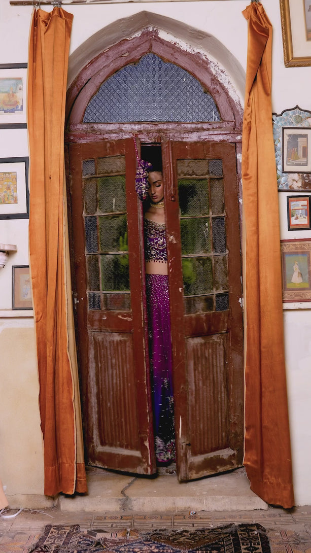 lehenga choli featuring intricate zardozi, resham, and bead embroidery on a rich magenta-to-purple ombré base, completed with a graceful mukesh net dupatta, perfect for festive and celebratory occasions.